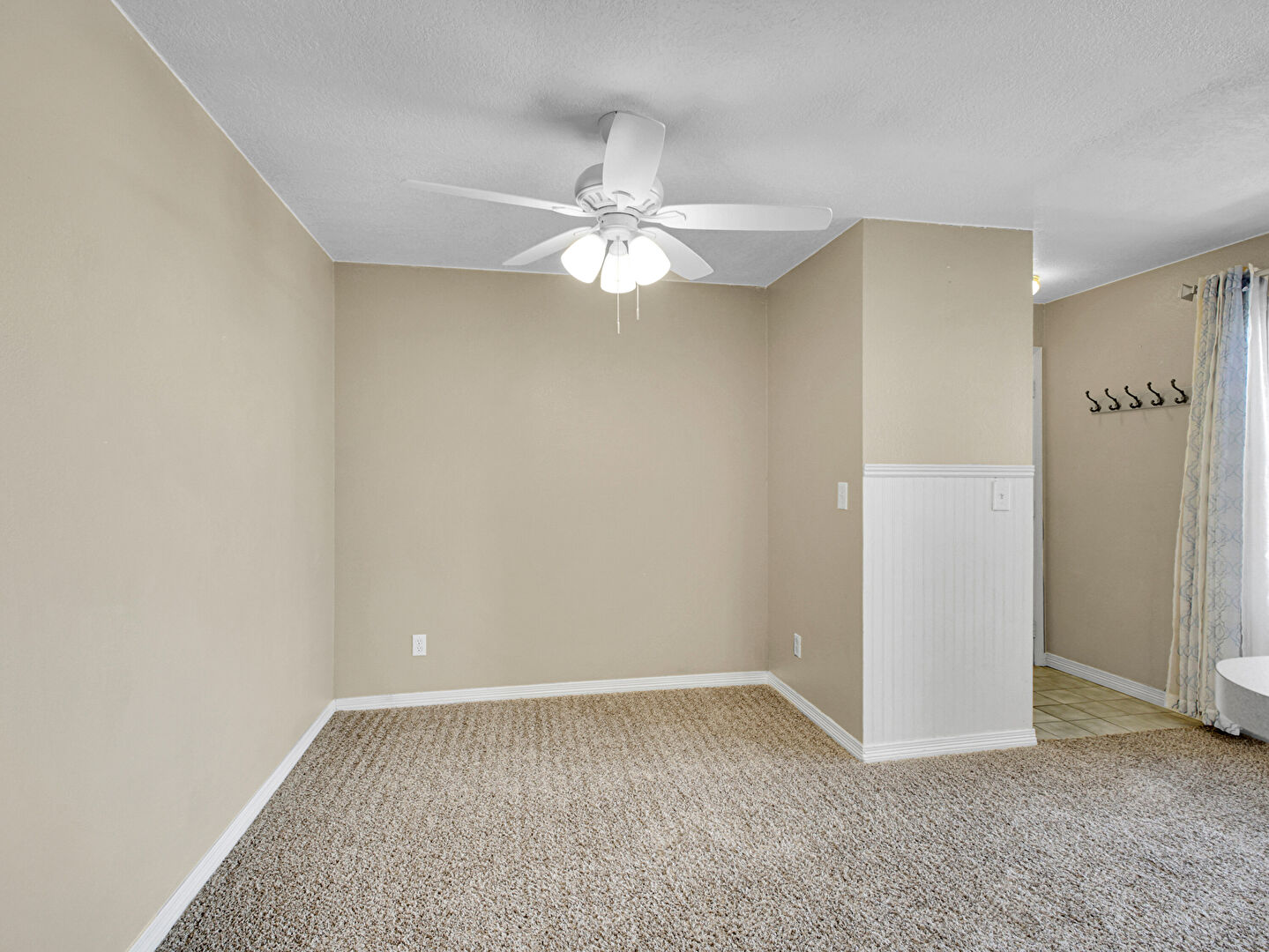 Baseboards Wall, Carpet, Ceiling Fan, Drywall, Natural Light, Textured Ceiling, Vent, Wainscot Wall, Baseboards Wall, Drywall, Textured Wall