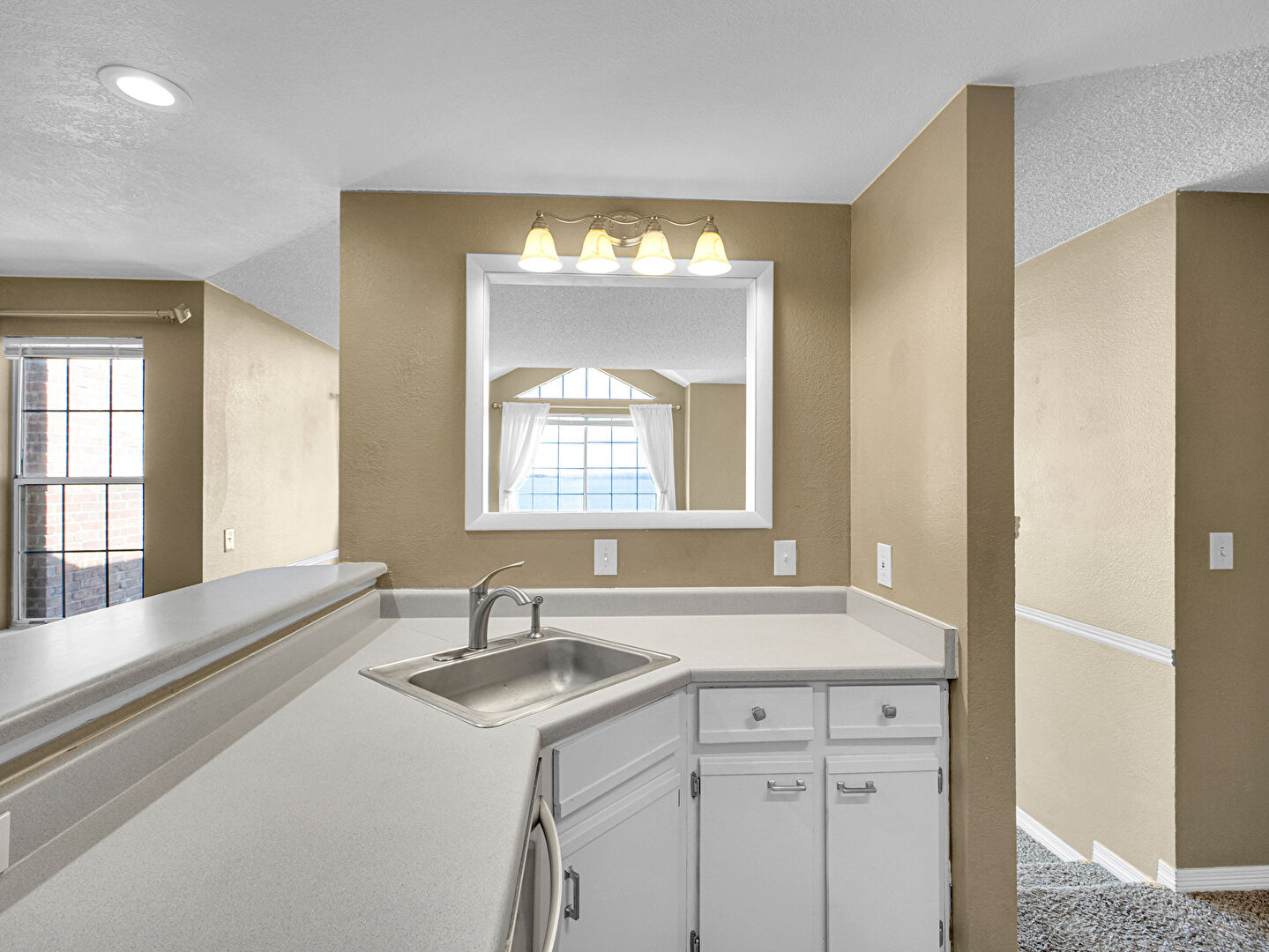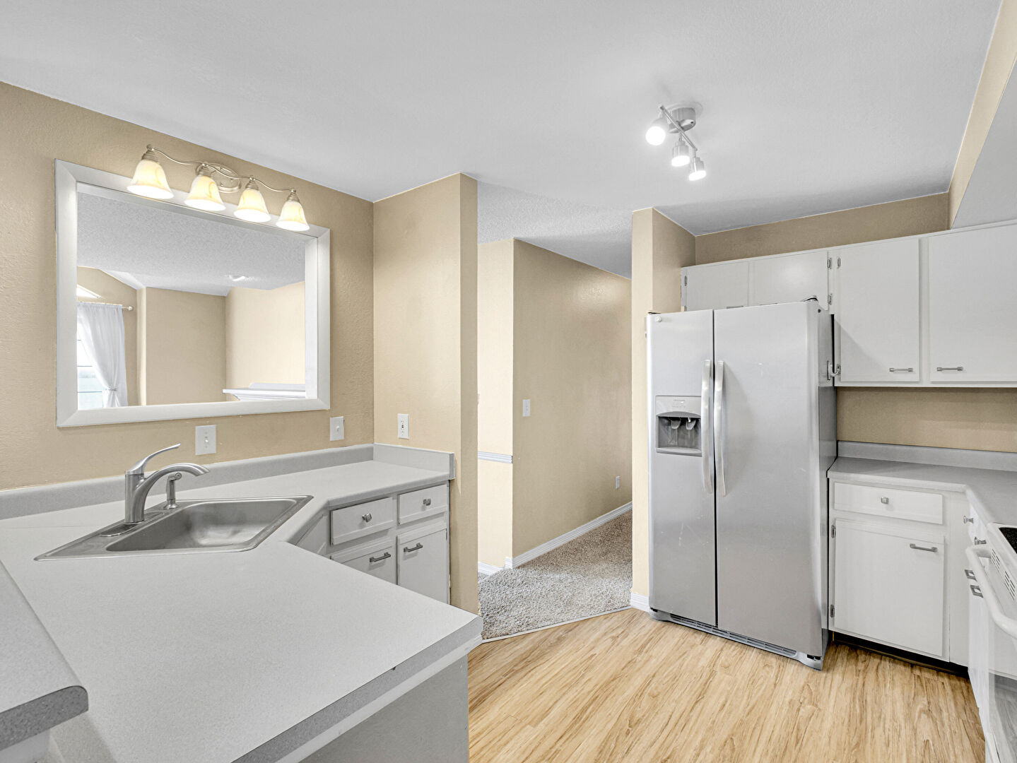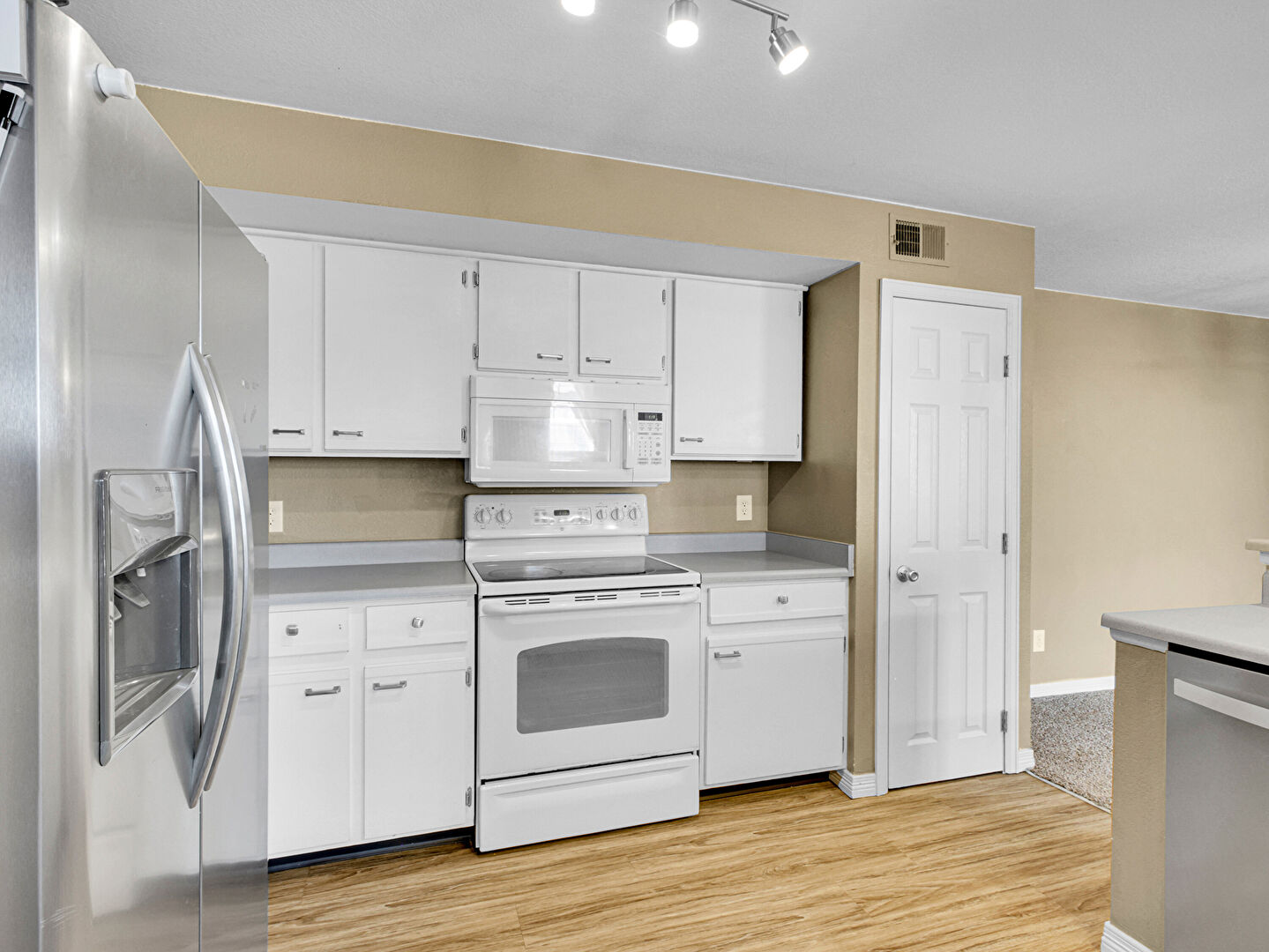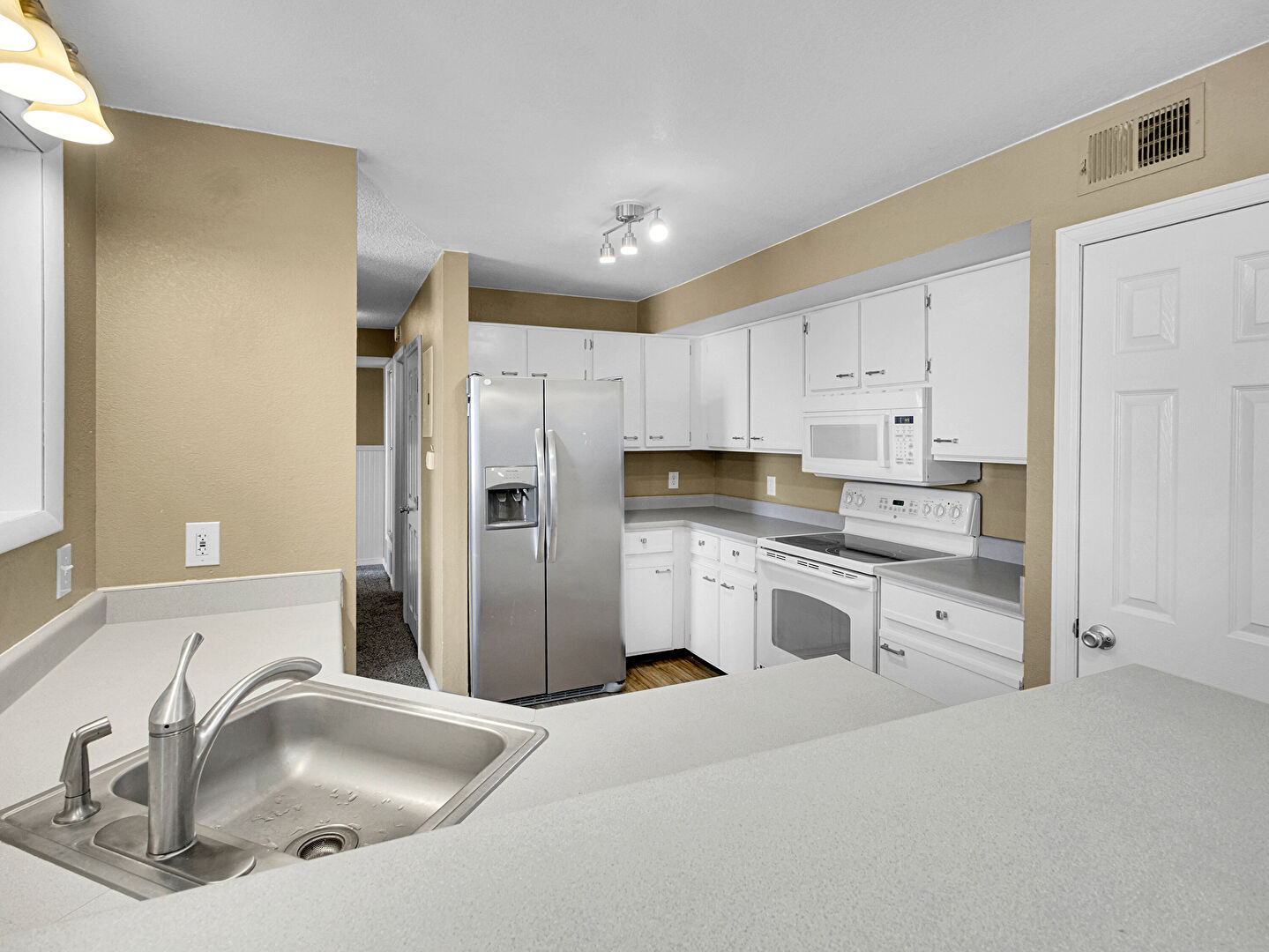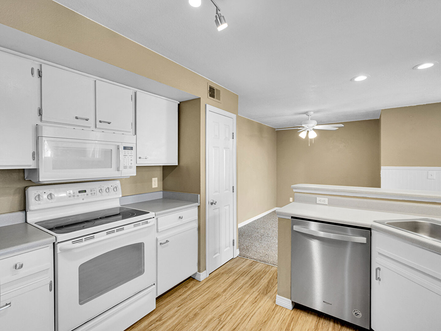 Baseboards Wall, Carpet, Ceiling Fan, Drywall, Kitchen Peninsula, Natural Light, Pass Through Window, Pendant Lighting, Recessed Lighting, Textured Ceiling, Textured Wall, U Shaped Kitchen, Vent, Visible Hinge Cabinets, Wainscot Wall, Wood Finish Floor, Baseboards Wall, Drywall, Natural Light, Visible Hinge Cabinets, Wood Finish Floor