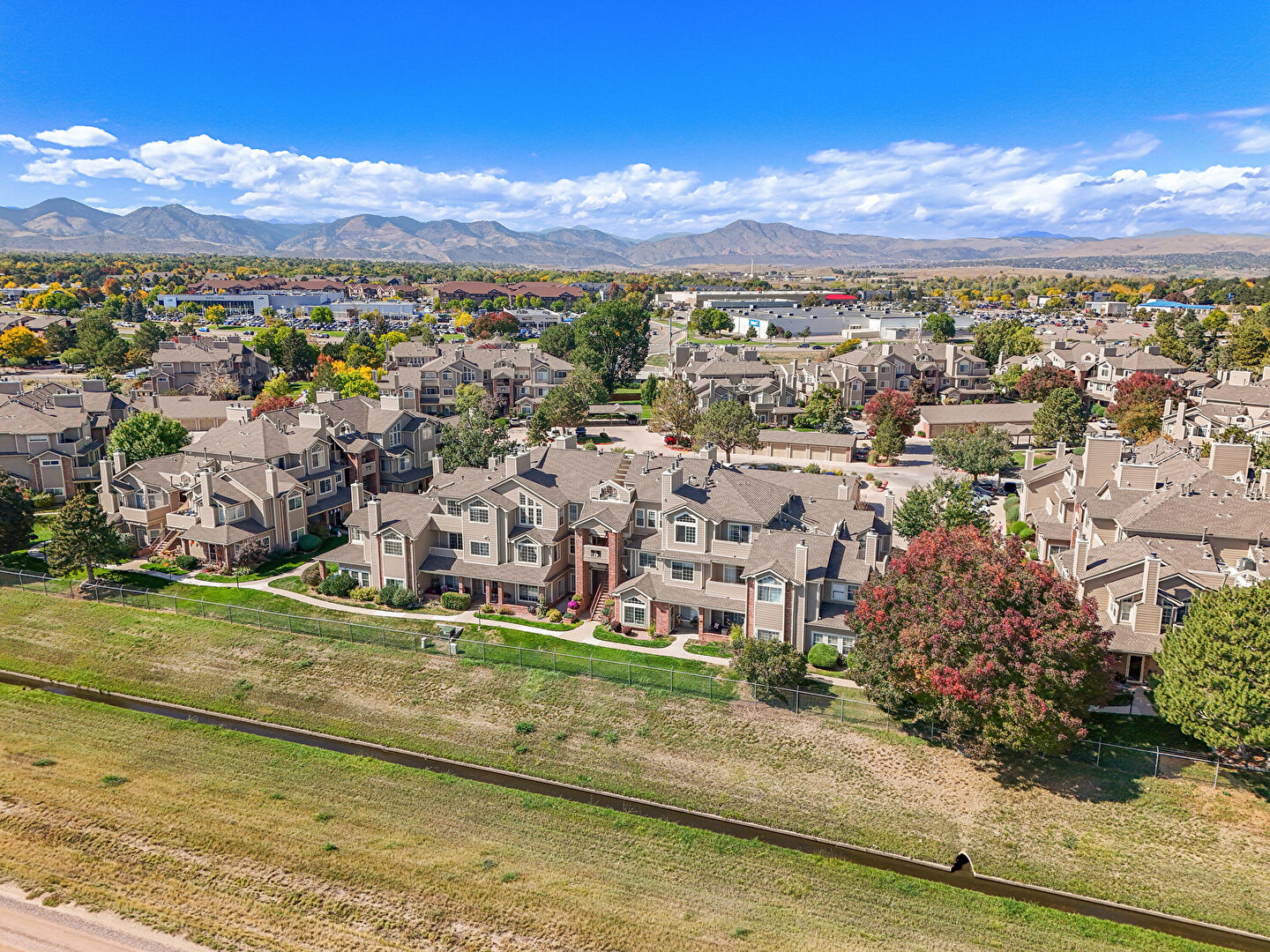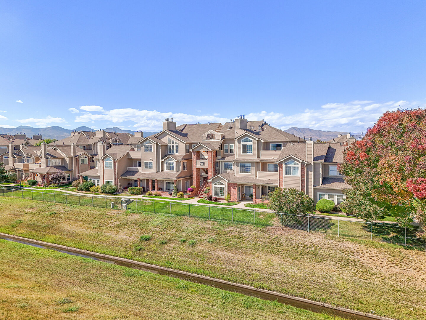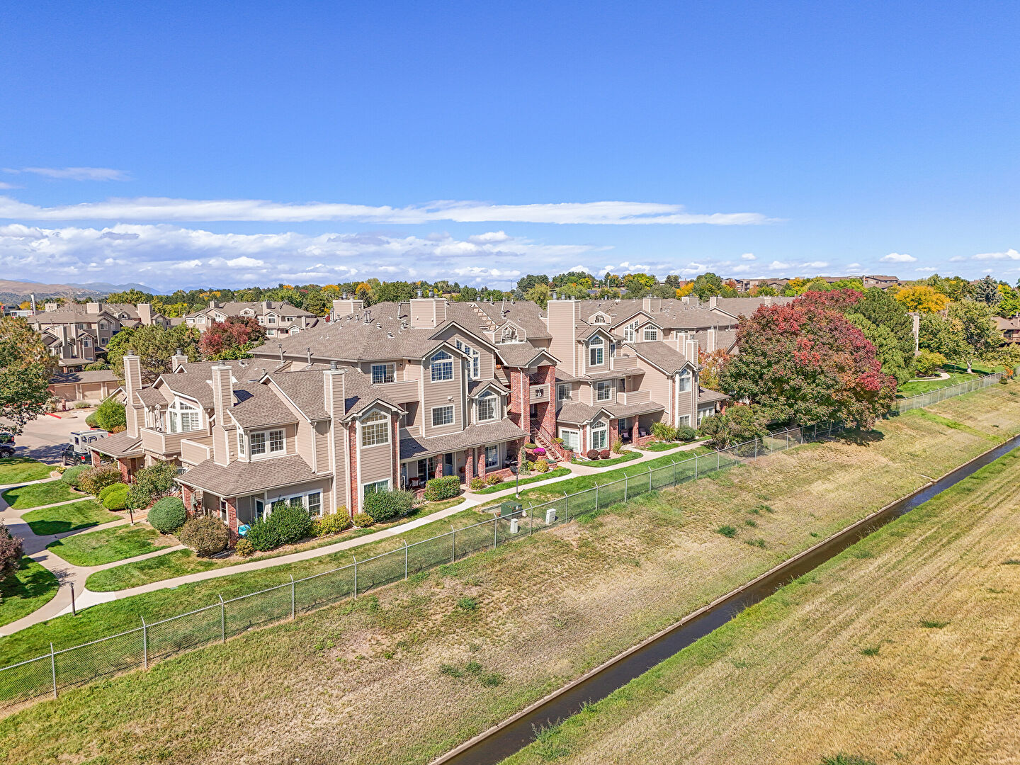 Balcony, Brick Siding, Chimney, Downspout, Fence, Gutters, Horizontal Siding, Lawn, Mountain View, Parking Lot, Residential View, Stairs, Horizontal Siding, Lawn, Residential View, Stoop