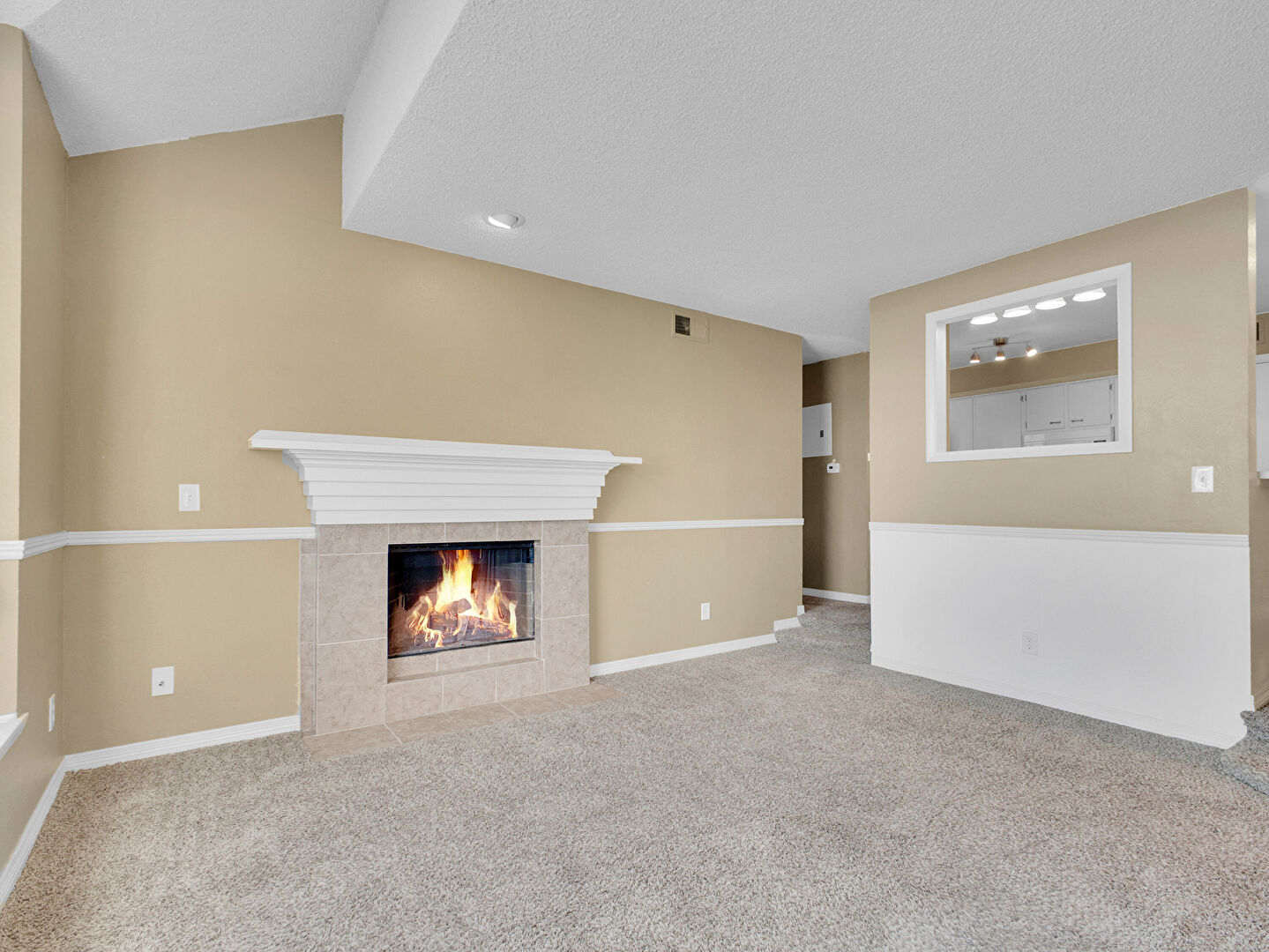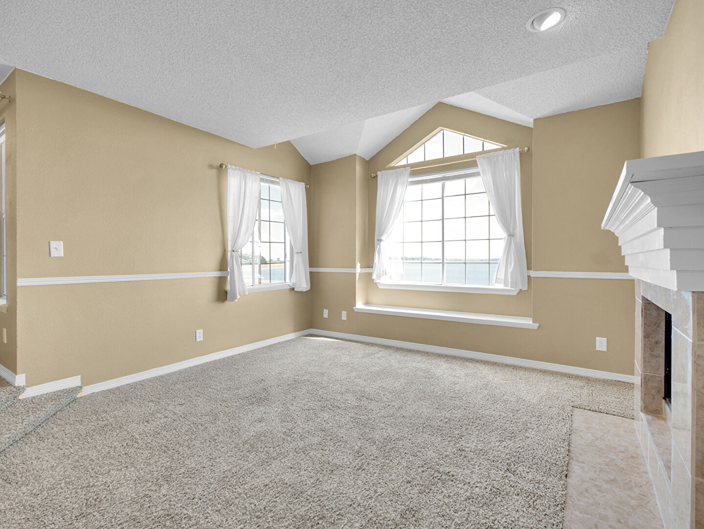 Baseboards Wall, Carpet, Drywall, Fireplace, Natural Light, Recessed Lighting, Textured Ceiling, Vaulted Ceiling, Vent, Drywall, Vent