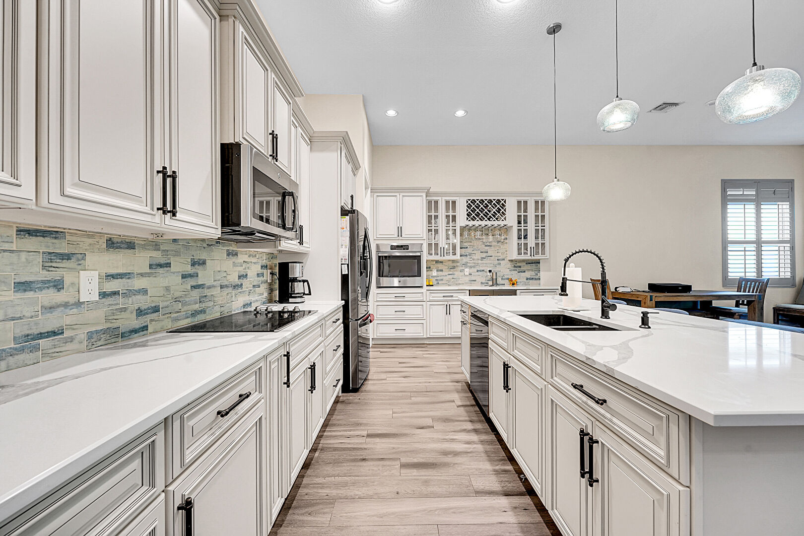 Baseboards Wall, Ceiling Fan, Drywall, French Doors, L Shaped Kitchen, Natural Light, Recessed Lighting, Tile Wall, Tray Ceiling, Vent, Wine Cooler, Wood Finish Floor, Ceiling Fan, Drywall, Tile Wall, Tray Ceiling