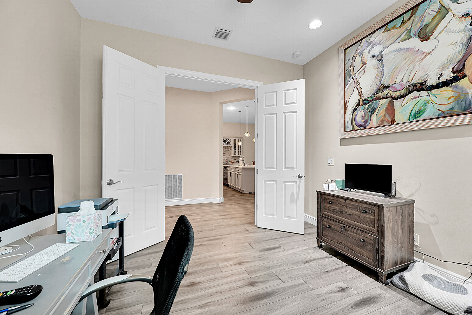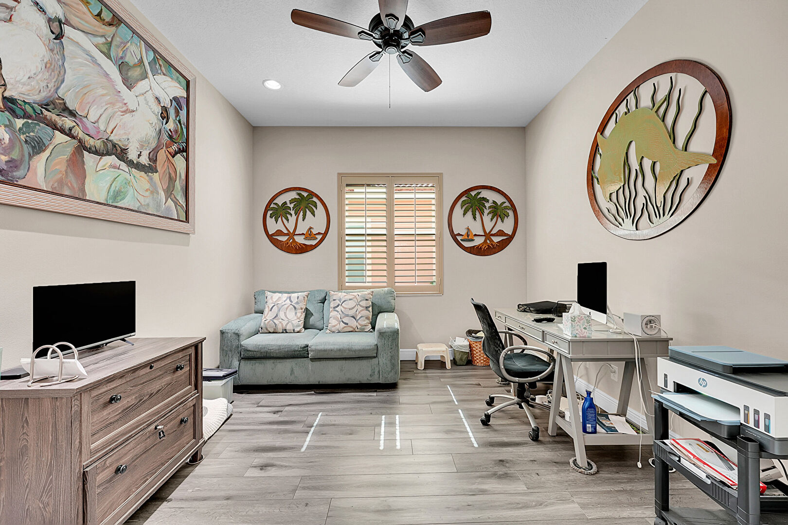 Baseboards Wall, Ceiling Fan, Drywall, Natural Light, Office Area, Recessed Lighting, Vent, Wood Finish Floor, Baseboards Wall, Wood Finish Floor