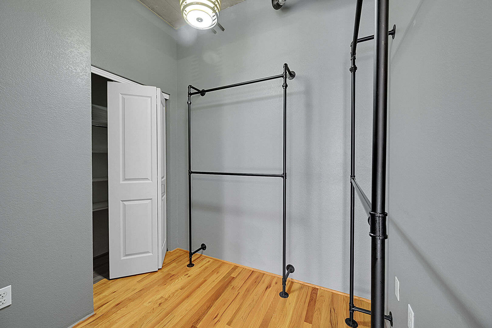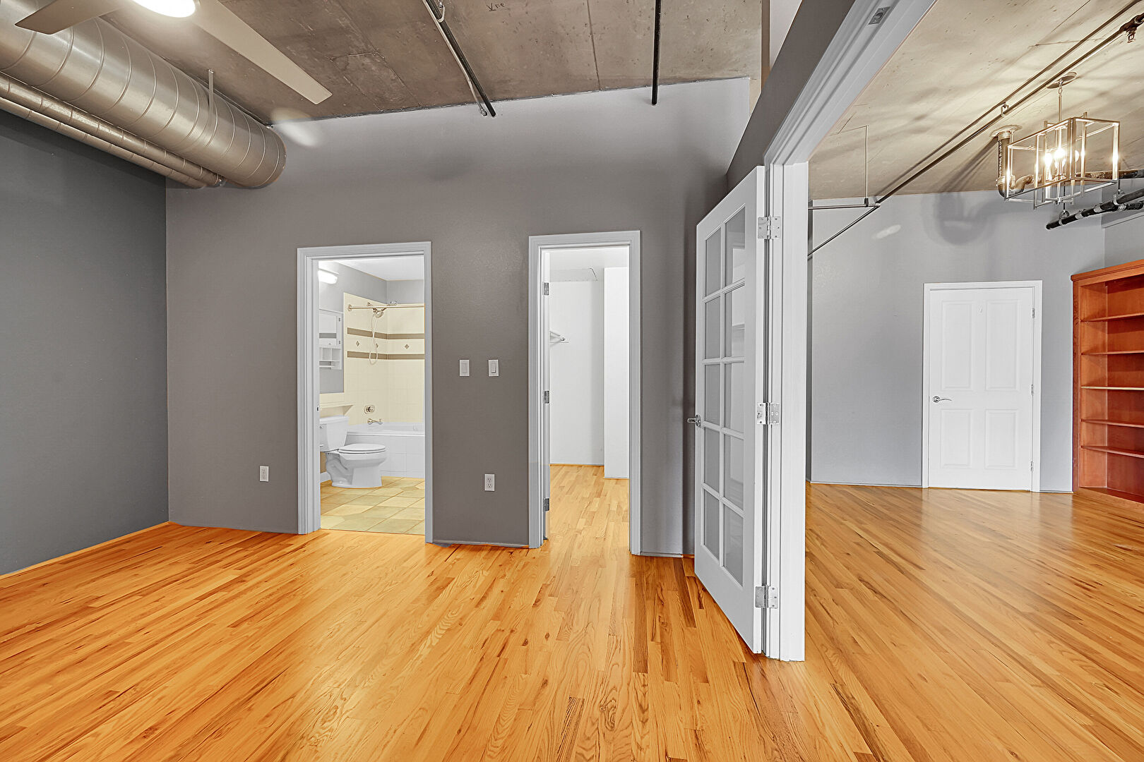 Baseboards Wall, Ceiling Fan, Concrete Ceiling, Drywall, French Doors, High Ceiling, Vent, Wood Finish Floor, Ceiling Fan, Notable Chandelier, Pendent Fire Sprinkler, Wood Finish Floor