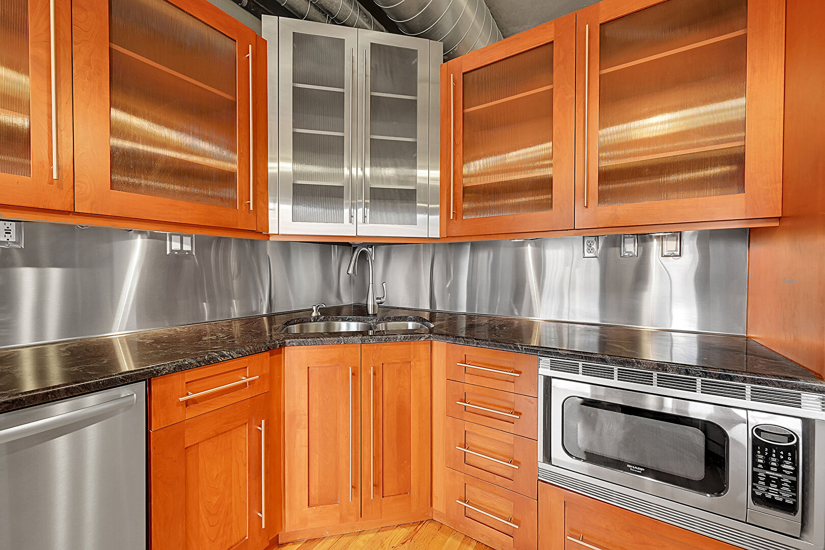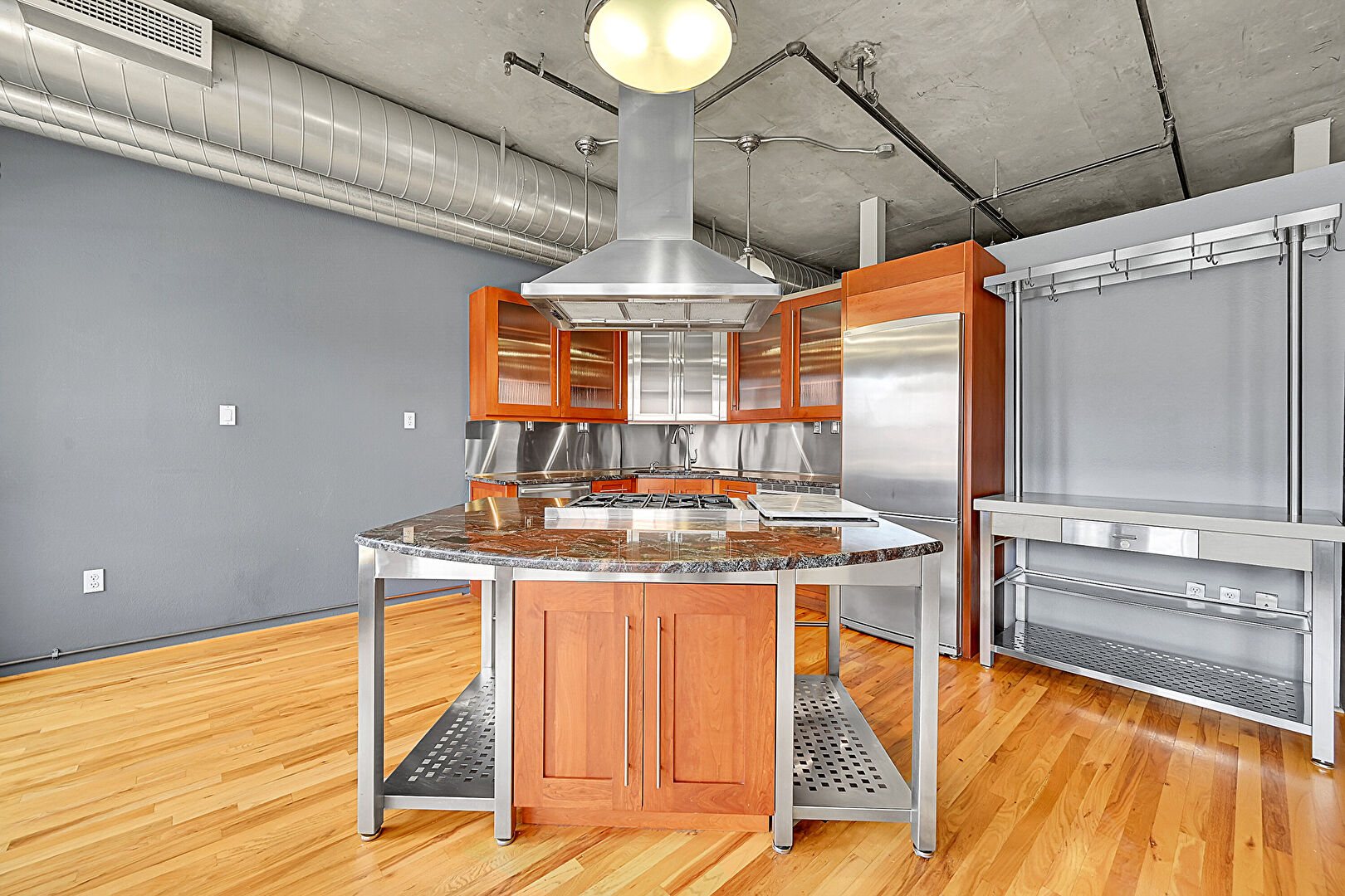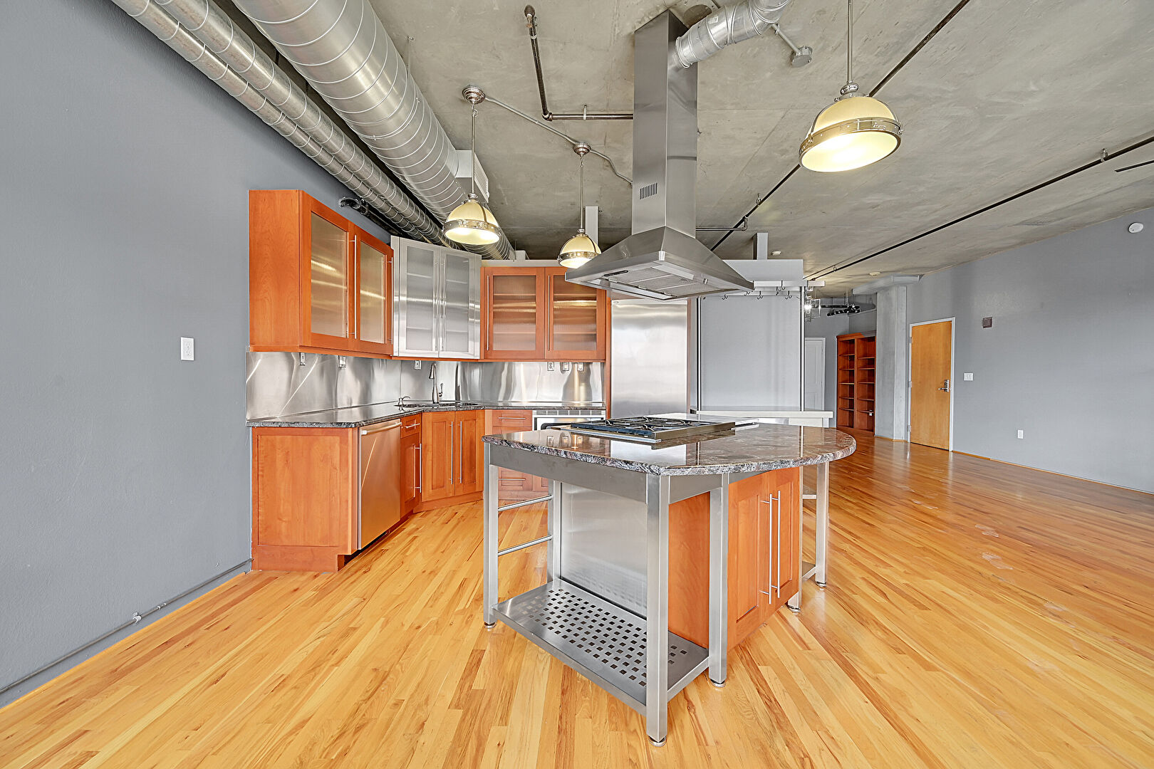 Ceiling Fan, City View, Concrete Ceiling, Drywall, Fireplace, Glass Insert Cabinets, Kitchen Bar, Kitchen Island, L Shaped Kitchen, Medium Brown Cabinets, Natural Light, Opens To Living Area, Pendant Lighting, Shaker Cabinets, Stone Countertops, Track Lighting, Vent, Wood Finish Floor, Baseboards Wall, Glass Insert Cabinets, Kitchen Island, Medium Brown Cabinets, Natural Light, Pendant Lighting, Shaker Cabinets, Stone Countertops