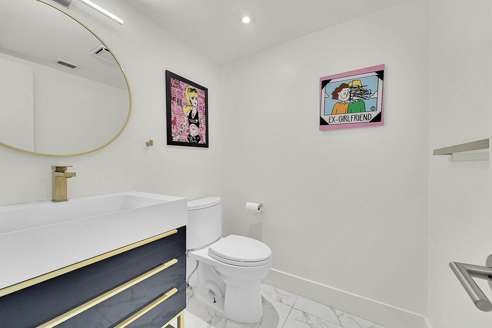 Baseboards Wall, Drywall, Half Bathroom, Recessed Lighting, Vanity, Vent, Marble Finish Floor
