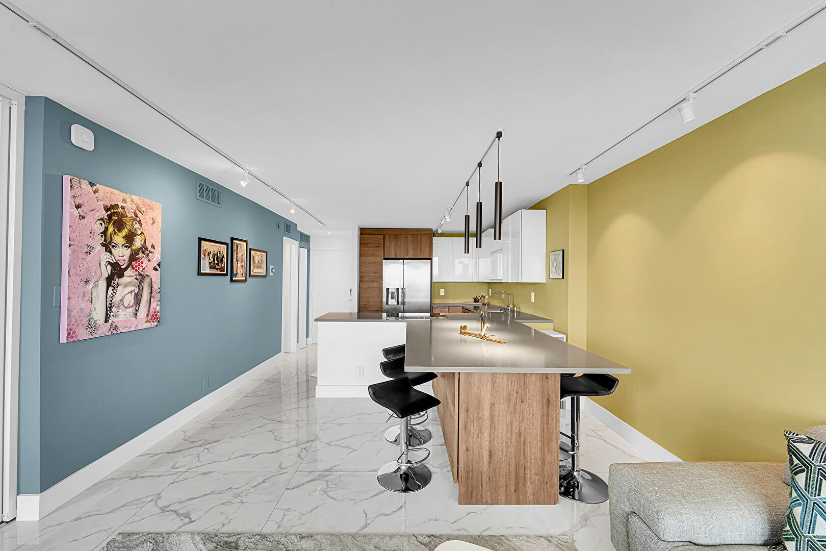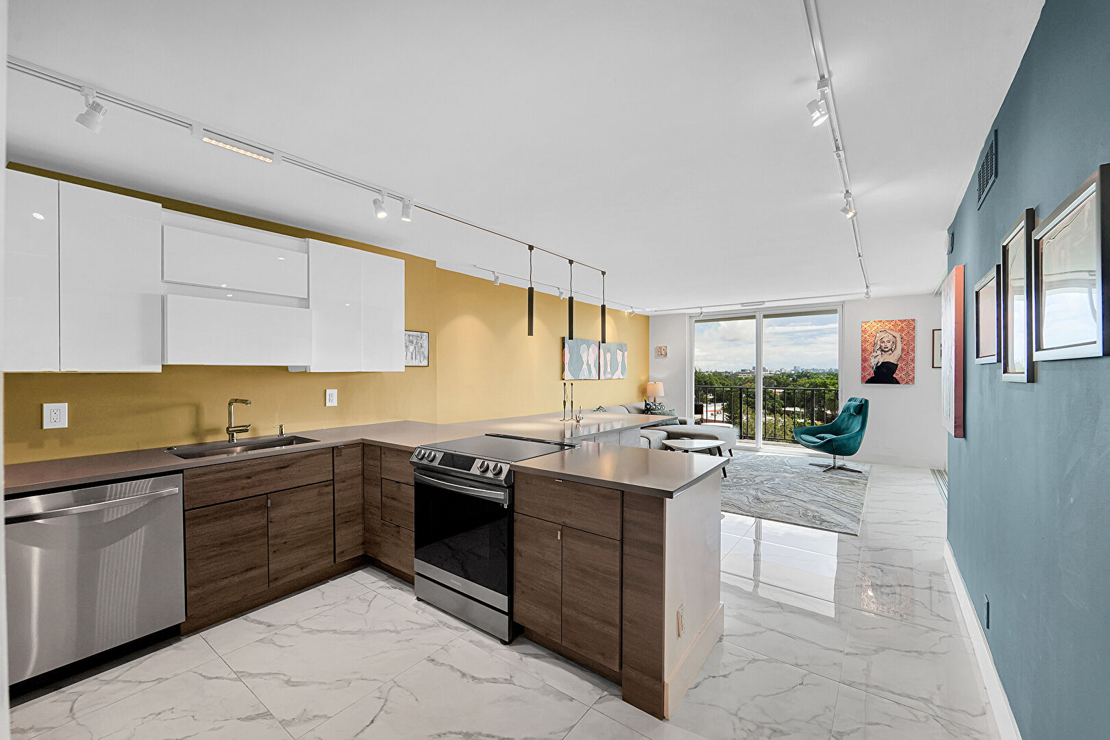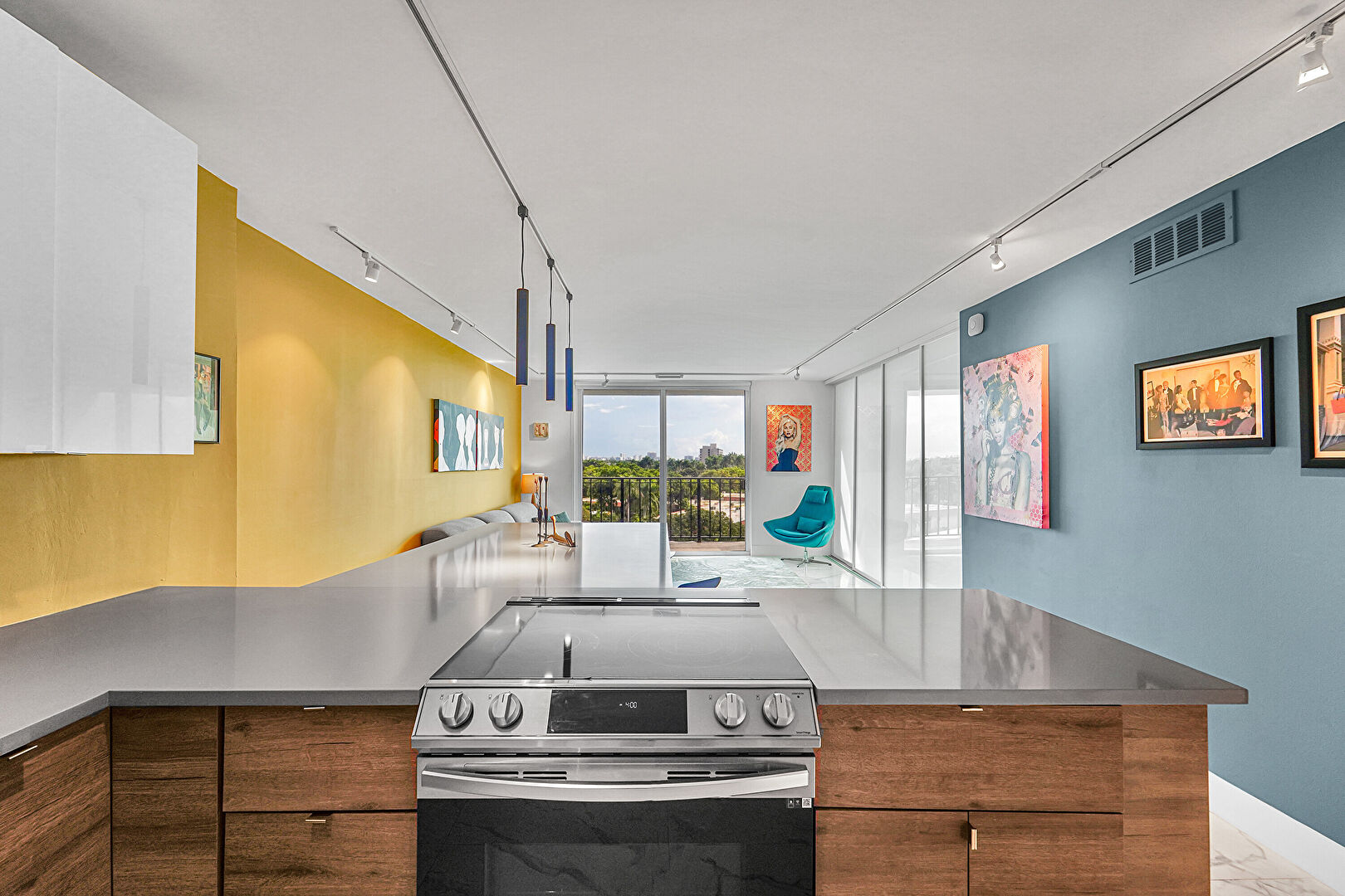 Baseboards Wall, Dark Brown Cabinets, Drywall, Flat Panel Cabinets, Floor Ceiling Windows, Marble Finish Floor, Medium Brown Cabinets, Natural Light, Opens To Living Area, Pendant Lighting, Stone Countertops, Track Lighting, Vent, Kitchen Peninsula