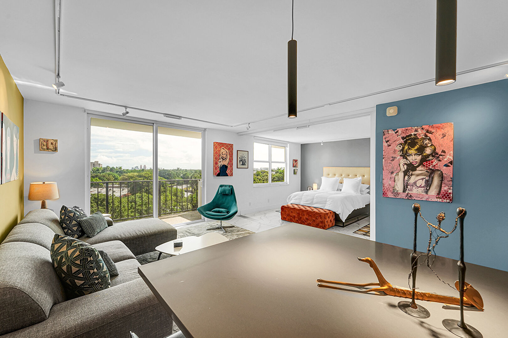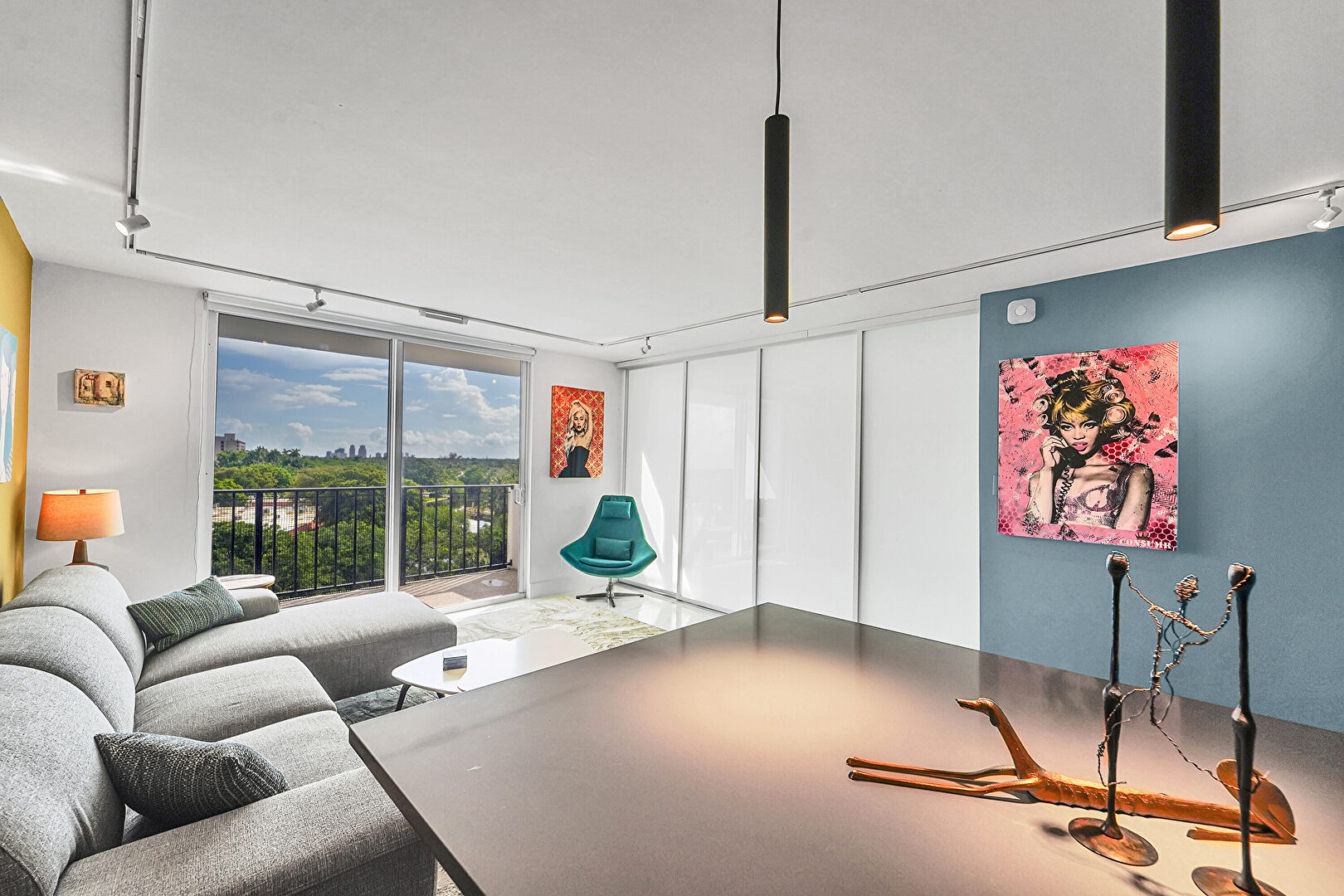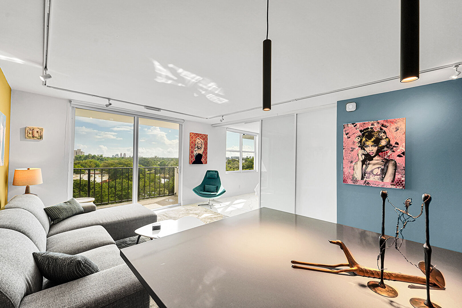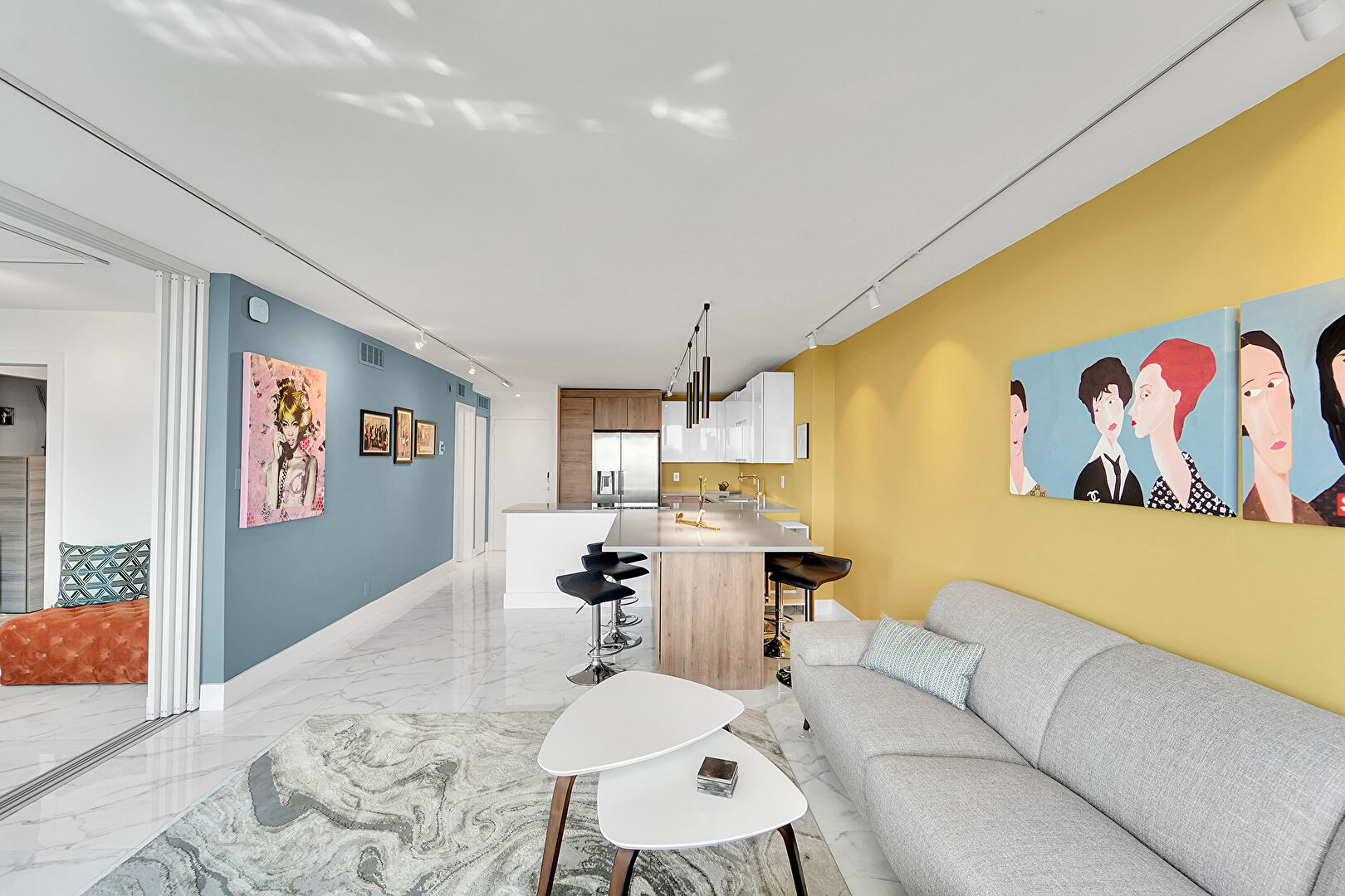 Baseboards Wall, Dark Brown Cabinets, Drywall, Flat Panel Cabinets, Floor Ceiling Windows, Marble Finish Floor, Medium Brown Cabinets, Natural Light, Opens To Living Area, Pendant Lighting, Stone Countertops, Track Lighting, Vent, Kitchen Peninsula