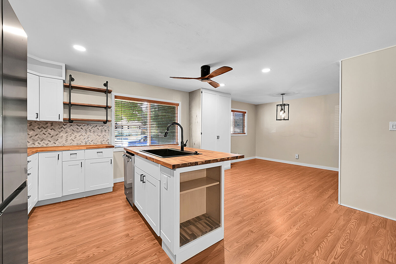 Baseboards Wall, Butcher Block Countertops, Ceiling Fan, Drywall, Kitchen Island, L Shaped Kitchen, Natural Light, Open Shelves, Opens To Living Area, Pendant Lighting, Recessed Lighting, Shaker Cabinets, Wine Cooler, Wood Finish Floor, Drywall, Kitchen Bar, Open Shelves, Pendant Lighting, Recessed Lighting