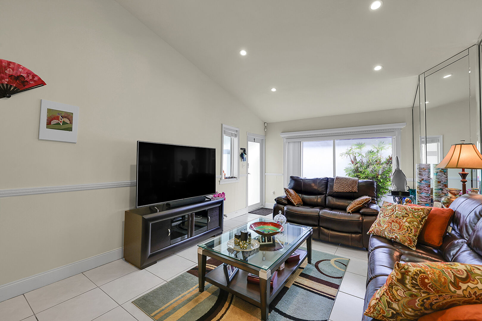 Baseboards Wall, Ceiling Fan, Drywall, High Ceiling, Natural Light, Recessed Lighting, Tile Floor, Vaulted Ceiling, Vent, Ceiling Fan, Drywall, Natural Light, Tile Floor