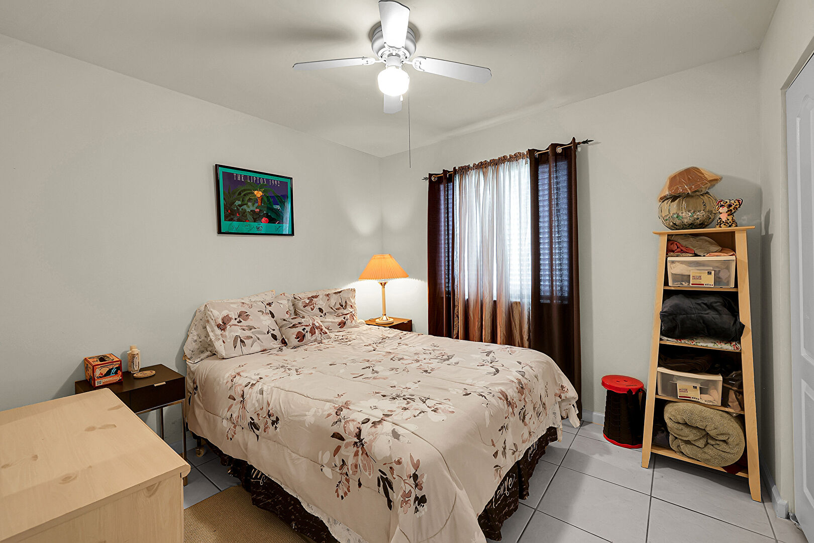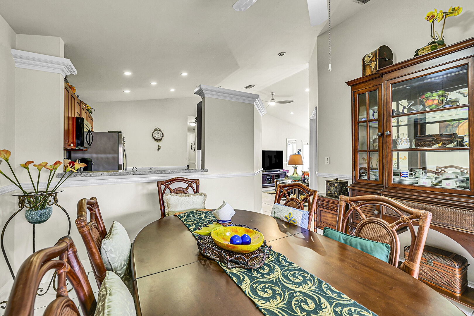 Ceiling Fan, Crown Molding, Drywall, Natural Light, Tile Floor, Vaulted Ceiling, Baseboards Wall, Recessed Lighting
