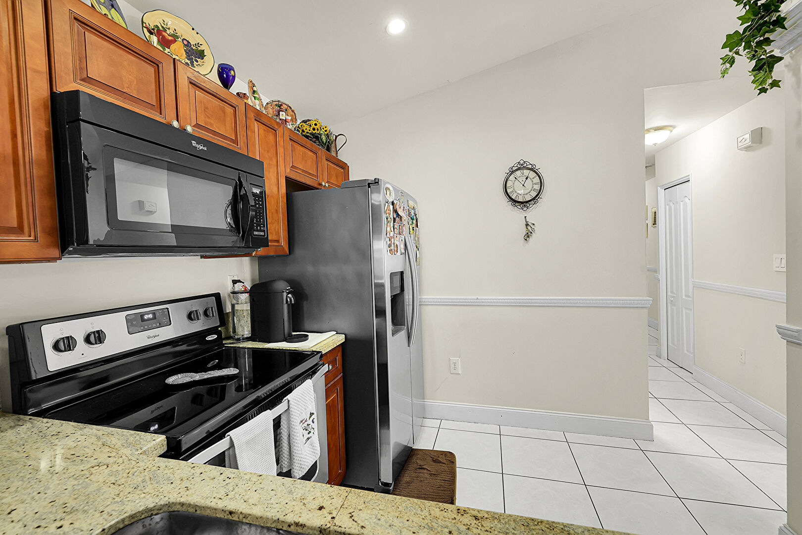 Drywall, Medium Brown Cabinets, Natural Light, Pass Through Window, Raised Cabinets, Recessed Lighting, Stone Countertops, Tile Floor, Toaster, Vaulted Ceiling, Baseboards Wall, Recessed Lighting