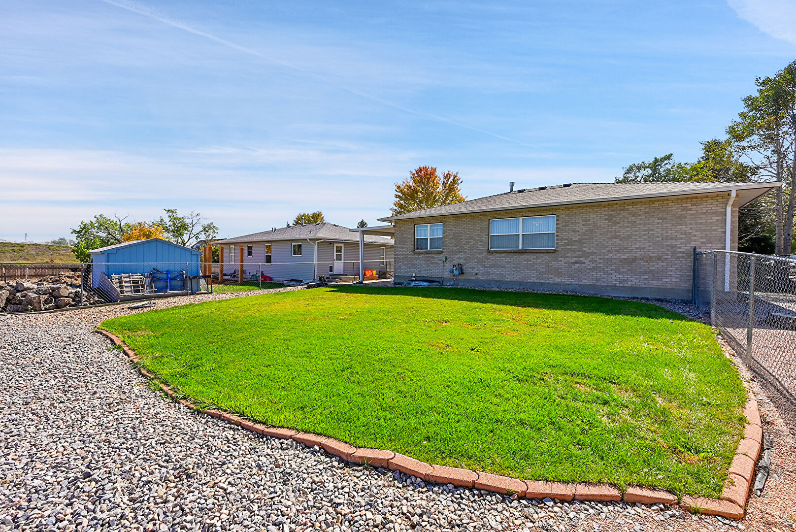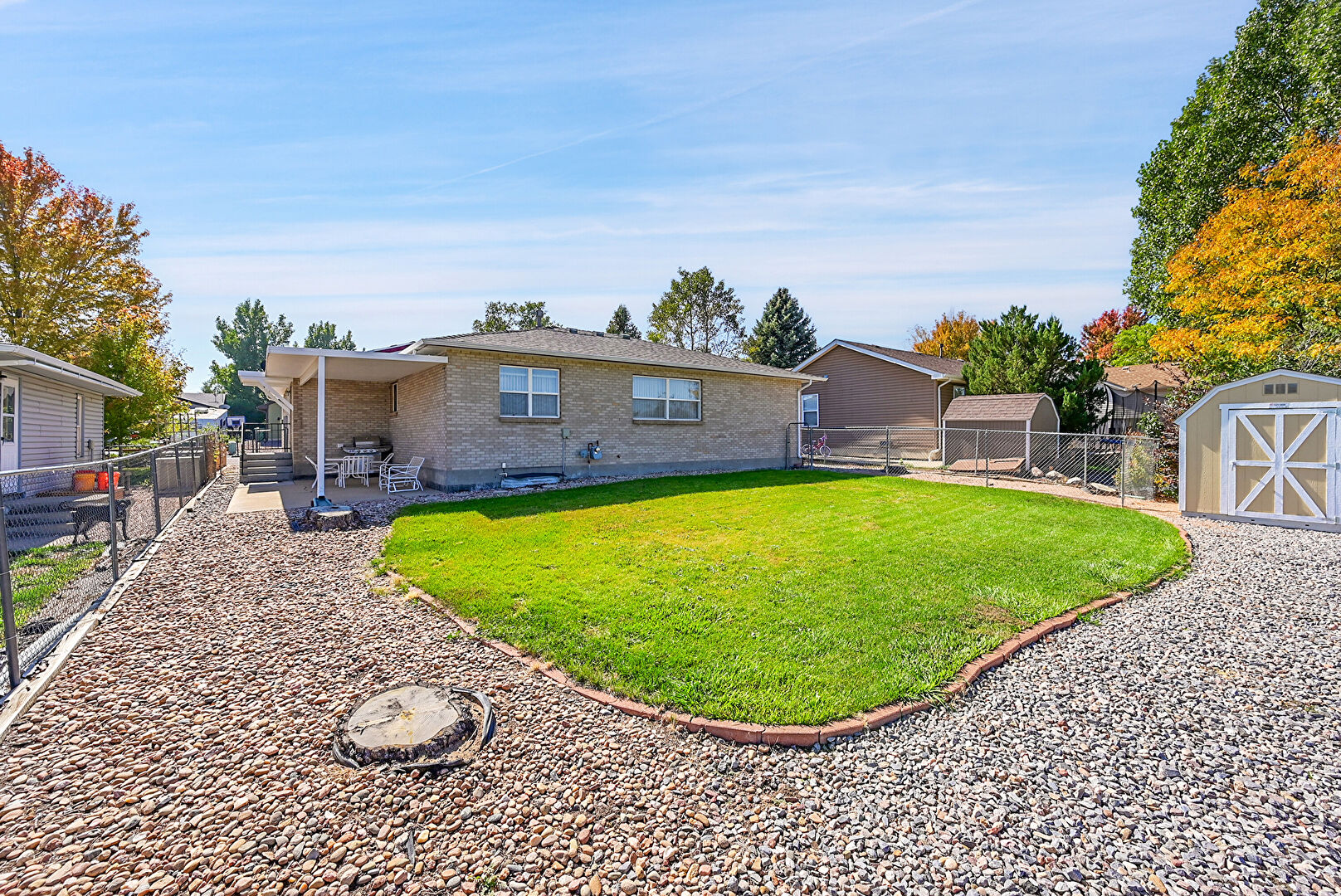 Brick Siding, Concrete Foundation, Fence, Outdoor Structure, Patio, Shed, Lawn