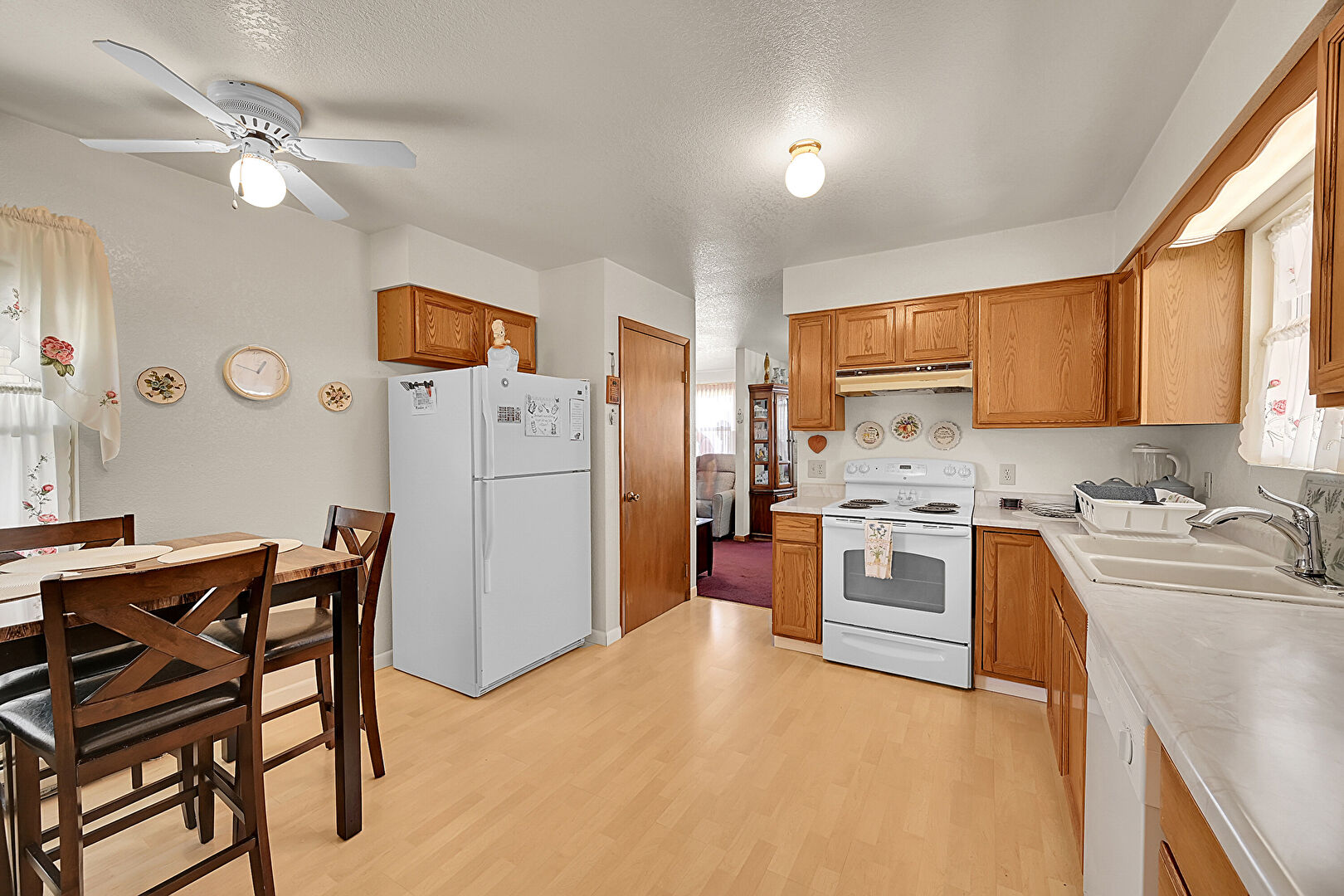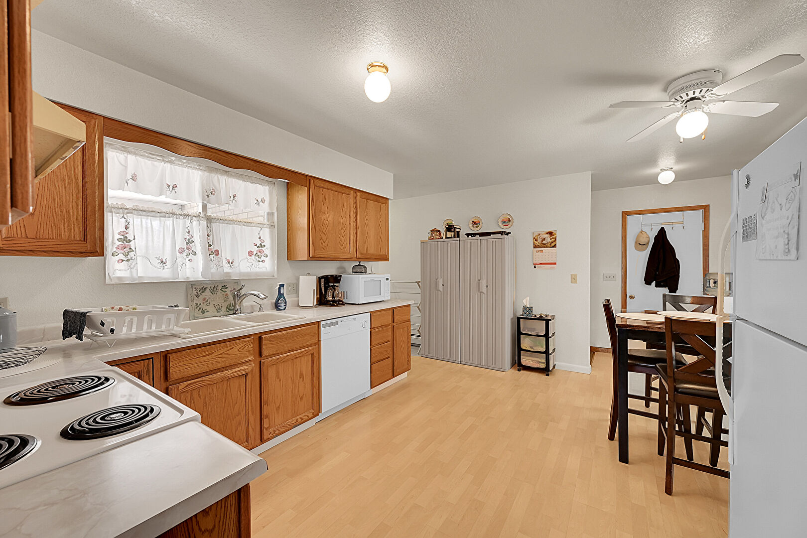 Baseboards Wall, Ceiling Fan, Drywall, Medium Brown Cabinets, Natural Light, Shaker Cabinets, Textured Ceiling, Wood Finish Floor, Ceiling Fan, Textured Ceiling