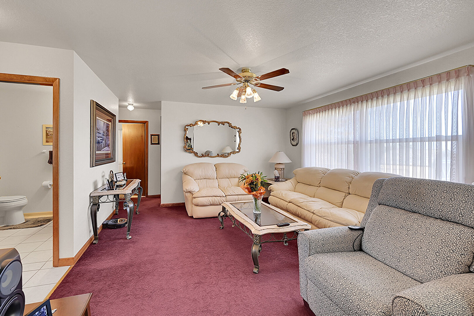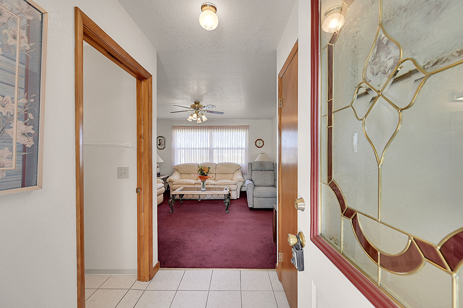 Baseboards Wall, Carpet, Ceiling Fan, Drywall, Natural Light, Textured Ceiling, Tile Floor, Baseboards Wall, Natural Light, Textured Ceiling