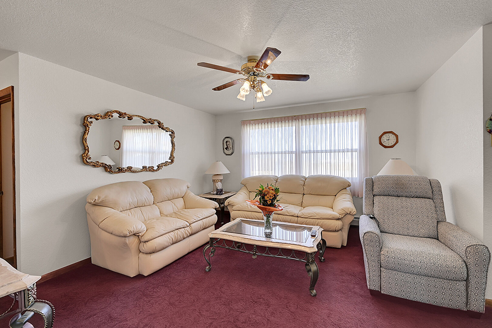 Baseboard Radiator, Baseboards Wall, Ceiling Fan, Drywall, Natural Light, Textured Ceiling, Carpet