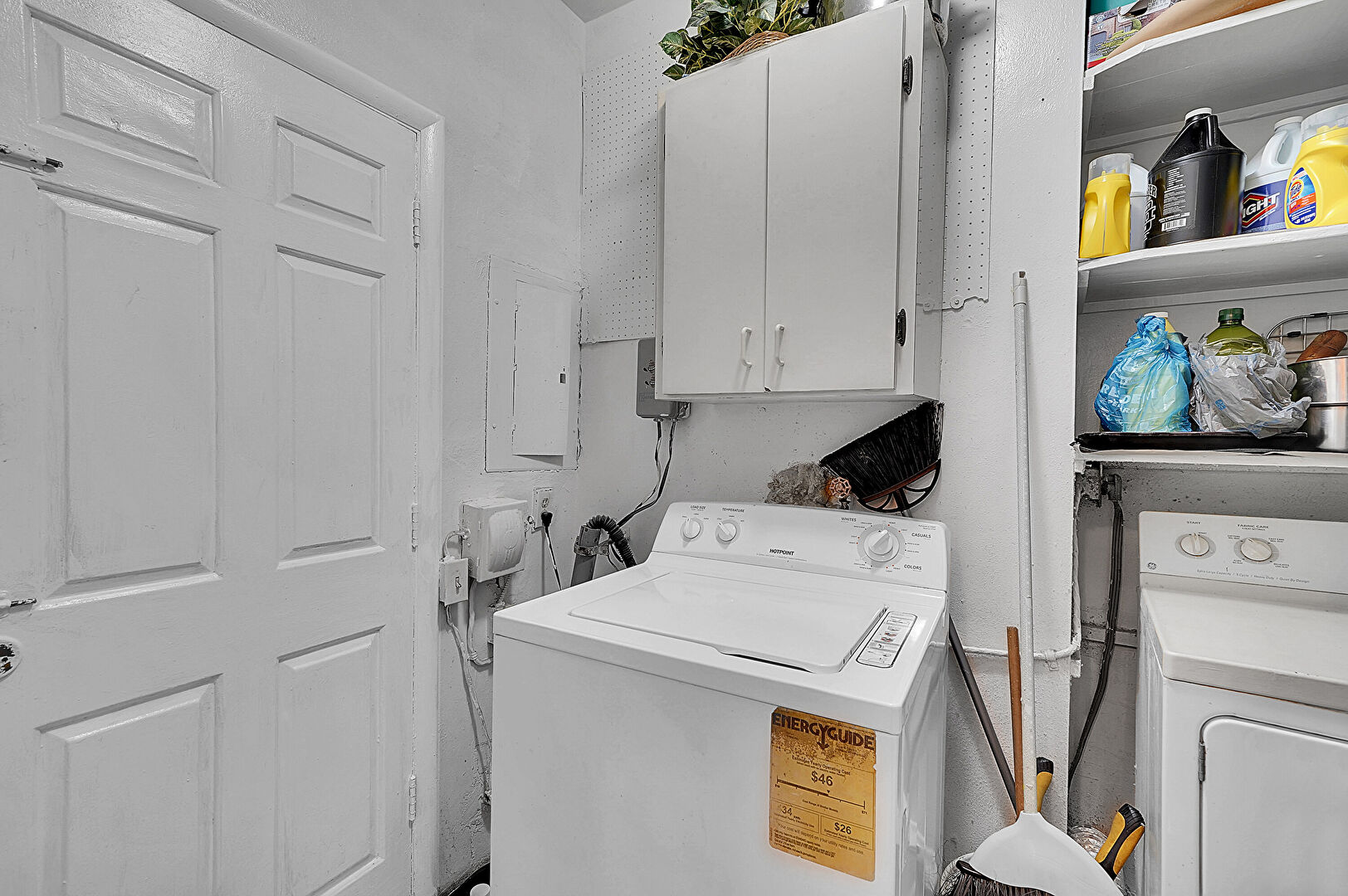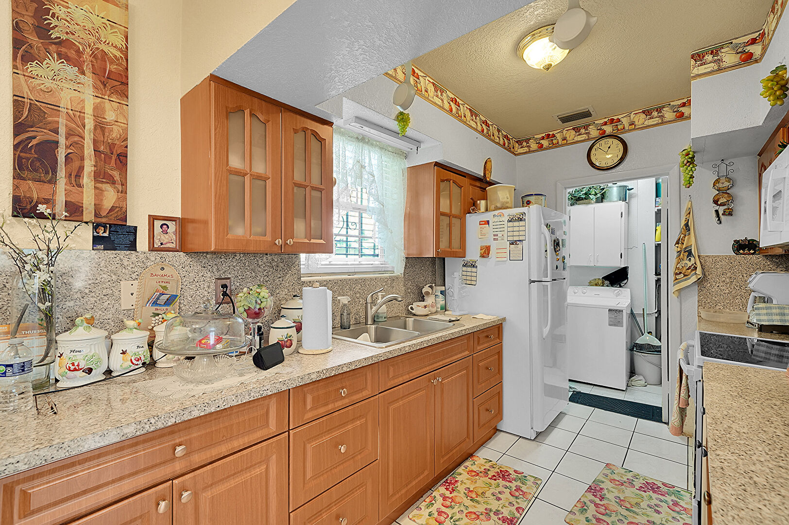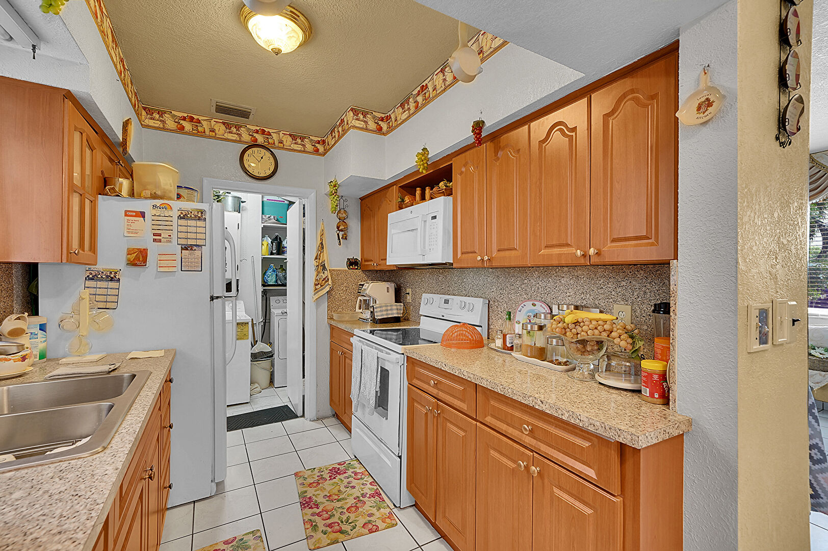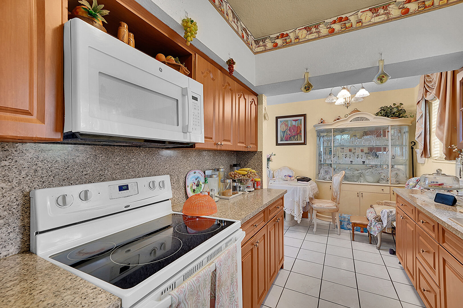 Arched Cabinets, Drywall, Glass Insert Cabinets, Laundry, Medium Brown Cabinets, Natural Light, Notable Chandelier, Raised Cabinets, Stone Countertops, Textured Ceiling, Tile Floor, Toaster, Vent, Washer Dryer, Medium Brown Cabinets, Natural Light, Open Shelves