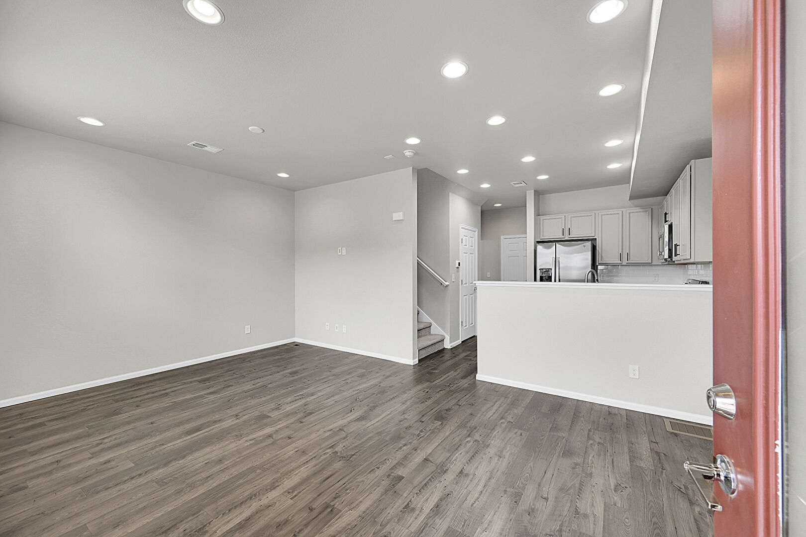 Drywall, Recessed Lighting, Stairs, U Shaped Kitchen, Vent, Wood Finish Floor, Baseboards Wall