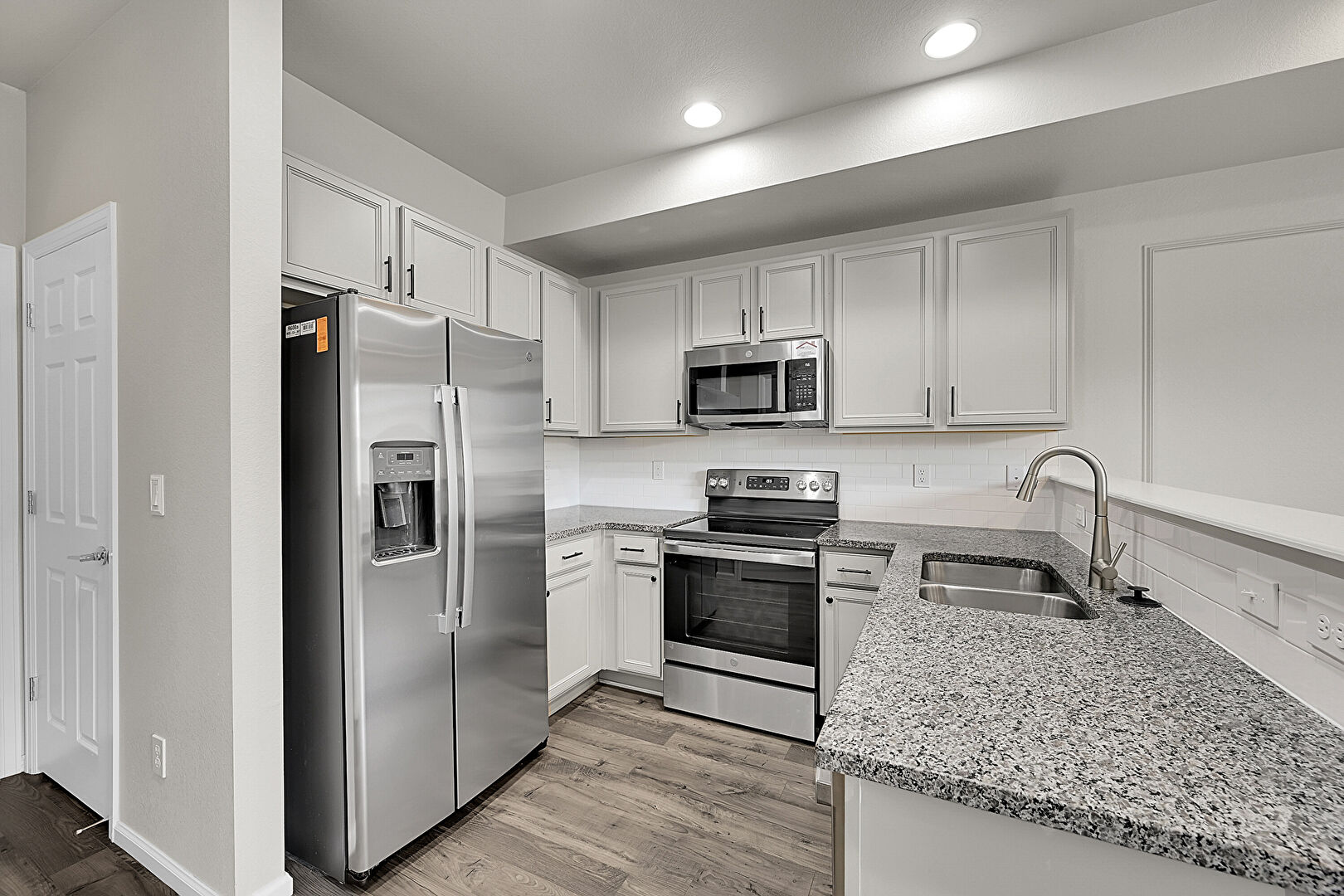 Baseboards Wall, Drywall, Kitchen Peninsula, Recessed Lighting, Shaker Cabinets, Stone Countertops, Wood Finish Floor, Kitchen Peninsula, U Shaped Kitchen