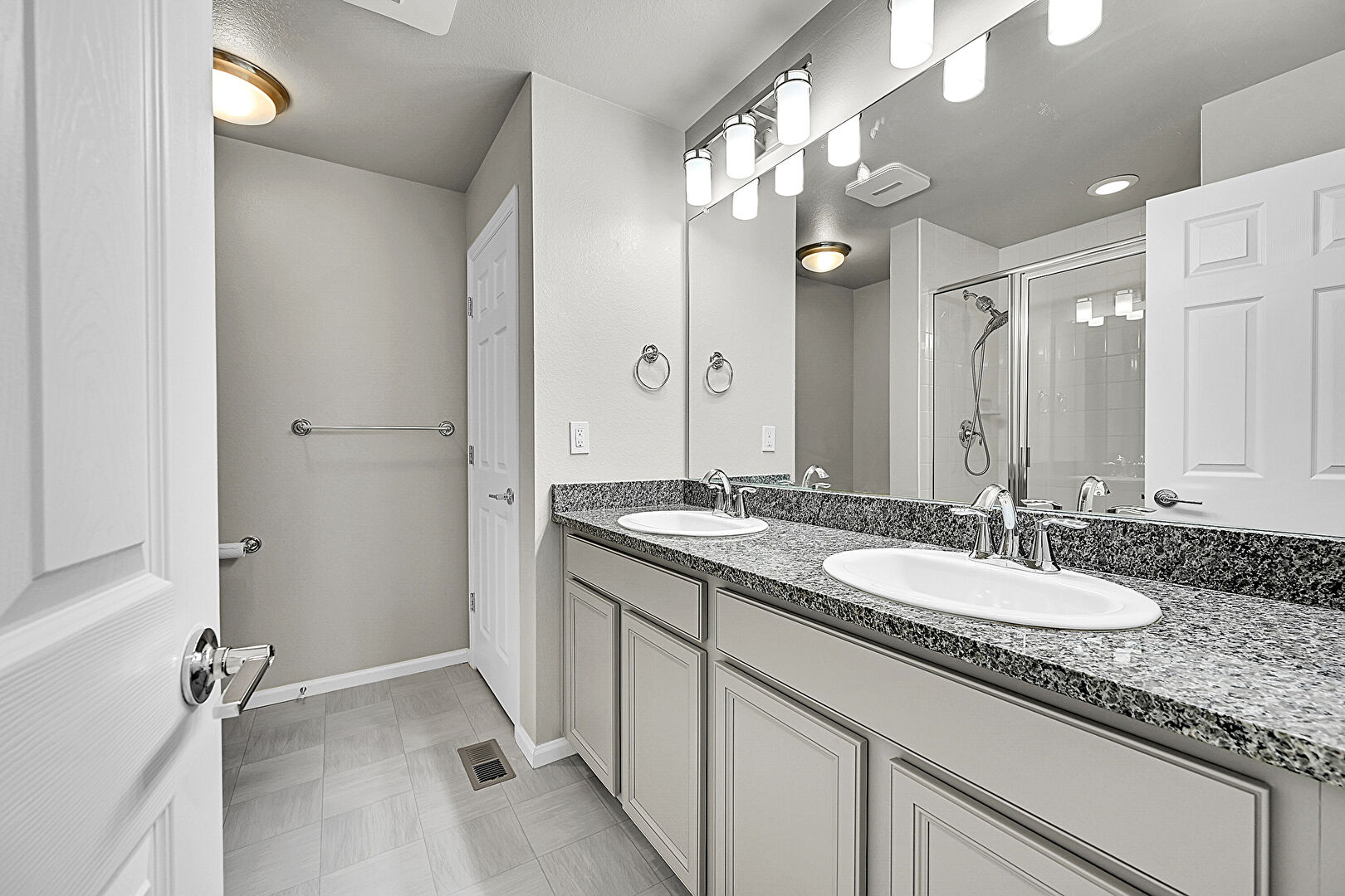 Baseboards Wall, Drywall, Full Bathroom, Tile Floor, Vent, Double Vanity