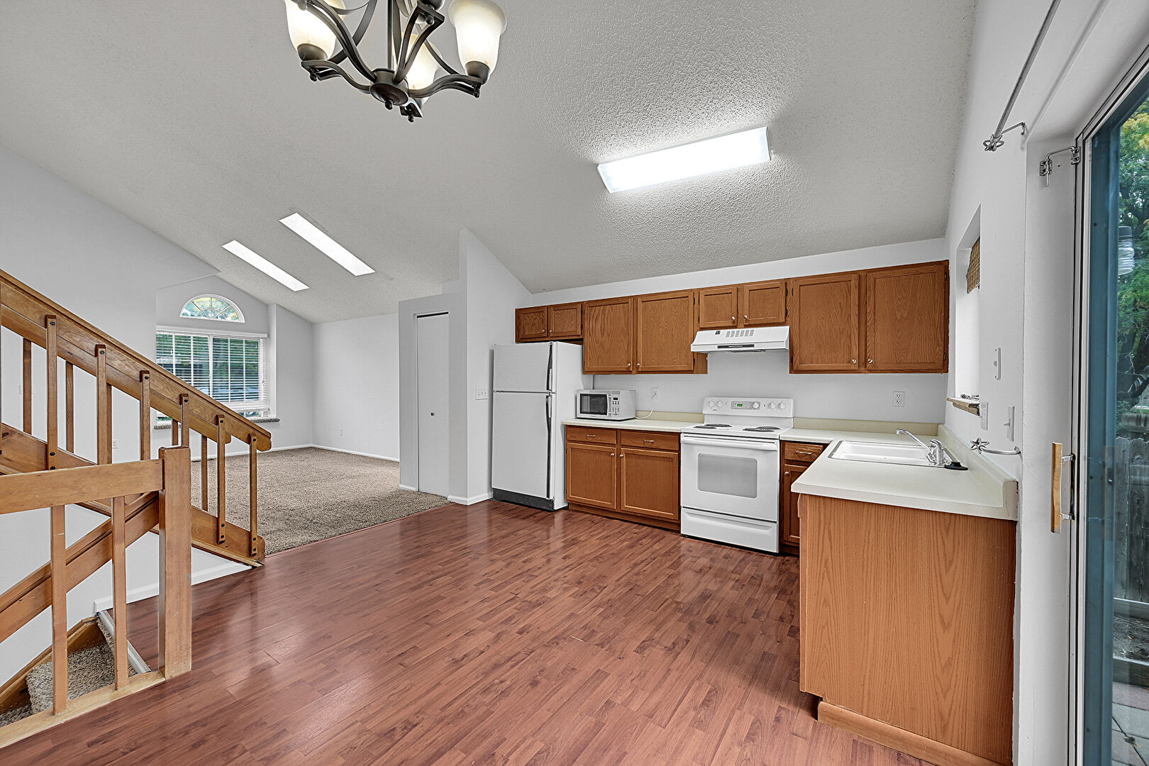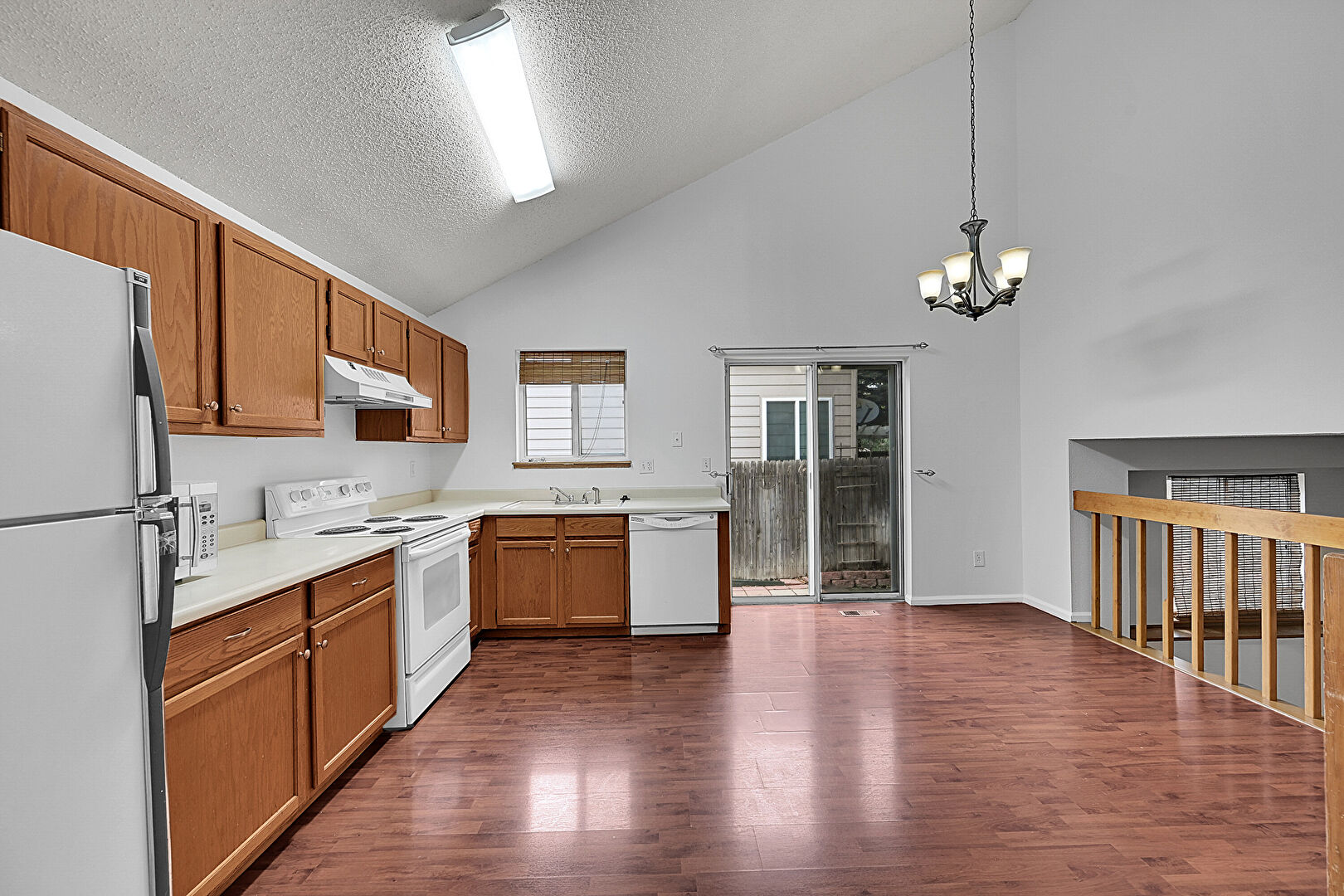Baseboards Wall, Drywall, High Ceiling, L Shaped Kitchen, Medium Brown Cabinets, Natural Light, Notable Chandelier, Opens To Living Area, Pendant Lighting, Shaker Cabinets, Skylight, Textured Ceiling, Vaulted Ceiling, Wood Finish Floor, Medium Brown Cabinets, Notable Chandelier