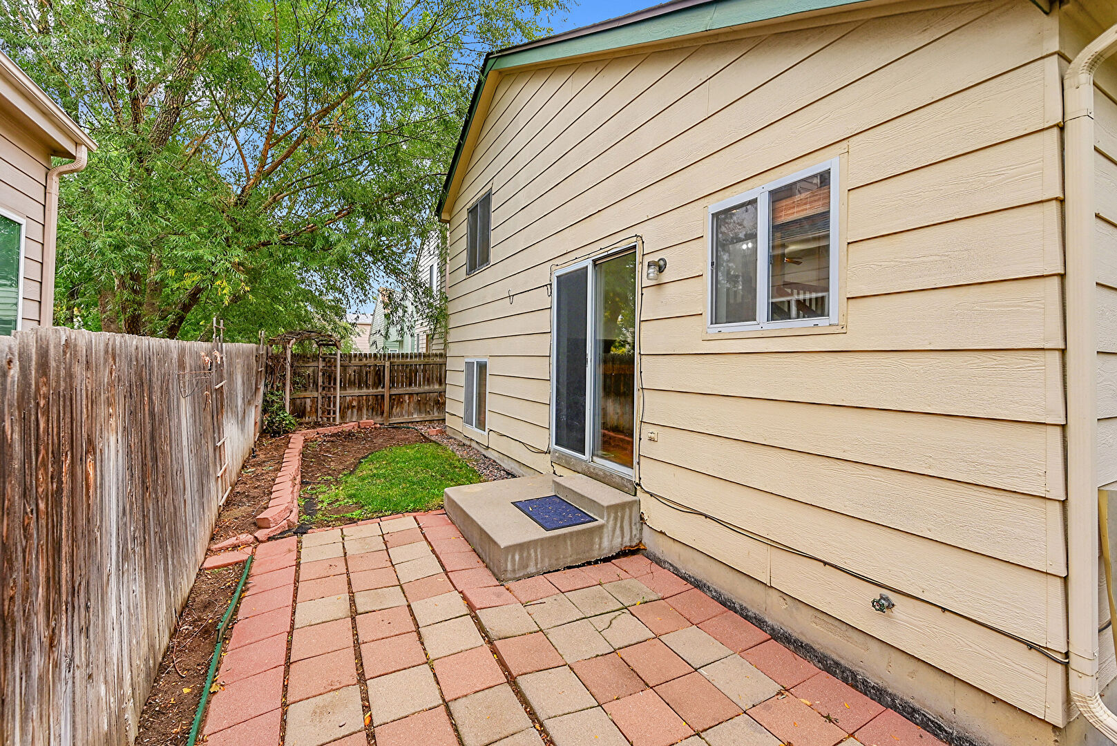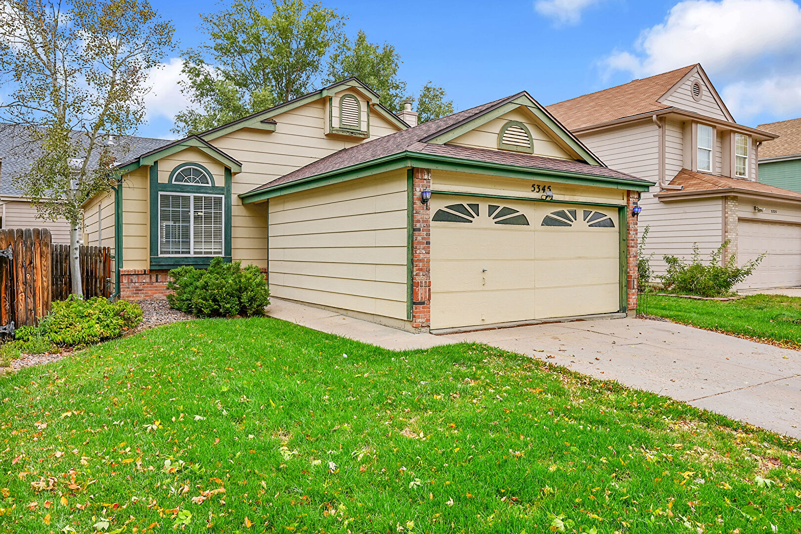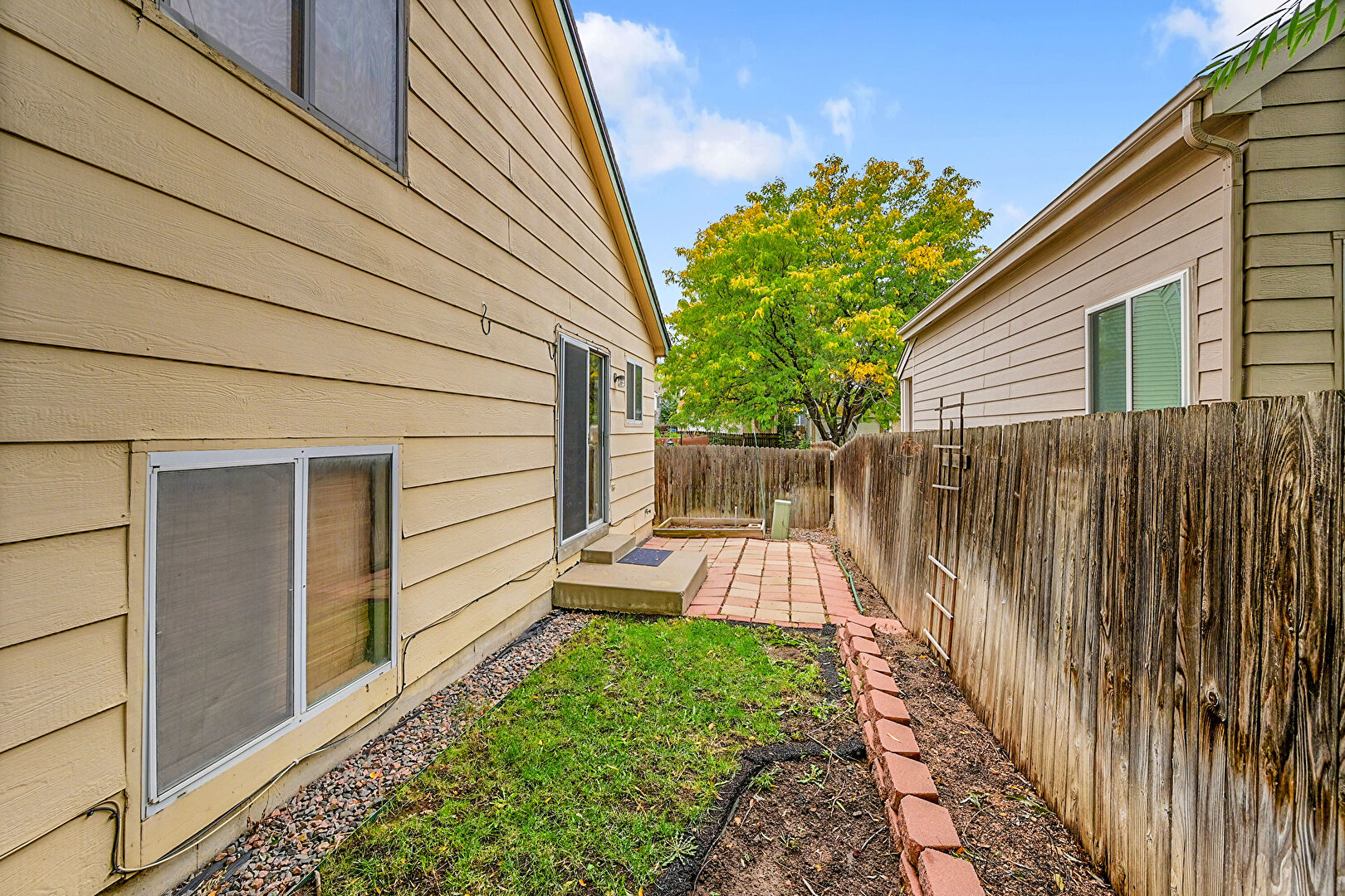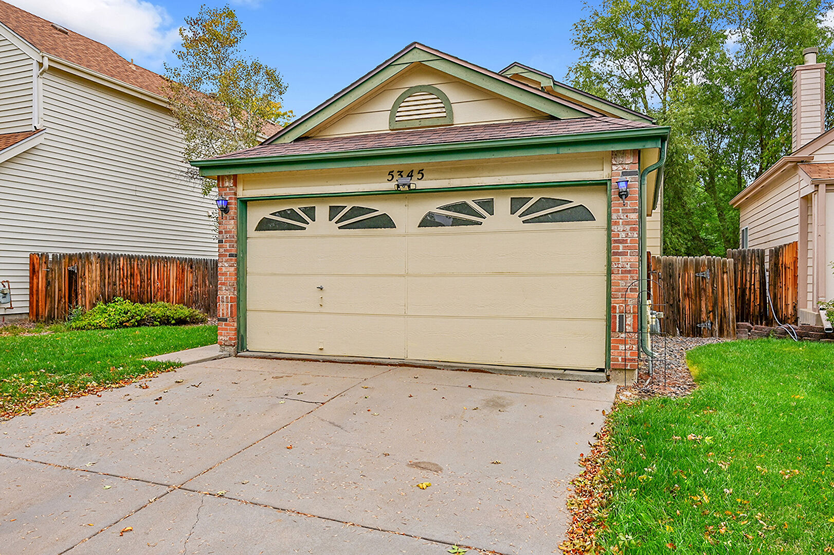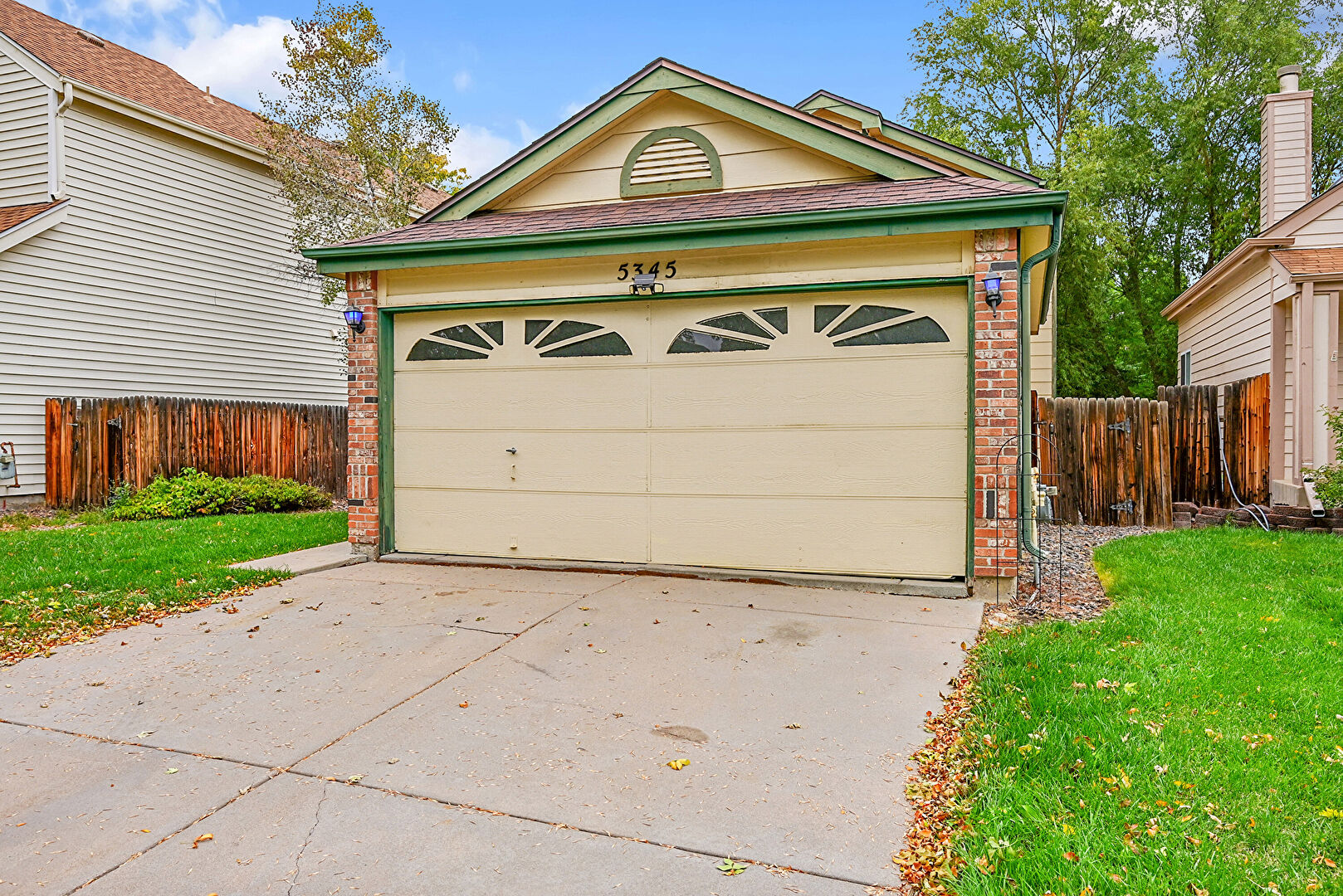 Brick Siding, Concrete Foundation, Downspout, Driveway, Fence, Garage, Gas Meter, Gutters, Horizontal Siding, Lawn, Shingle Roof, Downspout, Fence, Garage, Lawn