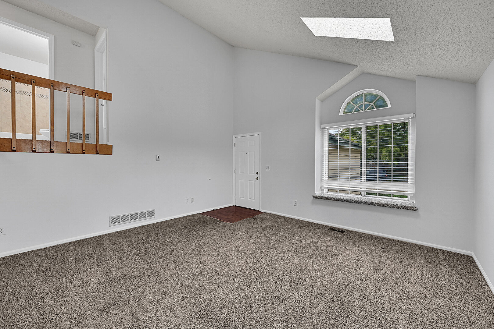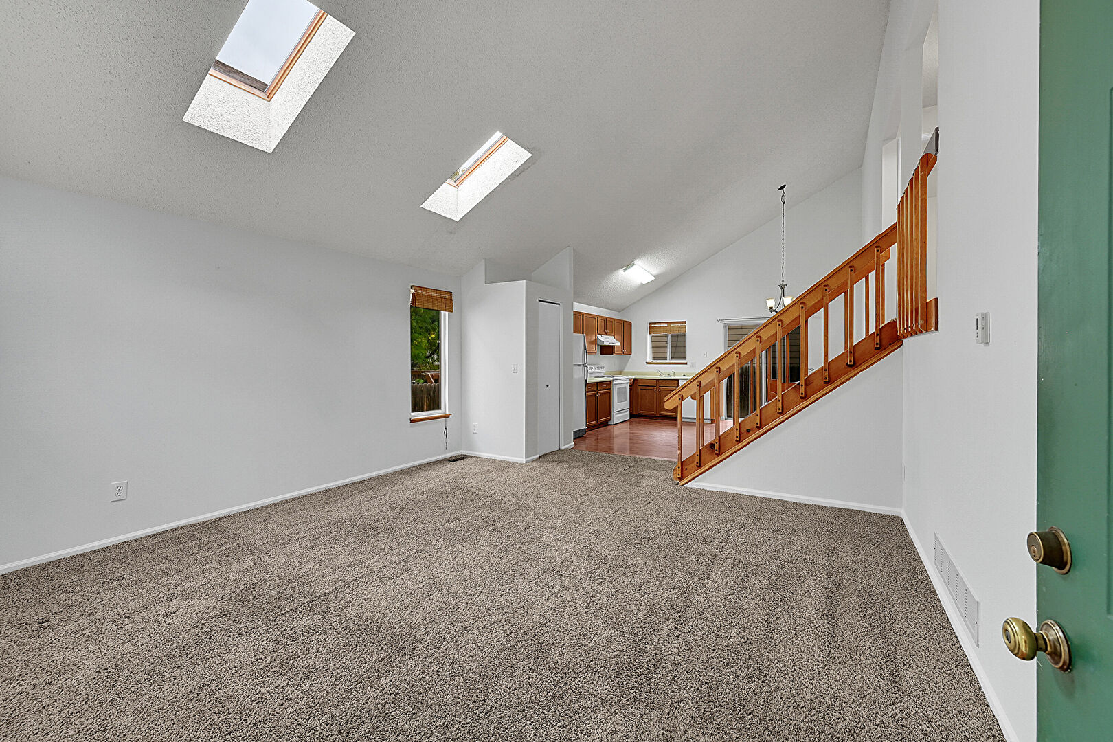 Baseboards Wall, Drywall, High Ceiling, Natural Light, Skylight, Stairs, Vaulted Ceiling, Vent, Carpet
