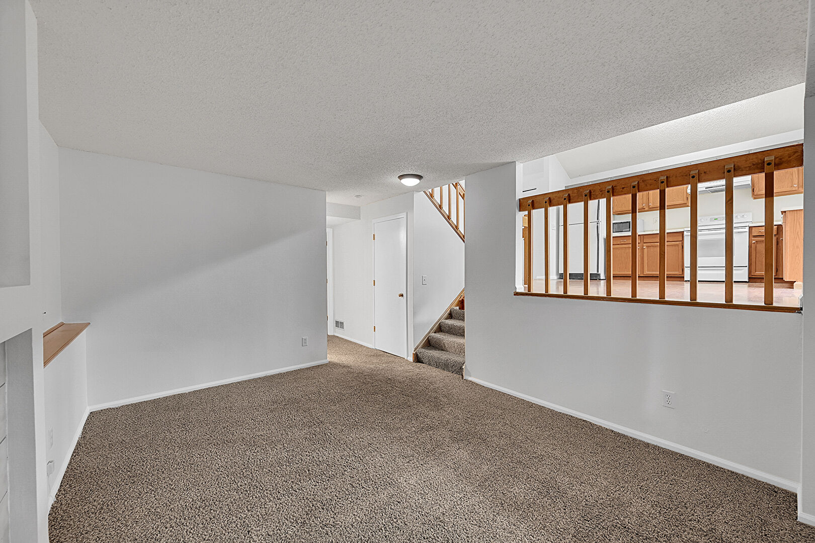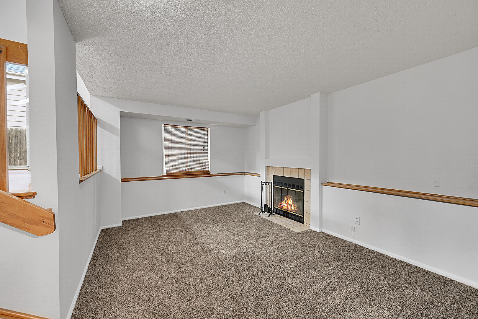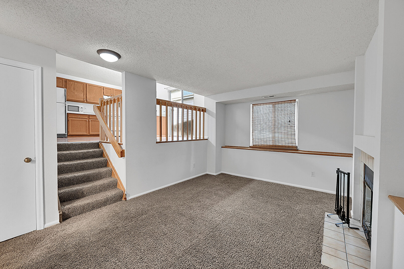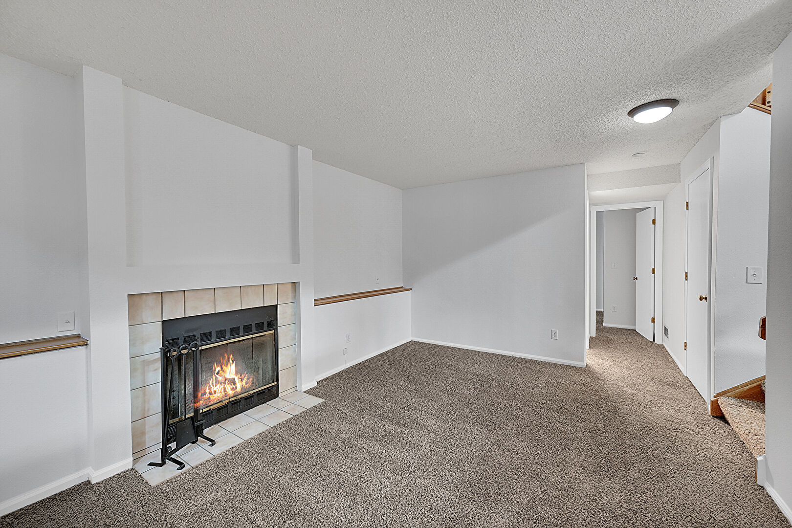 Baseboards Wall, Basement, Carpet, Drywall, Fireplace, Natural Light, Stairs, Textured Ceiling, Baseboards Wall, Fireplace, Textured Ceiling, Tile Floor
