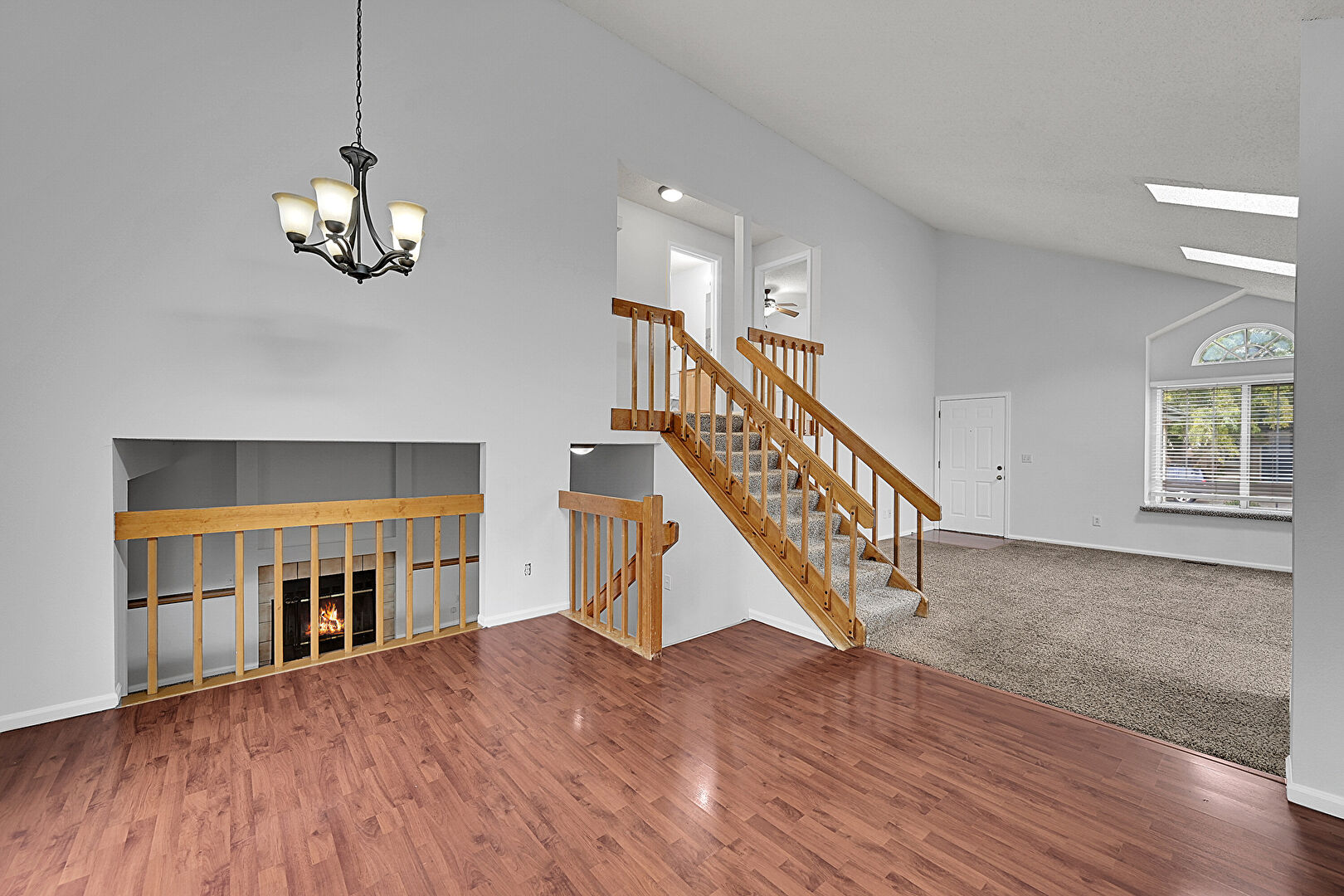 Baseboards Wall, Carpet, Drywall, Fireplace, High Ceiling, Natural Light, Skylight, Stairs, Vaulted Ceiling, Wood Finish Floor, Notable Chandelier