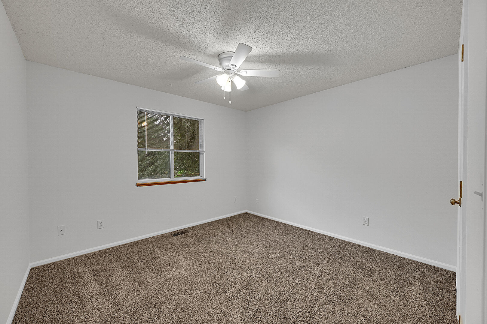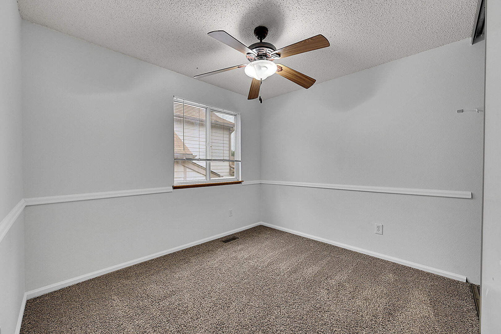Baseboards Wall, Carpet, Ceiling Fan, Drywall, Natural Light, Textured Ceiling, Vent, Carpet, Ceiling Fan