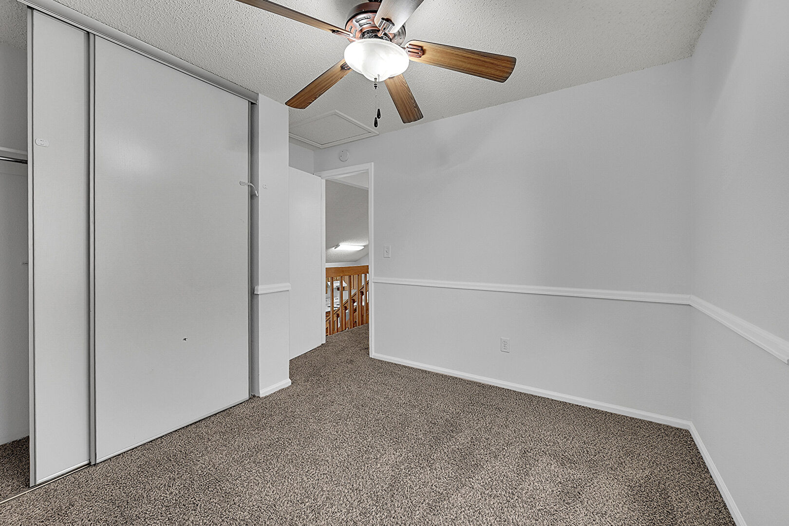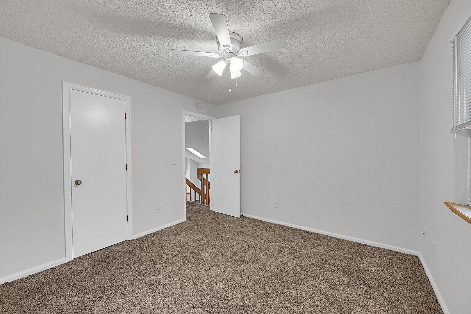 Baseboards Wall, Carpet, Ceiling Fan, Closet, Drop Stairs, Drywall, Natural Light, Scuttle, Textured Ceiling, Vent, Carpet, Natural Light