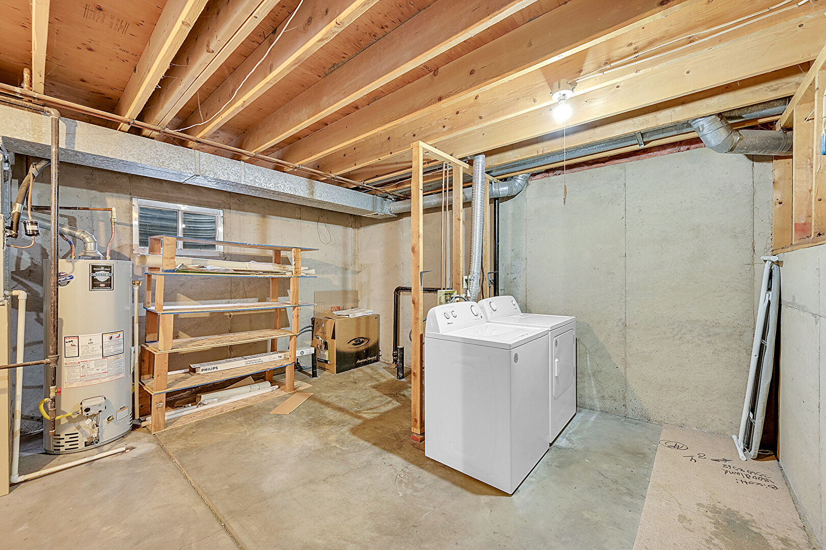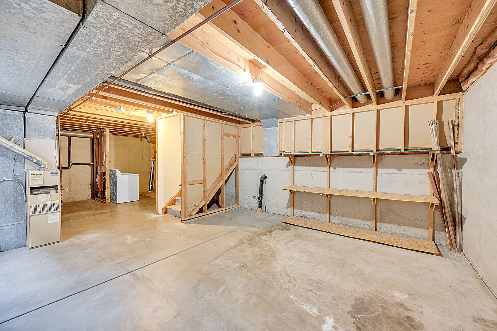 Basement, Concrete Foundation, Furnace, Laundry, Stairs, Washer Dryer, Basement, Water Heater