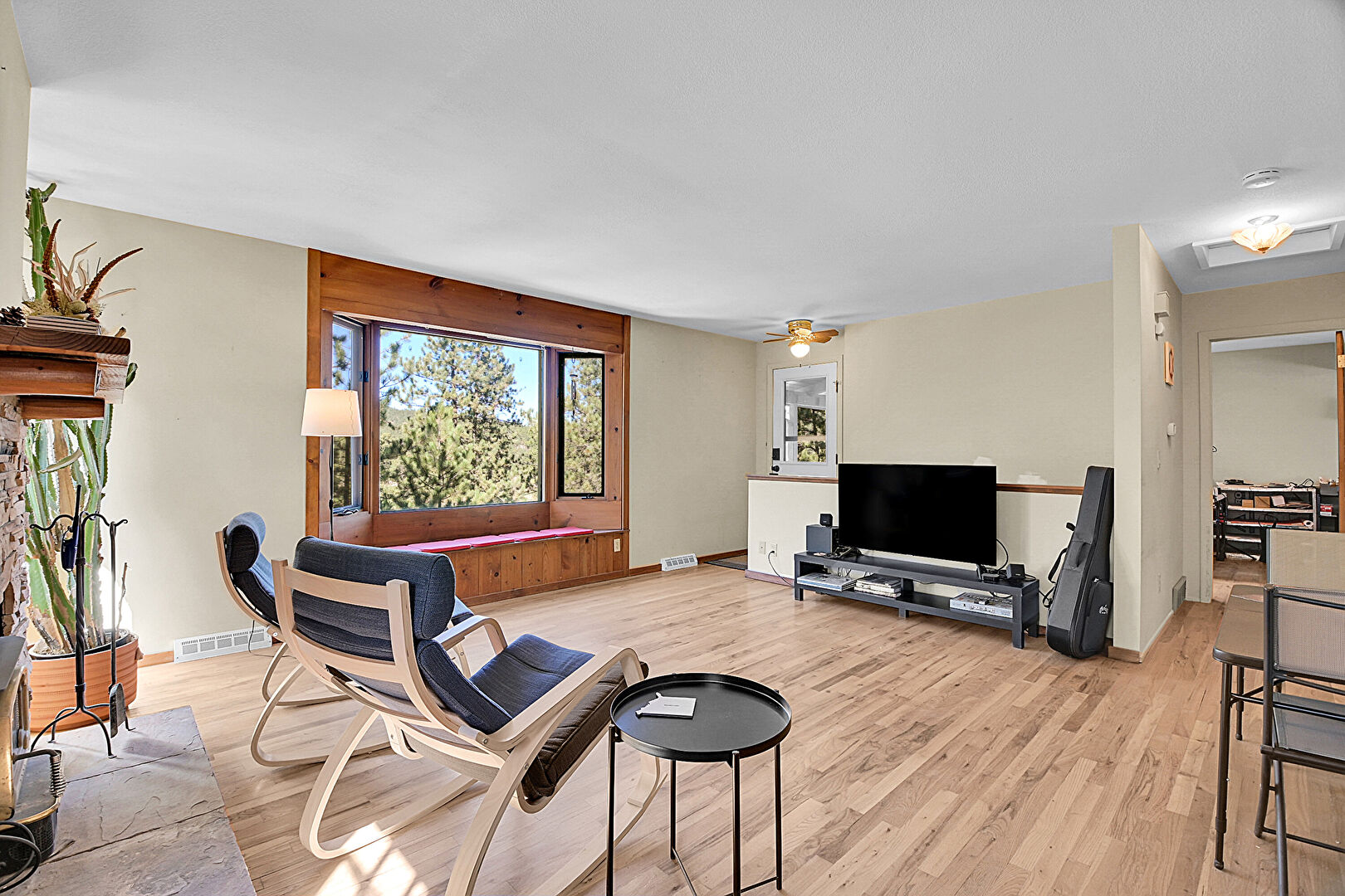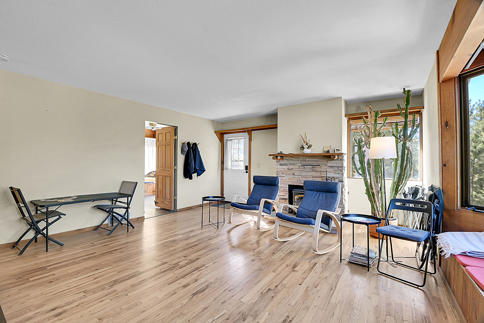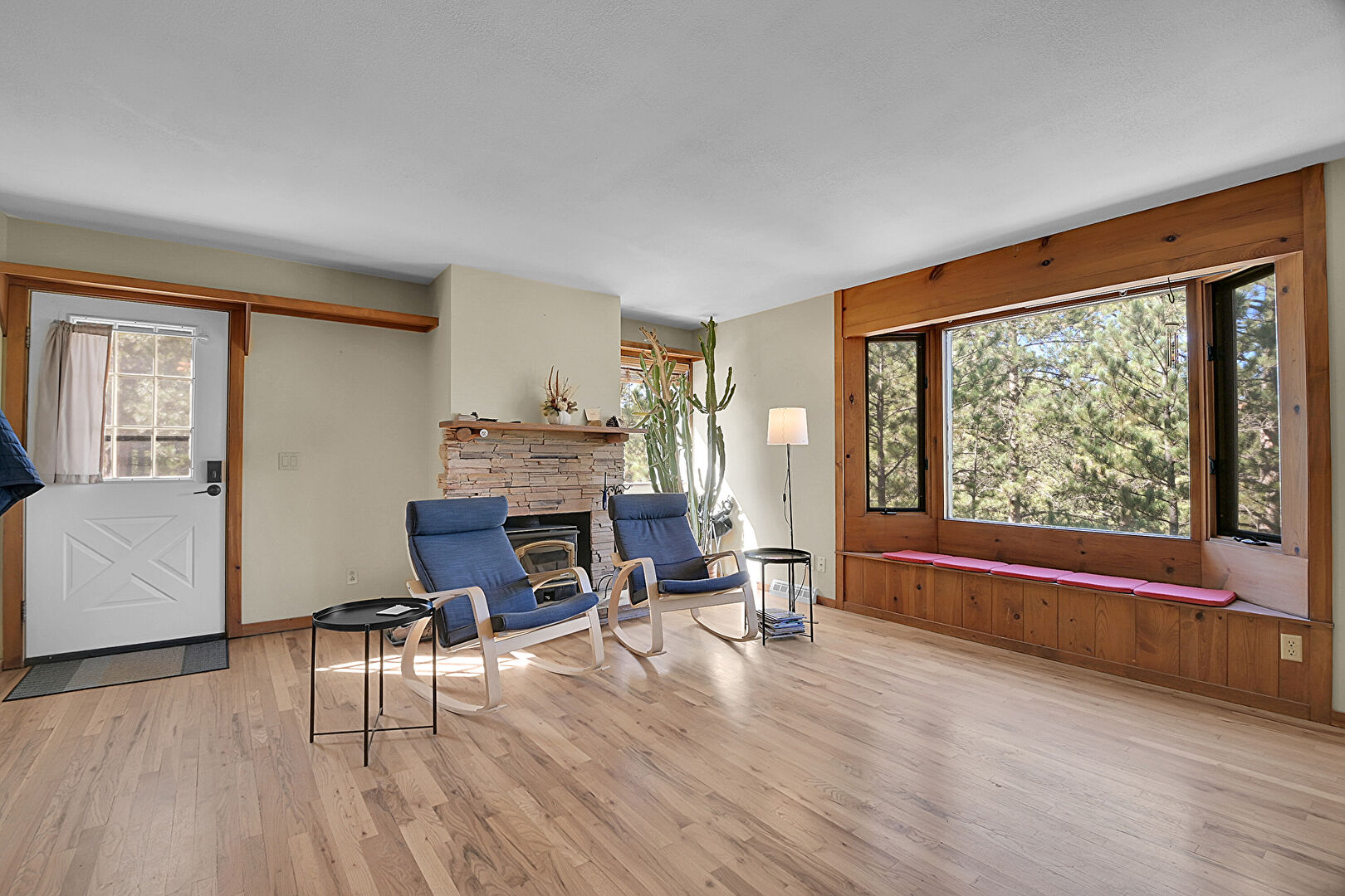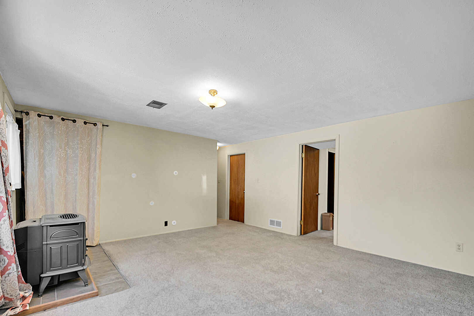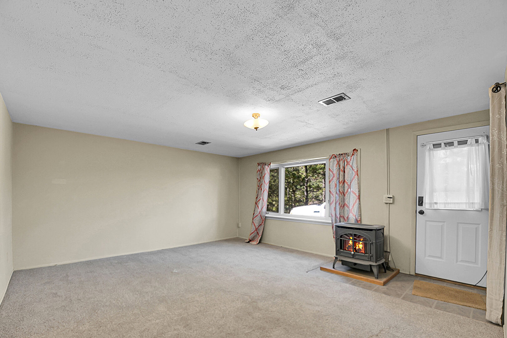 Baseboards Wall, Carpet, Ceiling Fan, Drywall, Fireplace, Natural Light, Scuttle, Textured Ceiling, Vent, Wood Finish Floor, Wood Stove, Carpet, Drywall, Fireplace, Natural Light, Textured Ceiling