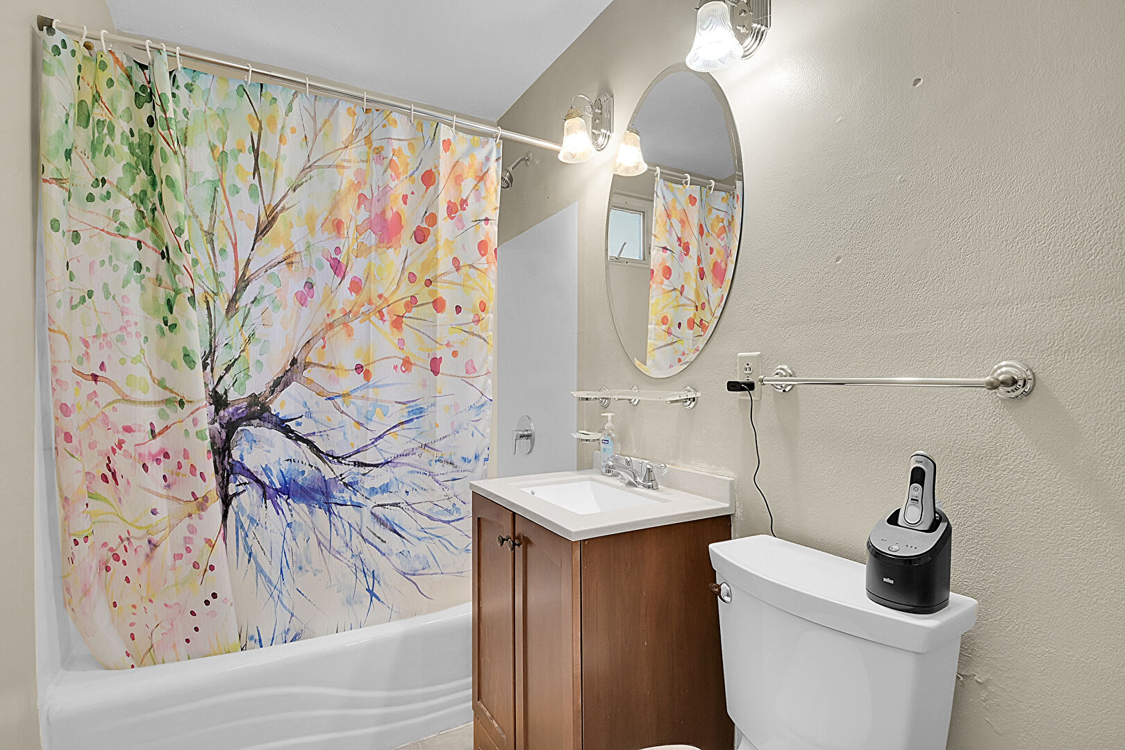 Drywall, Full Bathroom, Recessed Lighting, Textured Wall, Vanity, Vinyl Floor, Wood Wall, Combined Bath Shower, Full Bathroom