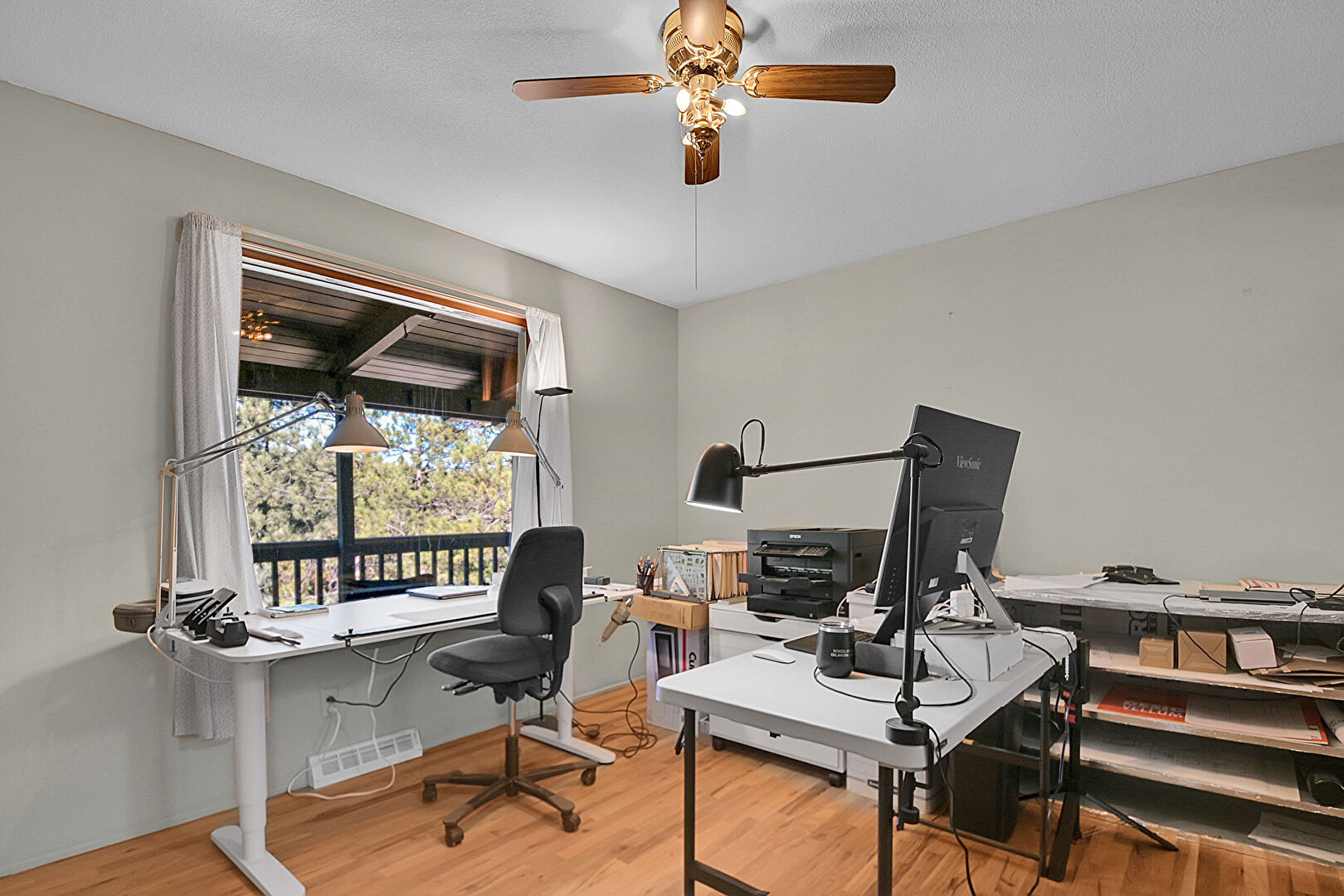 Ceiling Fan, Drywall, Office Area, Vent, Wood Finish Floor, Natural Light