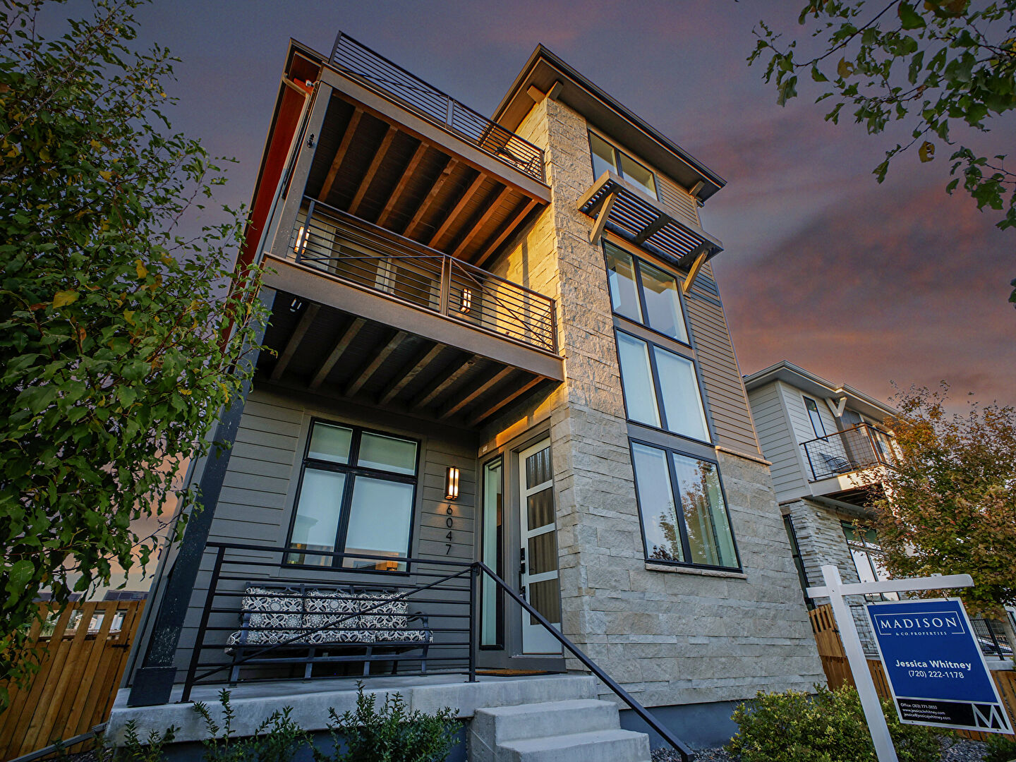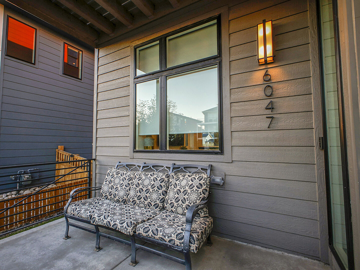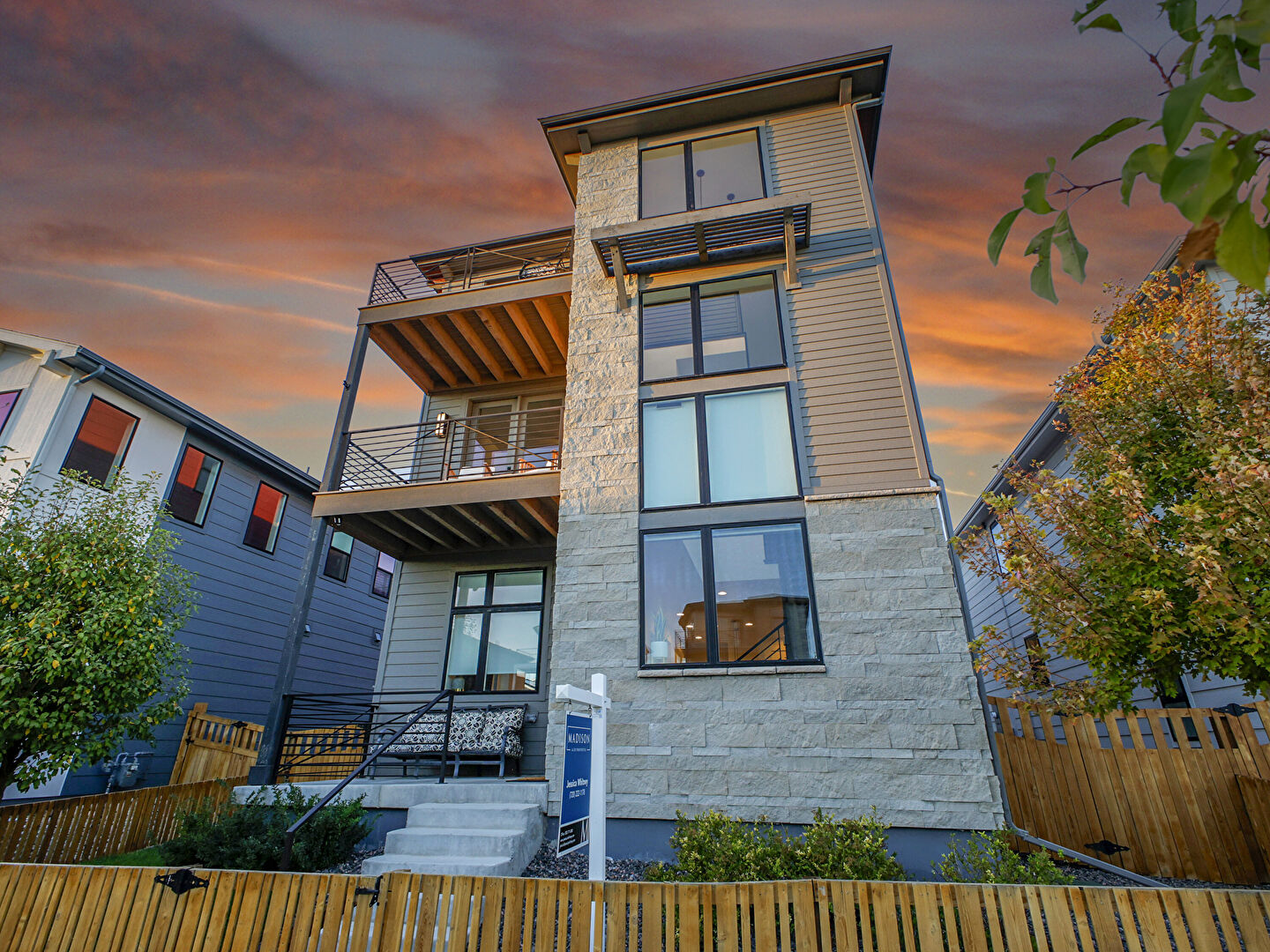 Balcony, Concrete Foundation, Downspout, Fence, Glass Siding, Gutters, Horizontal Siding, Lawn, Pad Mount Transformer, Residential View, Stone Siding, Stoop, Balcony, Concrete Foundation, Downspout, Fence, Stone Siding