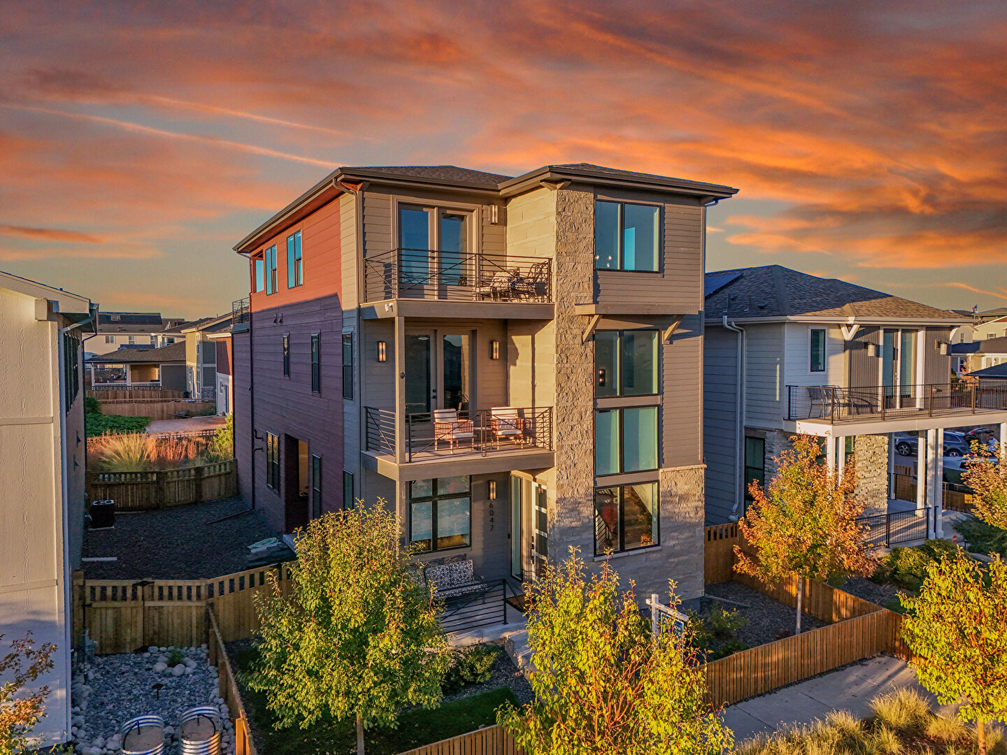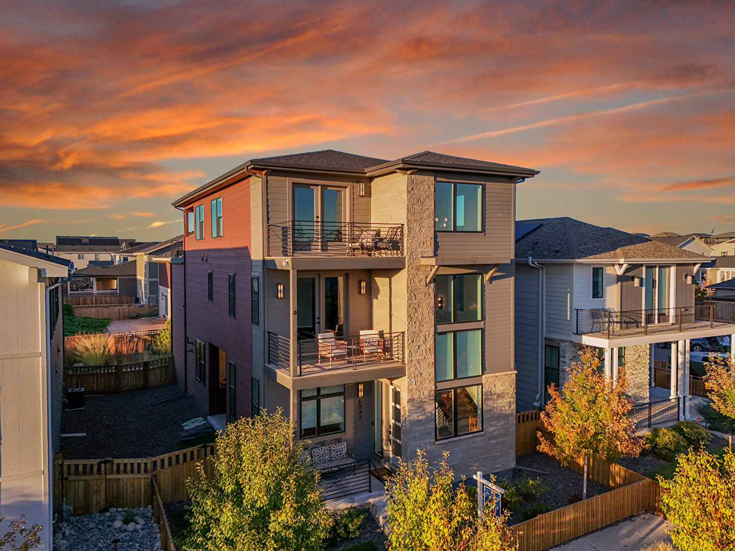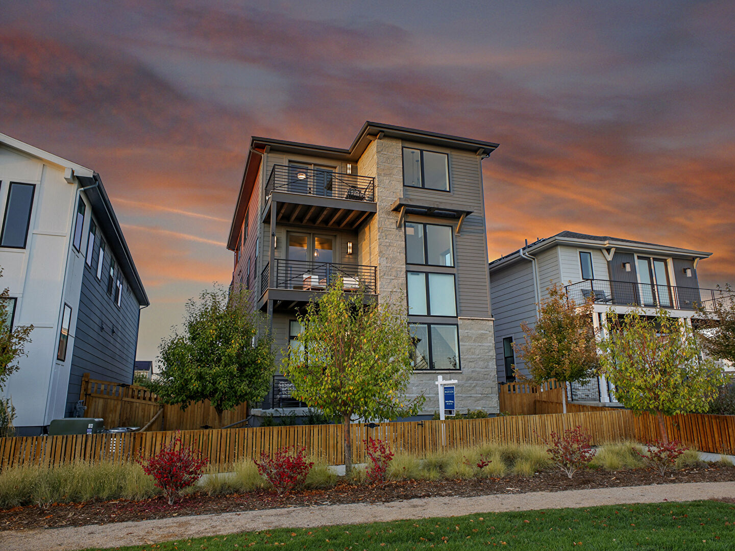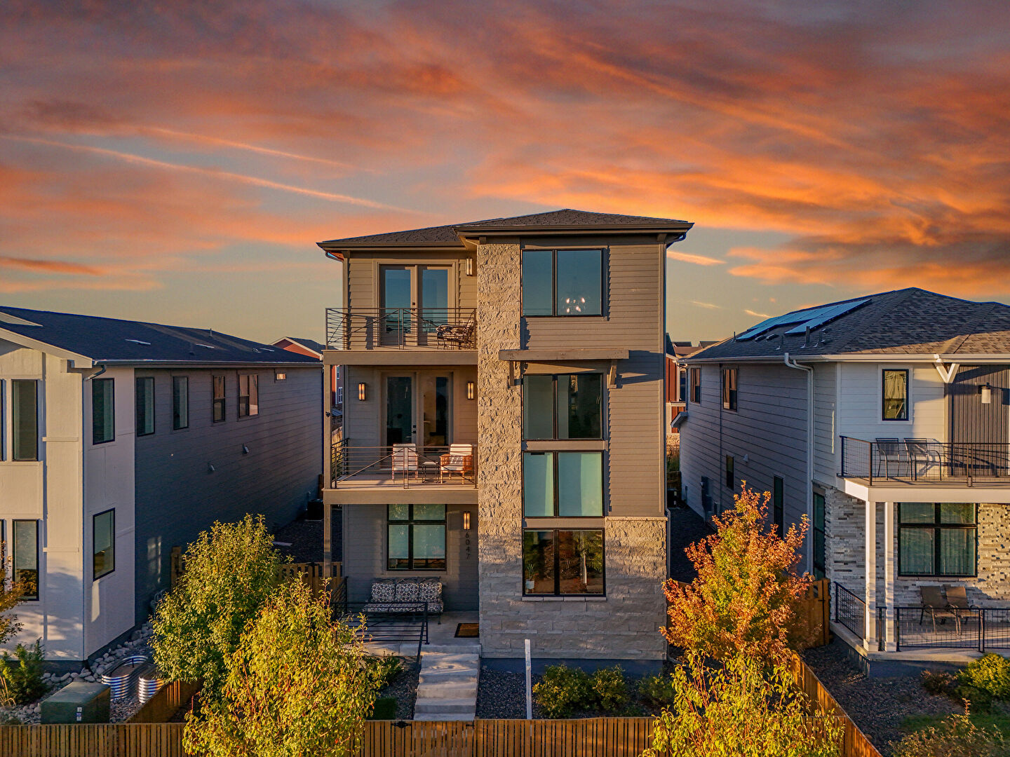 Balcony, Concrete Foundation, Downspout, Fence, Glass Siding, Gutters, Horizontal Siding, Lawn, Pad Mount Transformer, Residential View, Stone Siding, Stoop, Balcony, Concrete Foundation, Downspout, Fence, Stone Siding