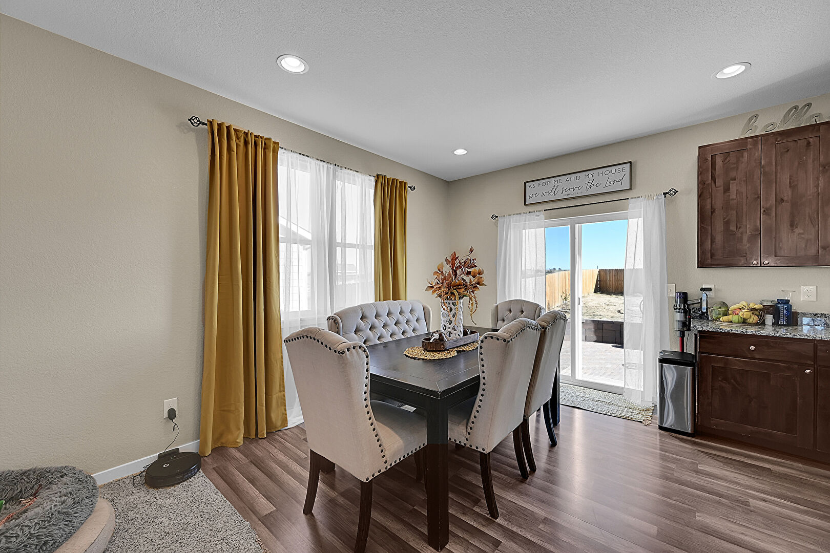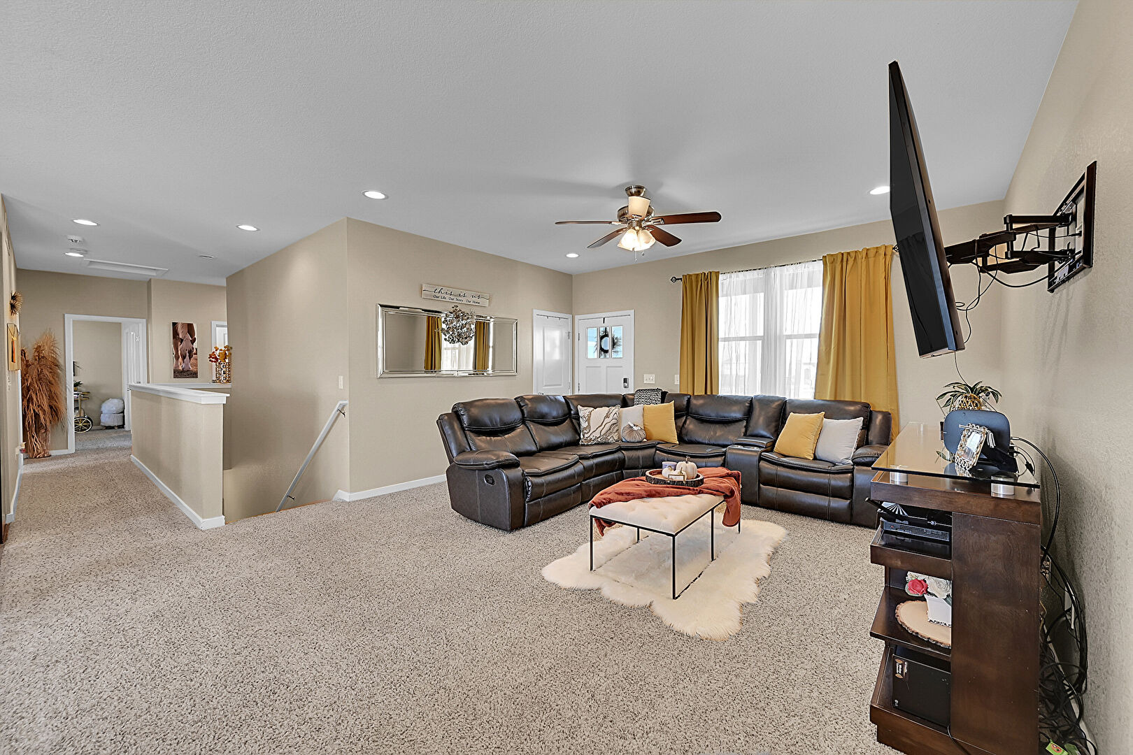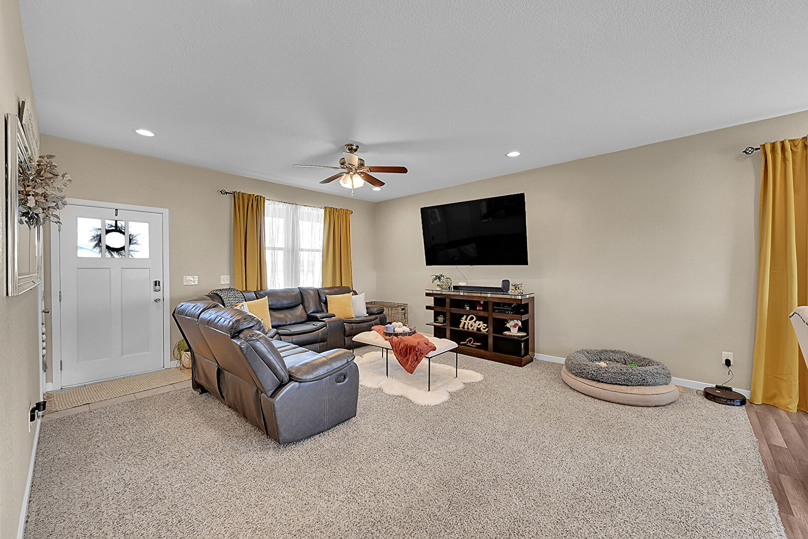 Baseboards Wall, Carpet, Ceiling Fan, Drywall, L Shaped Kitchen, Natural Light, Recessed Lighting, Vent, Wood Finish Floor, Baseboards Wall, Drywall, Natural Light