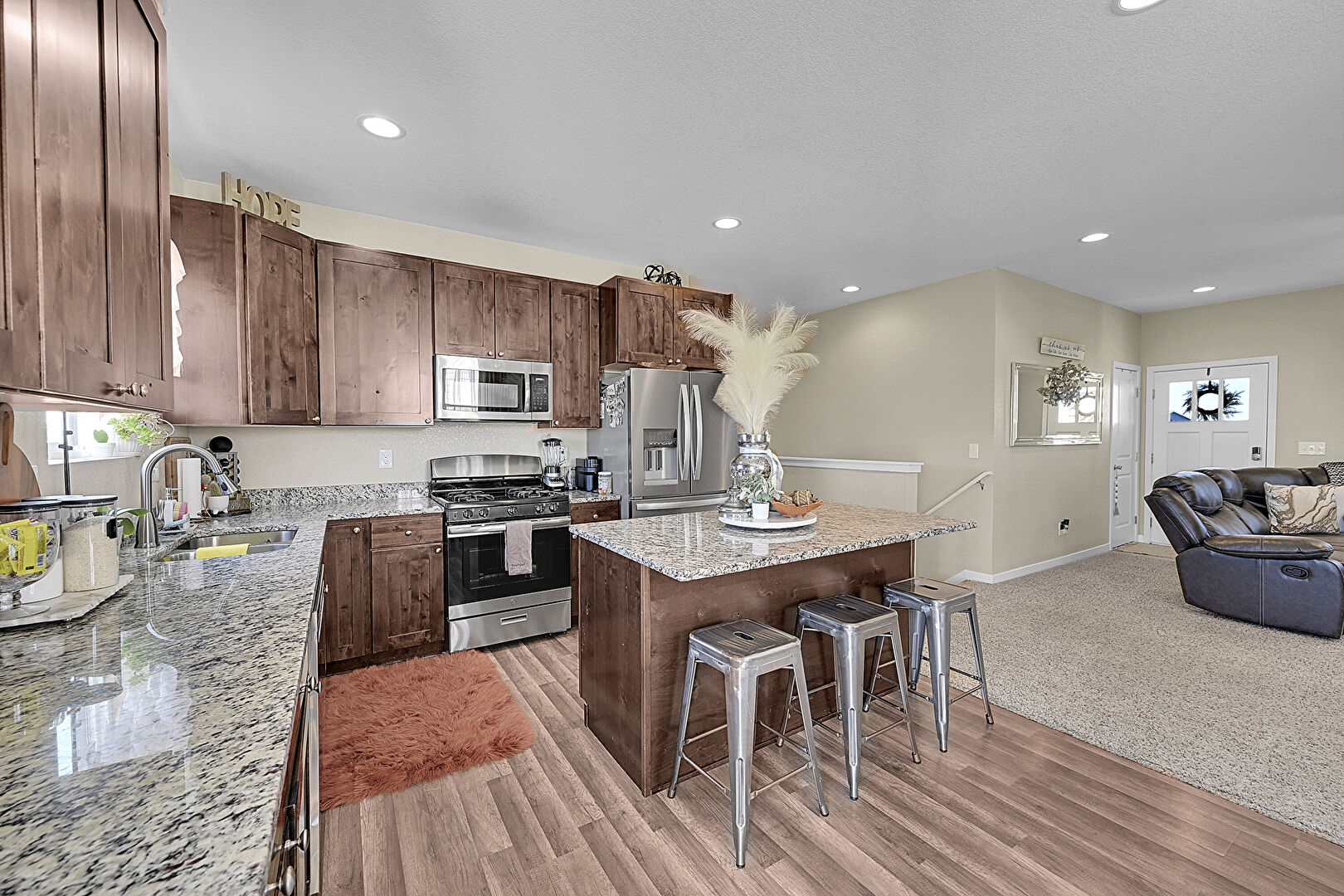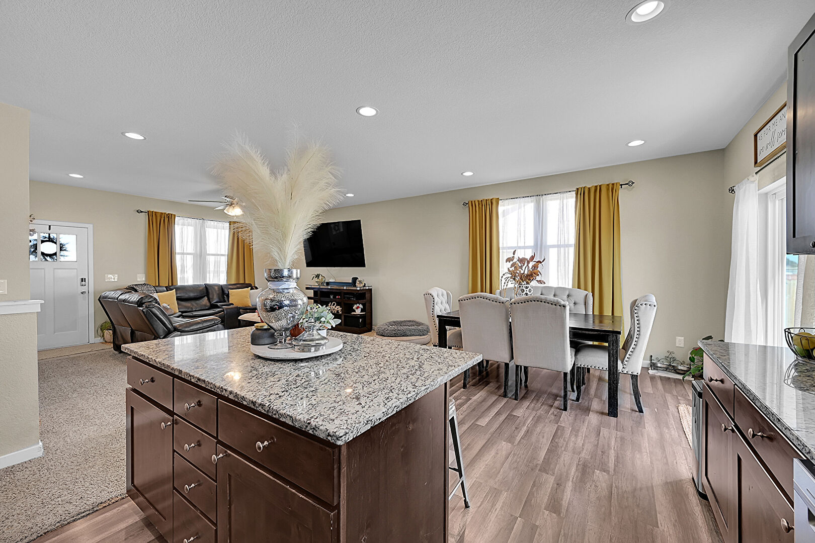 Baseboards Wall, Carpet, Ceiling Fan, Dark Brown Cabinets, Drywall, Kitchen Bar, Kitchen Island, L Shaped Kitchen, Natural Light, Opens To Living Area, Recessed Lighting, Shaker Cabinets, Stone Countertops, Wood Finish Floor, Shaker Cabinets, Wood Finish Floor
