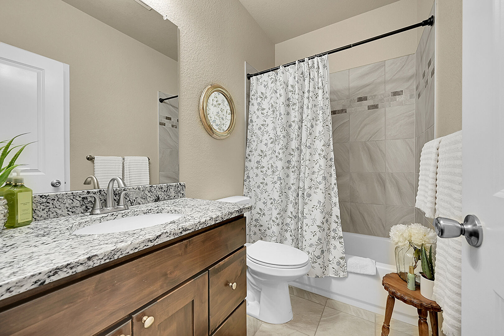 Combined Bath Shower, Full Bathroom, Textured Wall, Tile Floor, Vanity