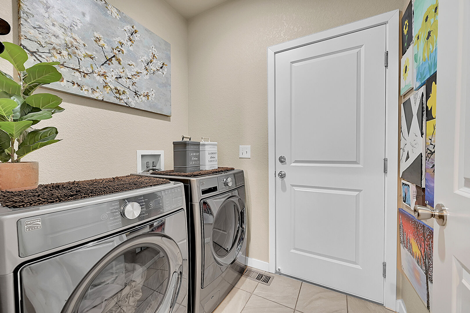 Baseboards Wall, Laundry, Tile Floor, Vent, Washer Hookup, Textured Wall