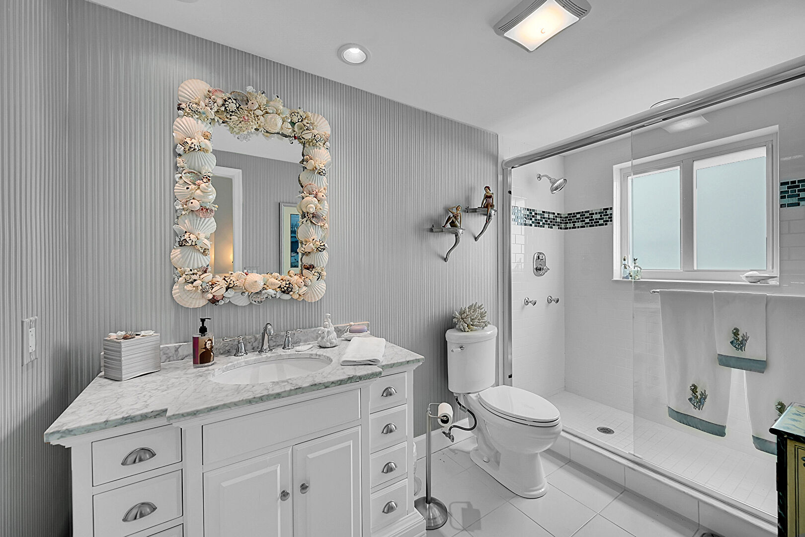 Combined Bath Shower, Full Bathroom, Natural Light, Recessed Lighting, Tile Floor, Vent, Wallpaper Wall, Baseboards Wall
