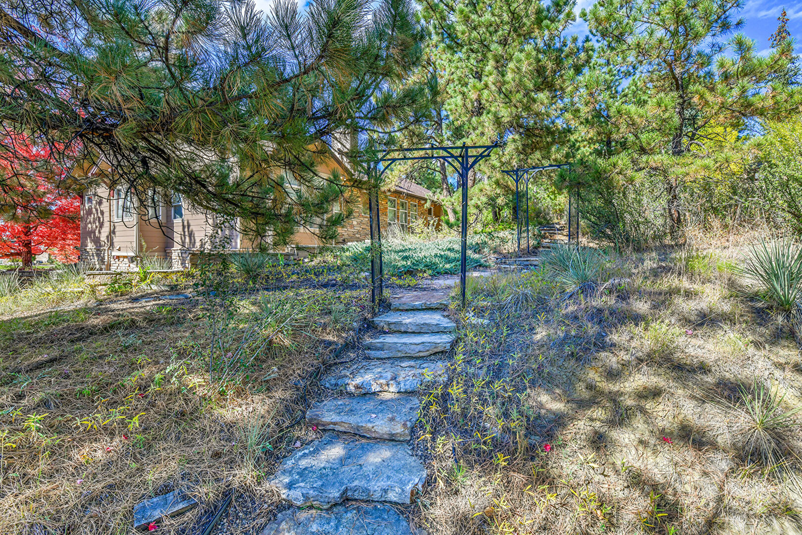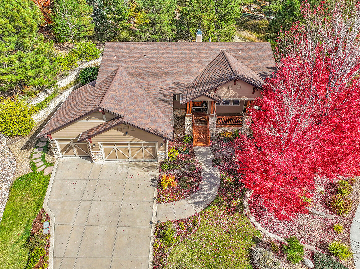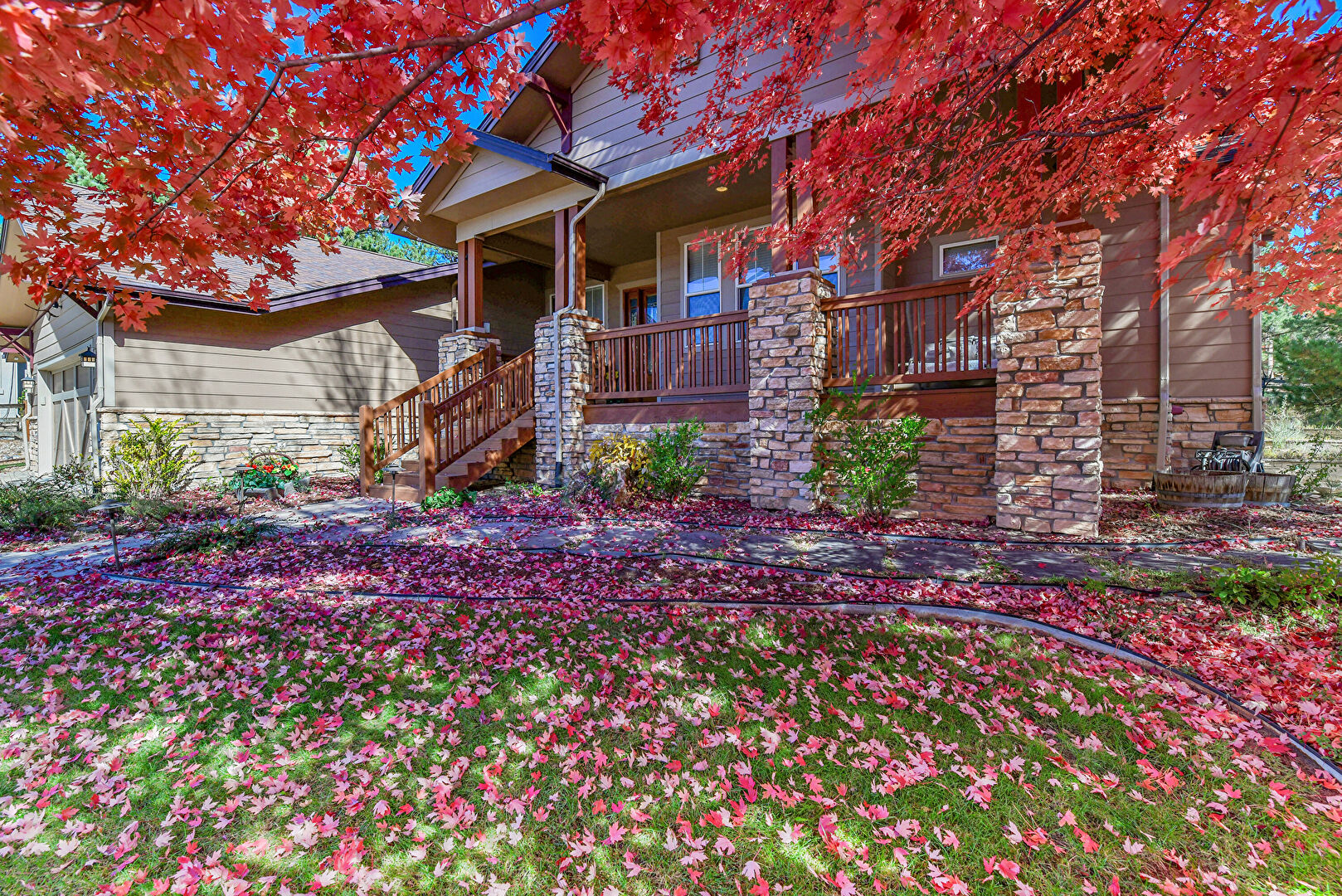 Chimney, Downspout, Driveway, Gutters, Horizontal Siding, Lawn, Porch, Shingle Roof, Stairs, Stone Siding, Woods View, Downspout, Driveway, Stone Siding