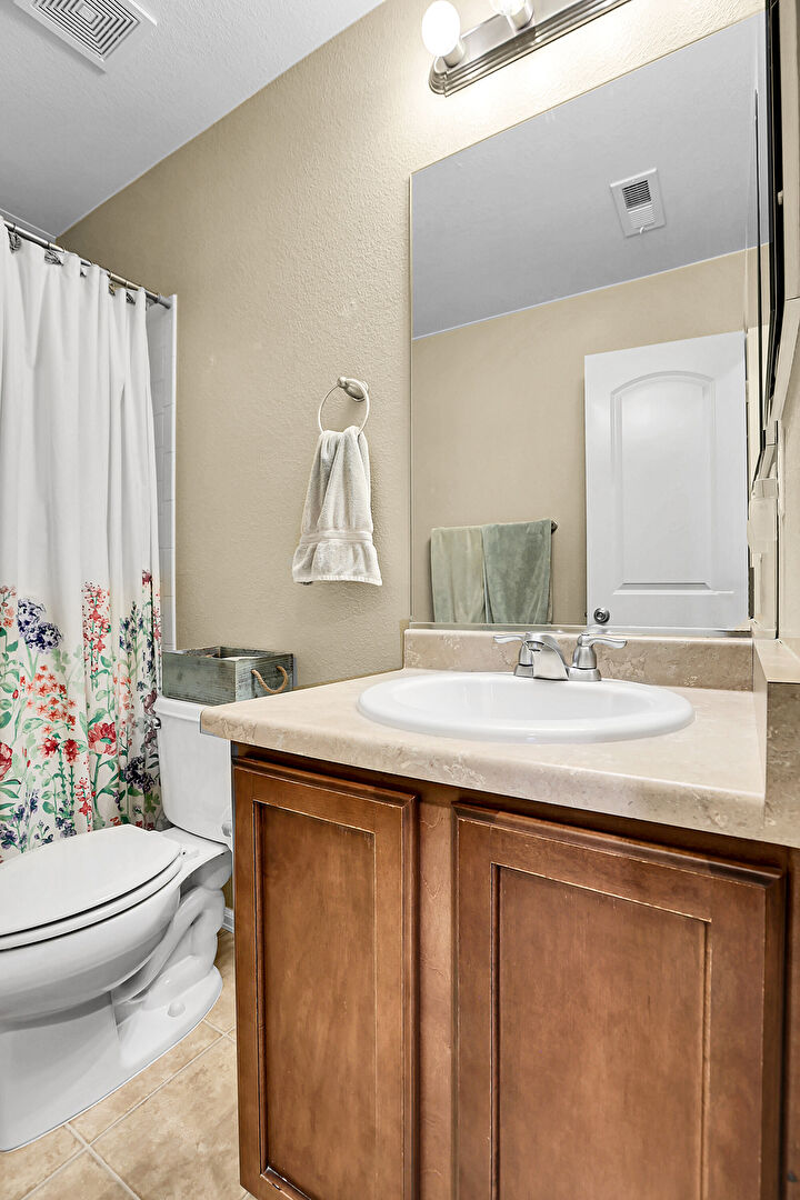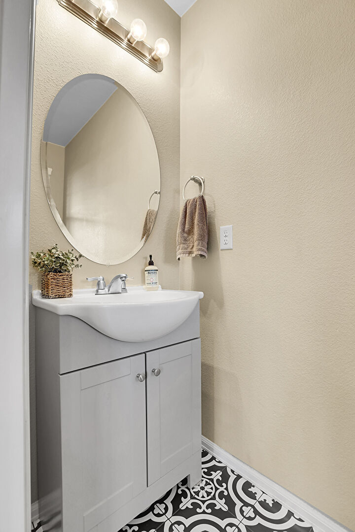 Baseboards Wall, Full Bathroom, Half Bathroom, Textured Ceiling, Textured Wall, Tile Floor, Vanity, Vent, Baseboards Wall, Combined Bath Shower, Half Bathroom, Natural Light, Textured Wall, Vent