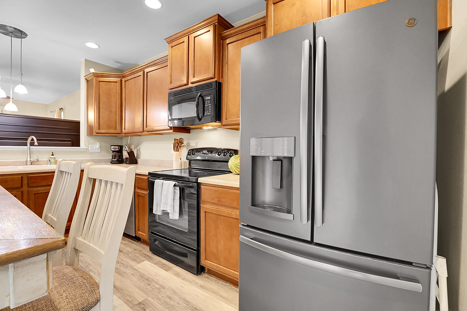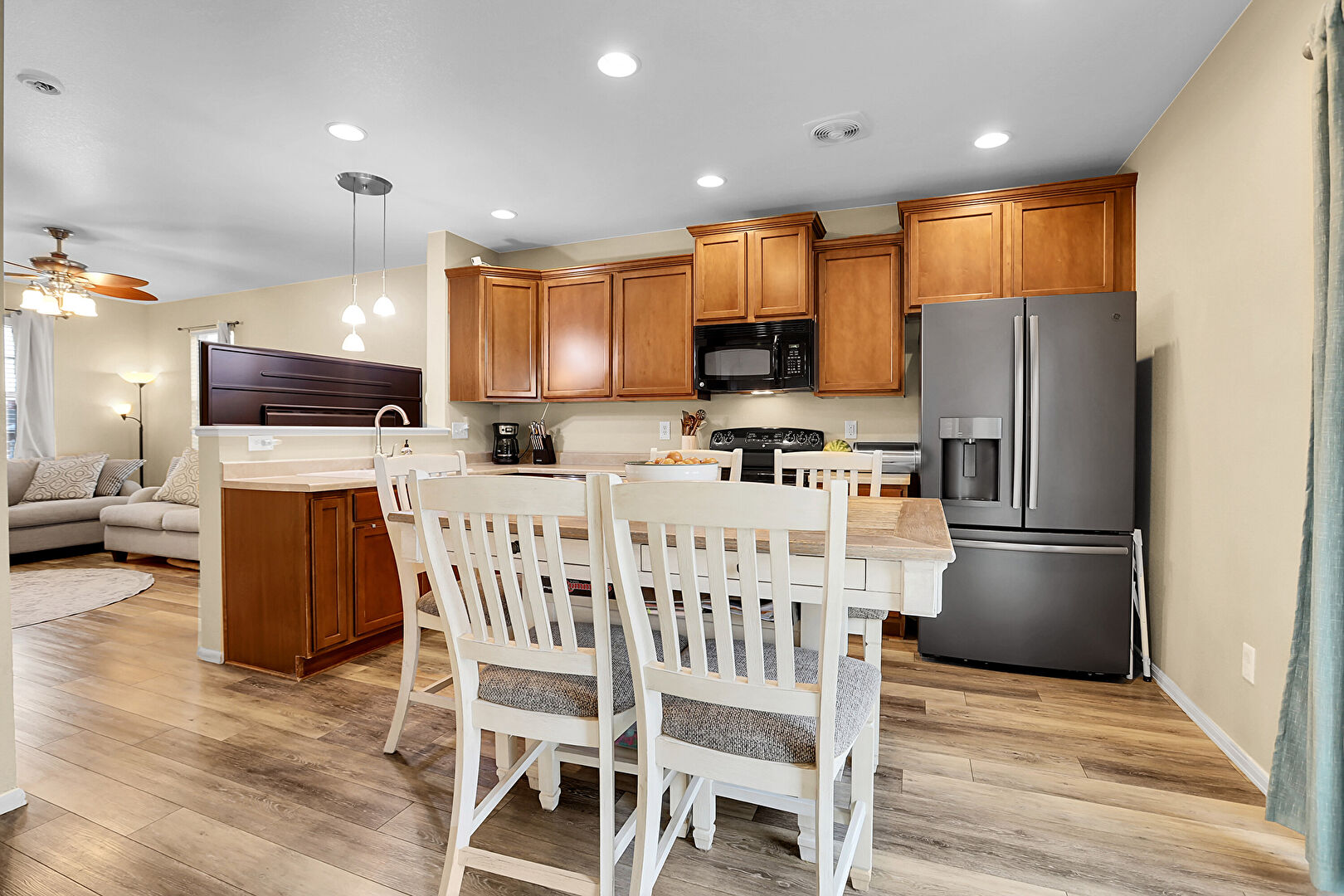 Baseboards Wall, Ceiling Fan, Crown Molding Cabinets, Drywall, Kitchen Bar, Kitchen Peninsula, L Shaped Kitchen, Medium Brown Cabinets, Natural Light, Opens To Living Area, Pendant Lighting, Recessed Lighting, Shaker Cabinets, Stone Countertops, Vent, Wood Finish Floor, Drywall, Shaker Cabinets, Stone Countertops