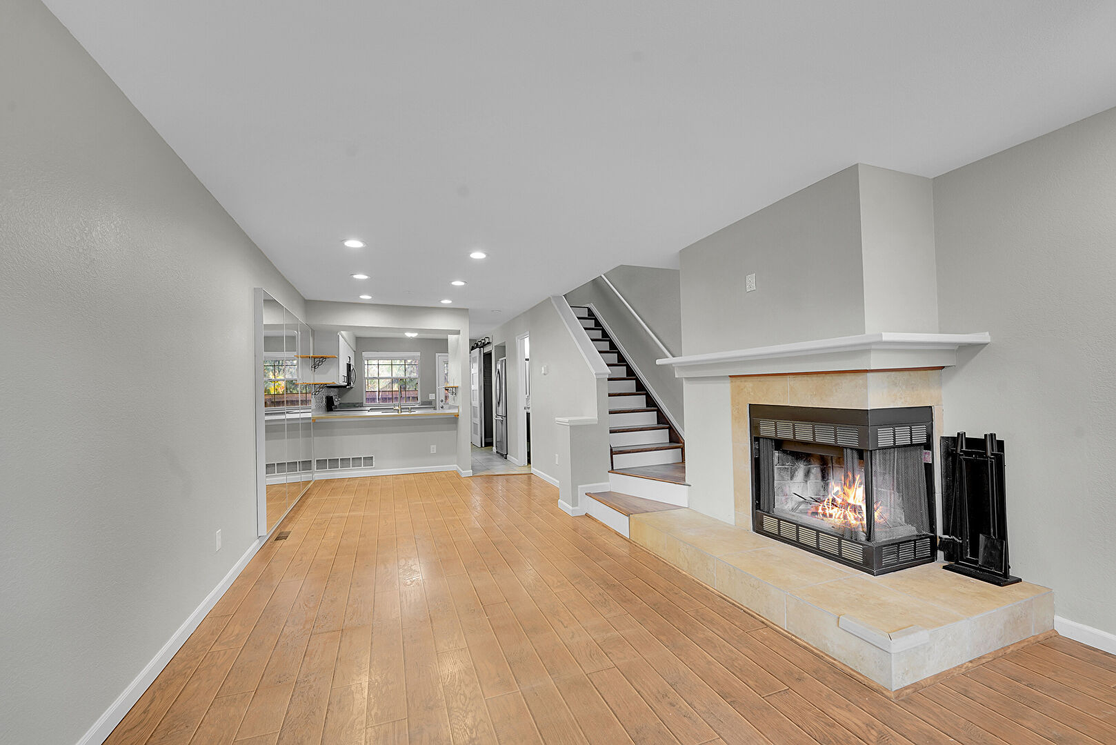 Baseboards Wall, Drywall, Fireplace, Natural Light, Stairs, Vent, Wood Finish Floor, Natural Light, Recessed Lighting