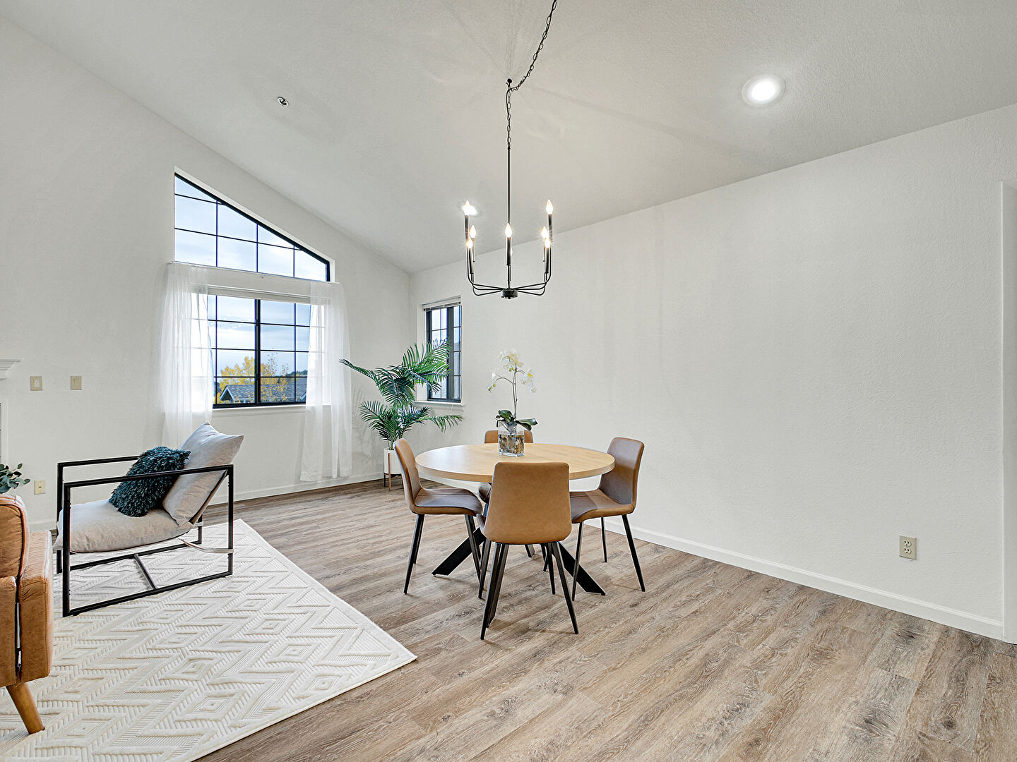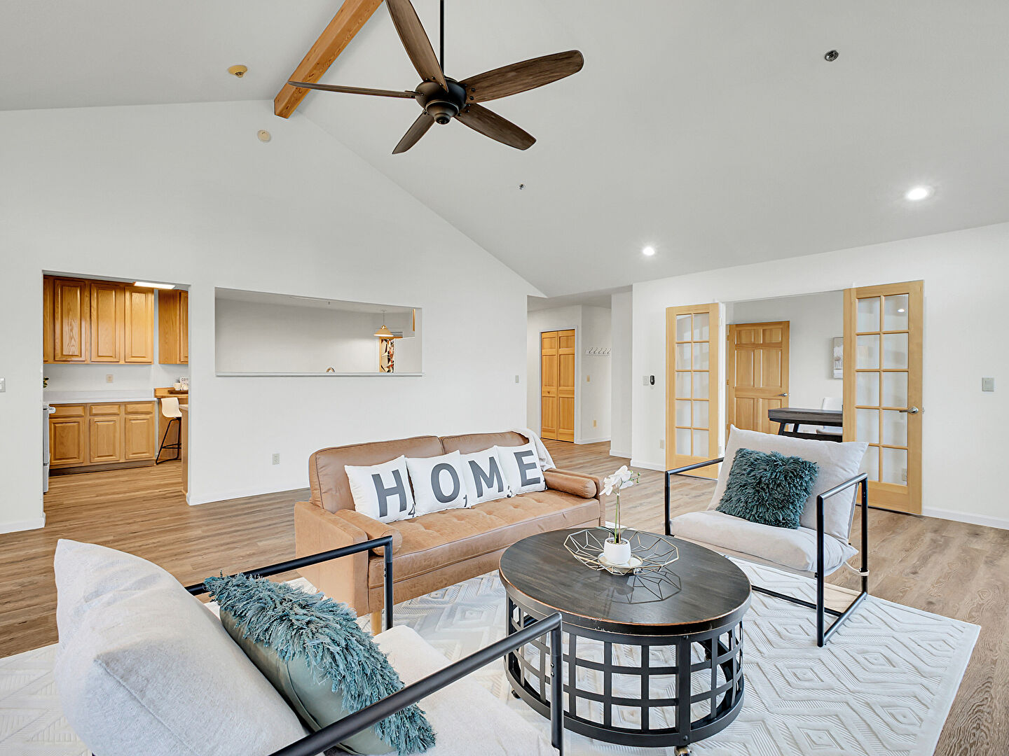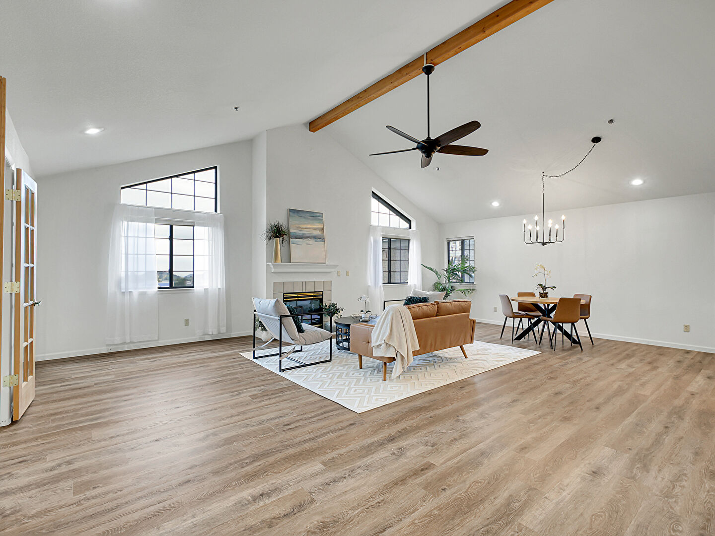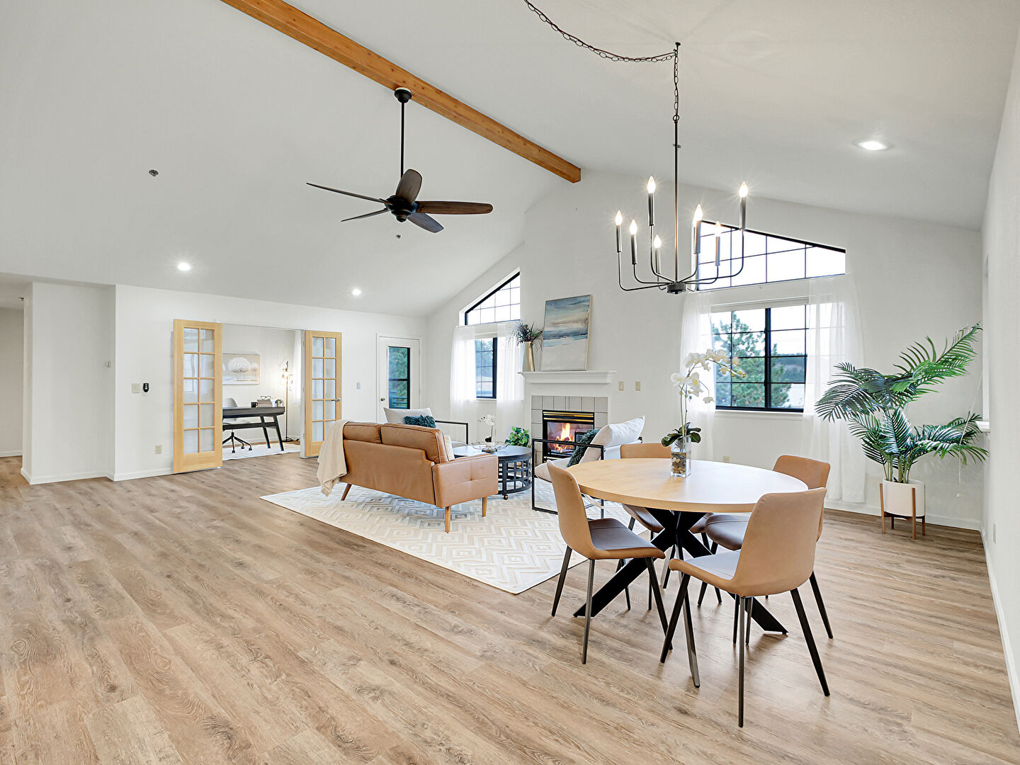 Baseboards Wall, Cathedral Ceiling, Ceiling Fan, Drywall, Fireplace, French Doors, High Ceiling, Natural Light, Notable Chandelier, Recessed Lighting, Vaulted Ceiling, Wood Finish Floor, Beamed Ceiling, Drywall, Recessed Lighting