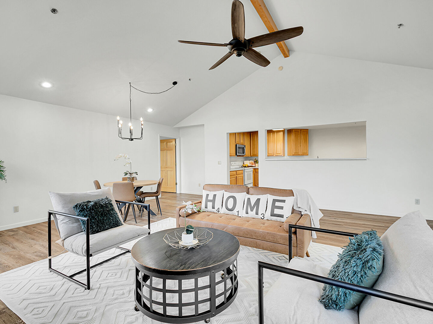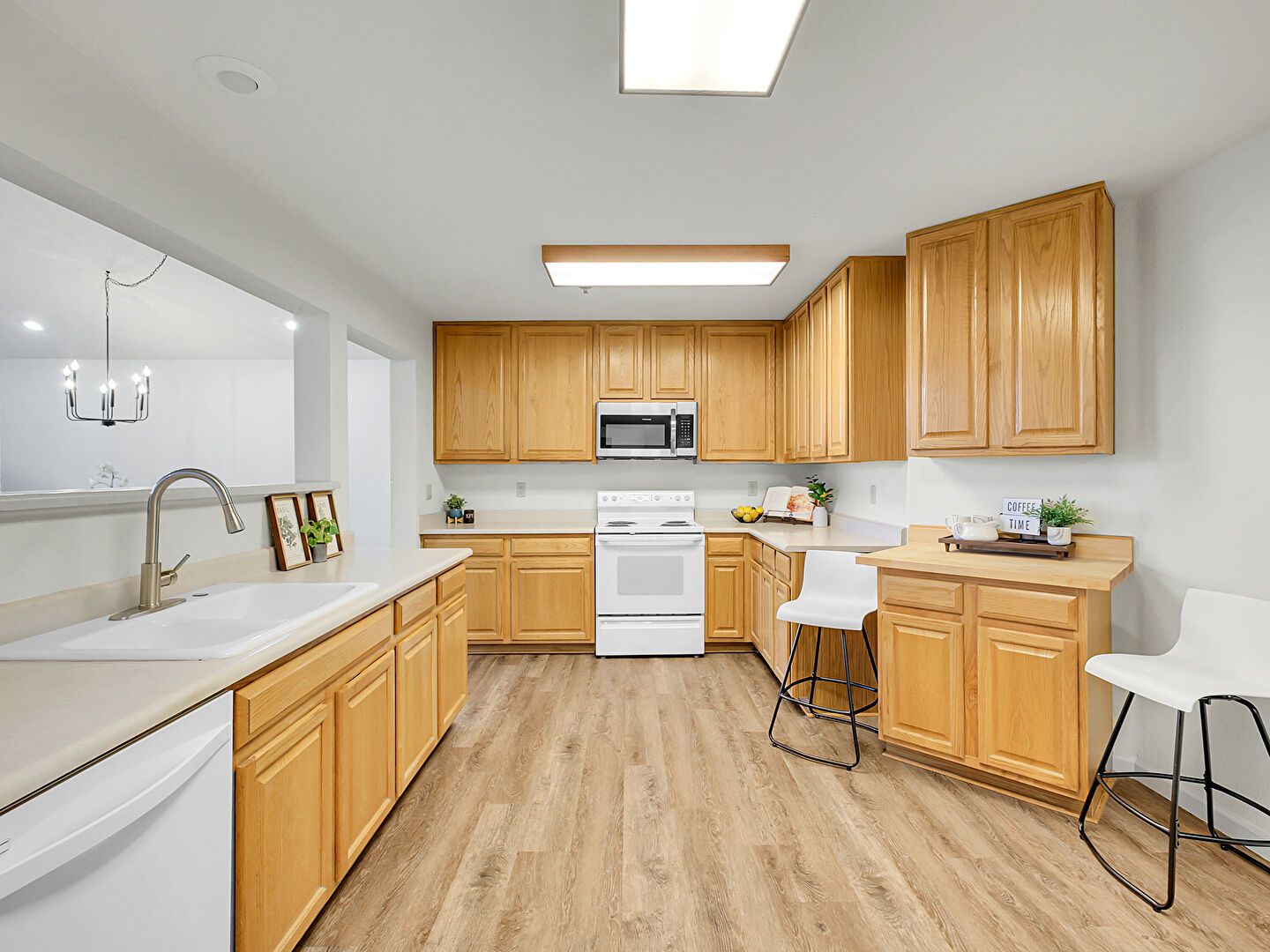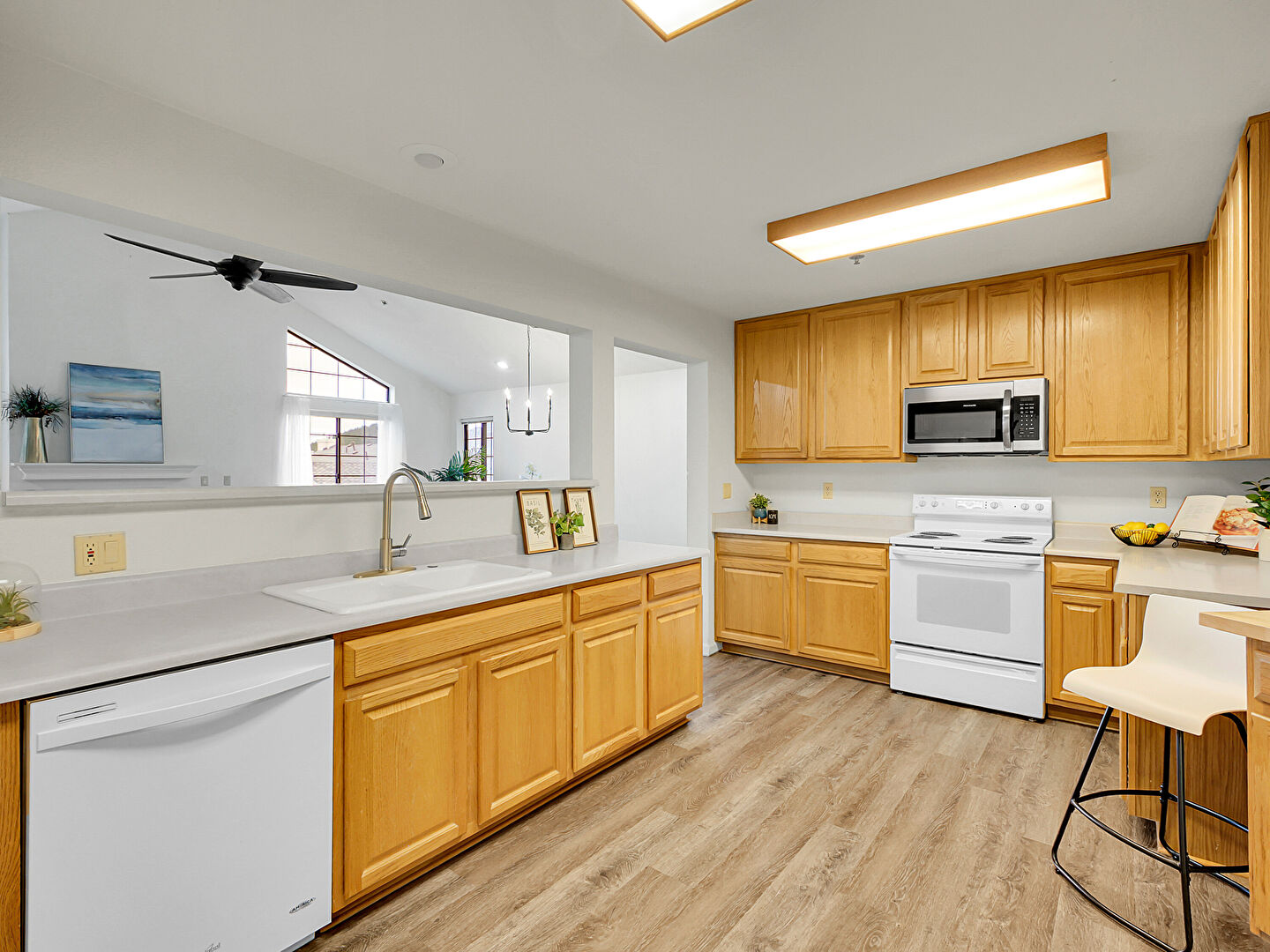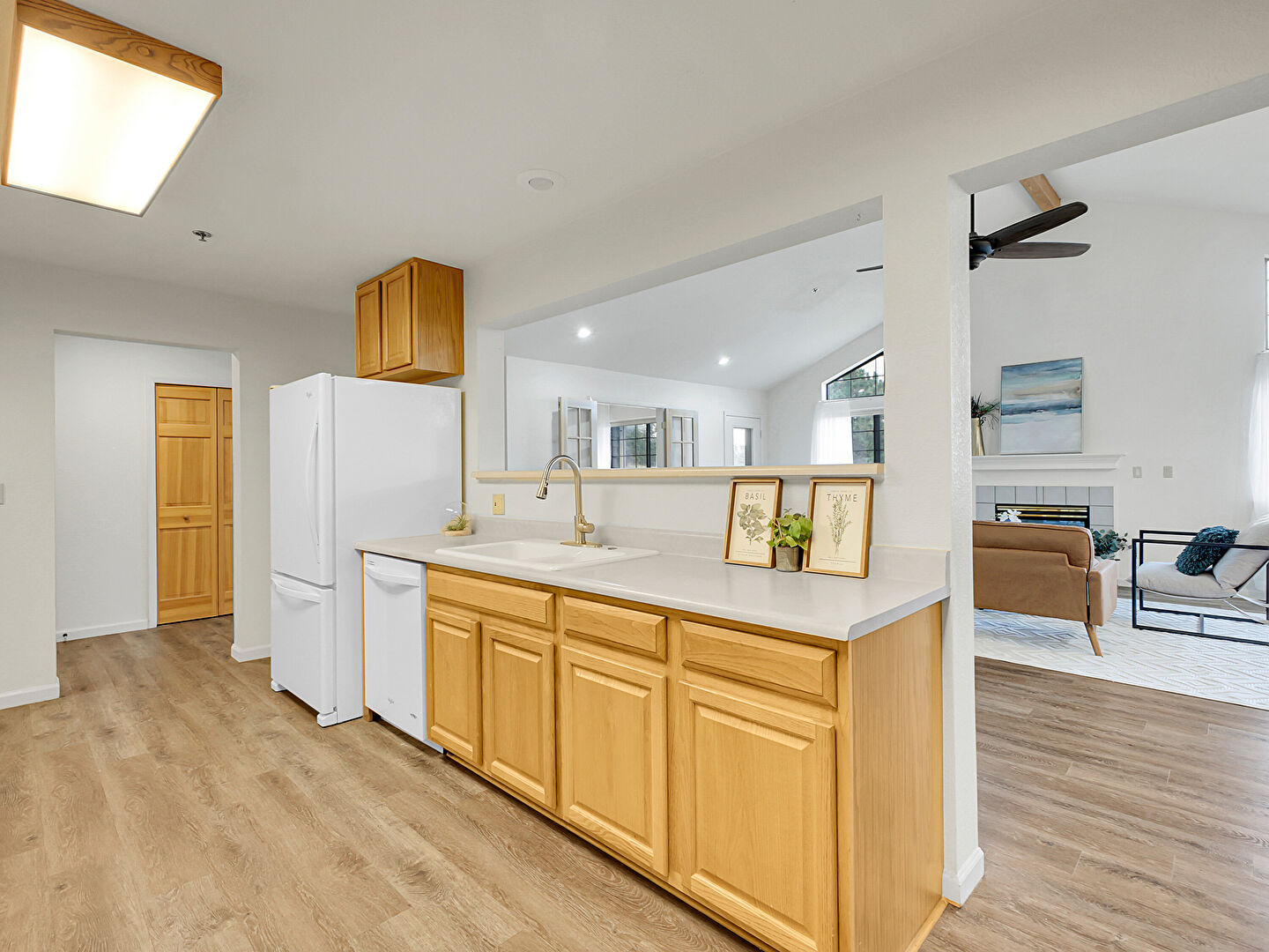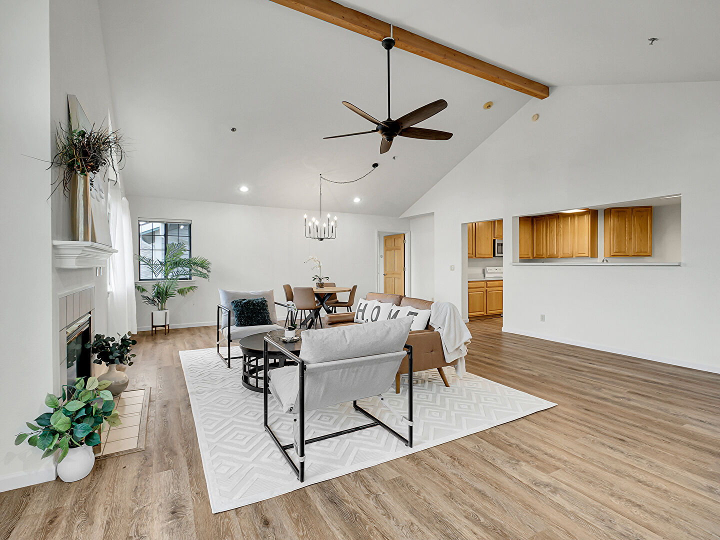 Baseboards Wall, Butcher Block Countertops, Ceiling Fan, Drywall, Fireplace, Kitchen Bar, Kitchen Peninsula, Natural Light, Notable Chandelier, Opens To Living Area, Pass Through Window, Pendant Lighting, Raised Cabinets, Recessed Lighting, Vaulted Ceiling, Wood Finish Floor, Pass Through Window, Wood Finish Floor