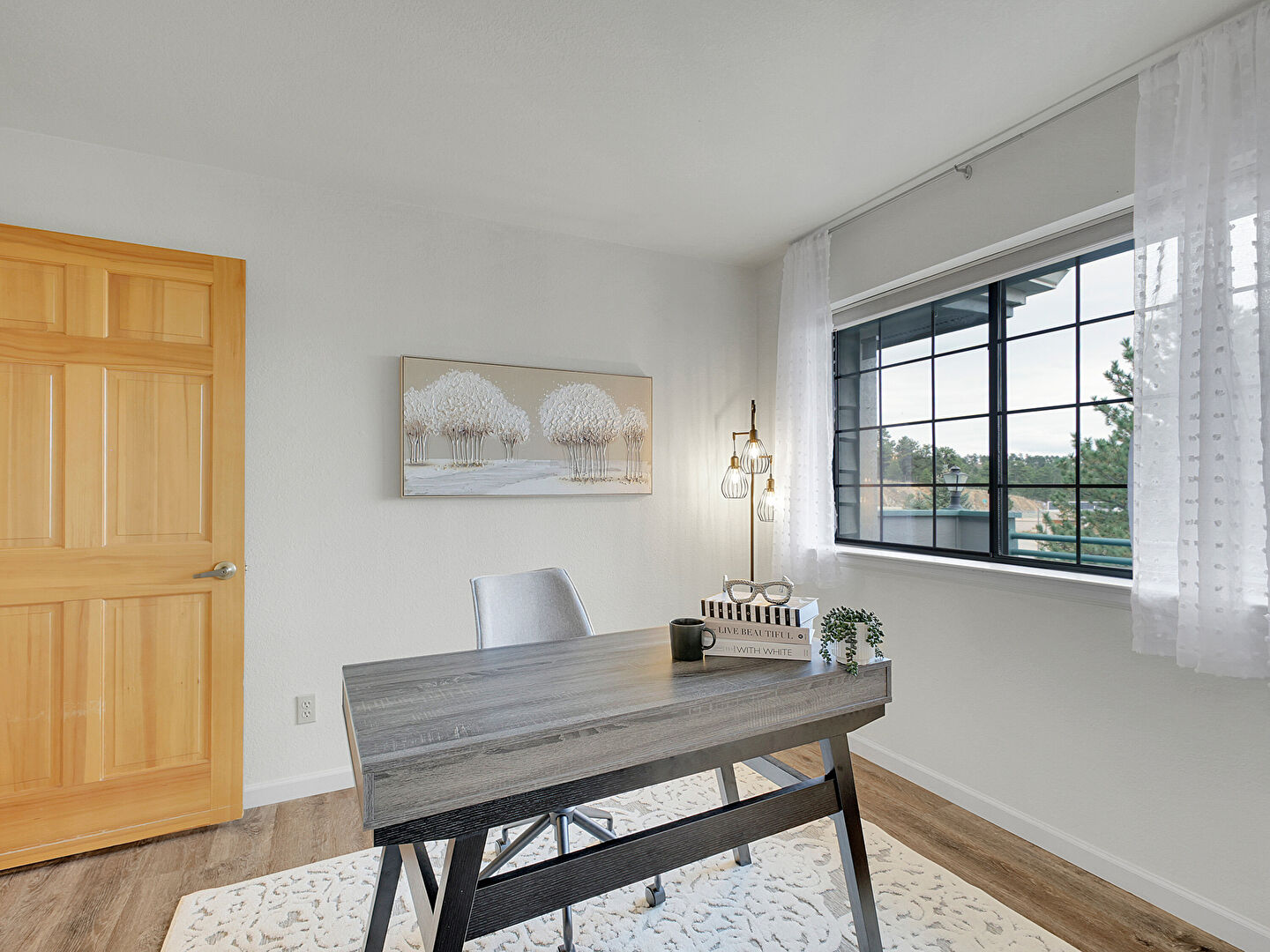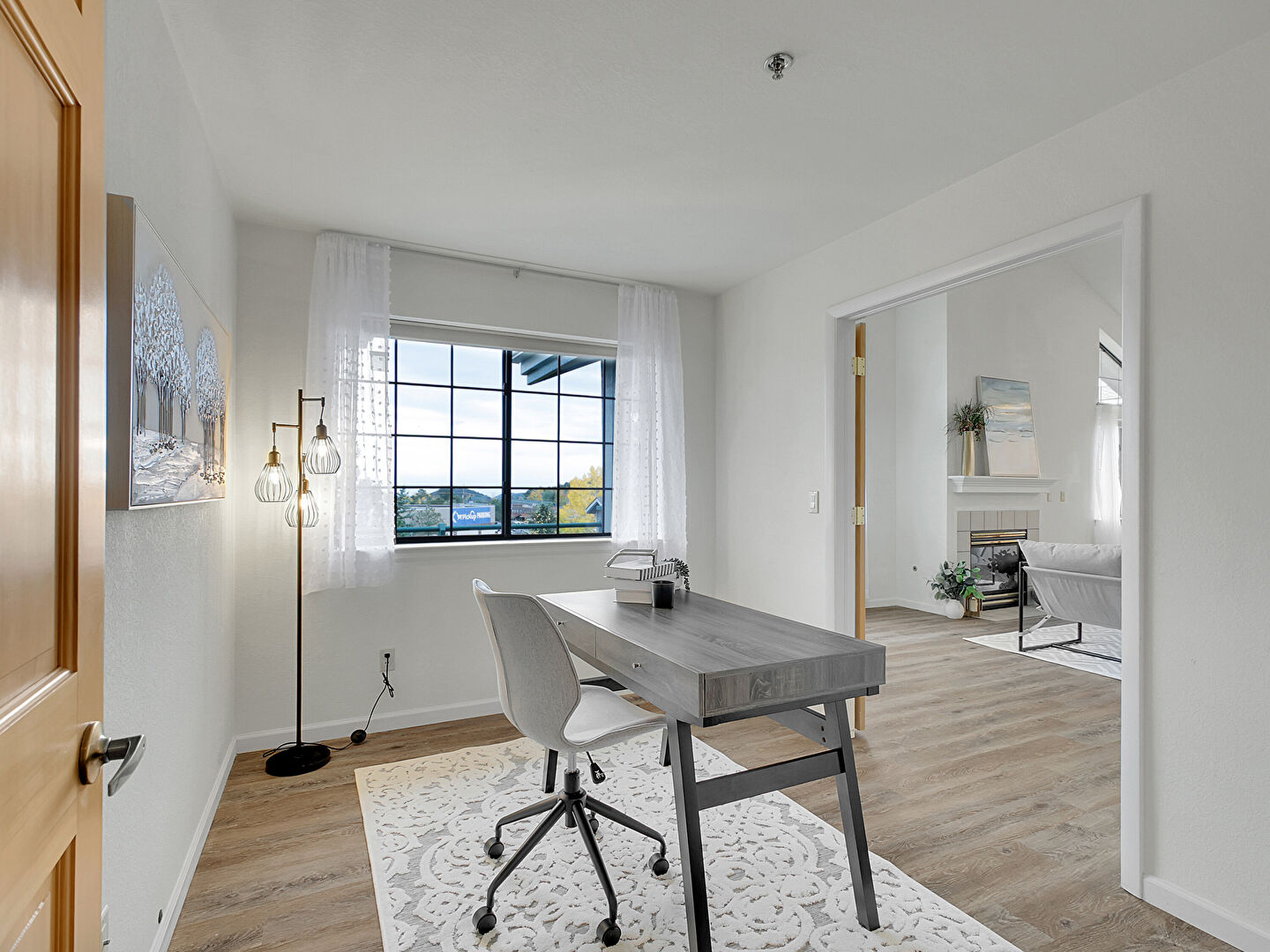 Baseboards Wall, Drywall, Fireplace, Natural Light, Office Area, Pendent Fire Sprinkler, Wood Finish Floor, Baseboards Wall, Natural Light