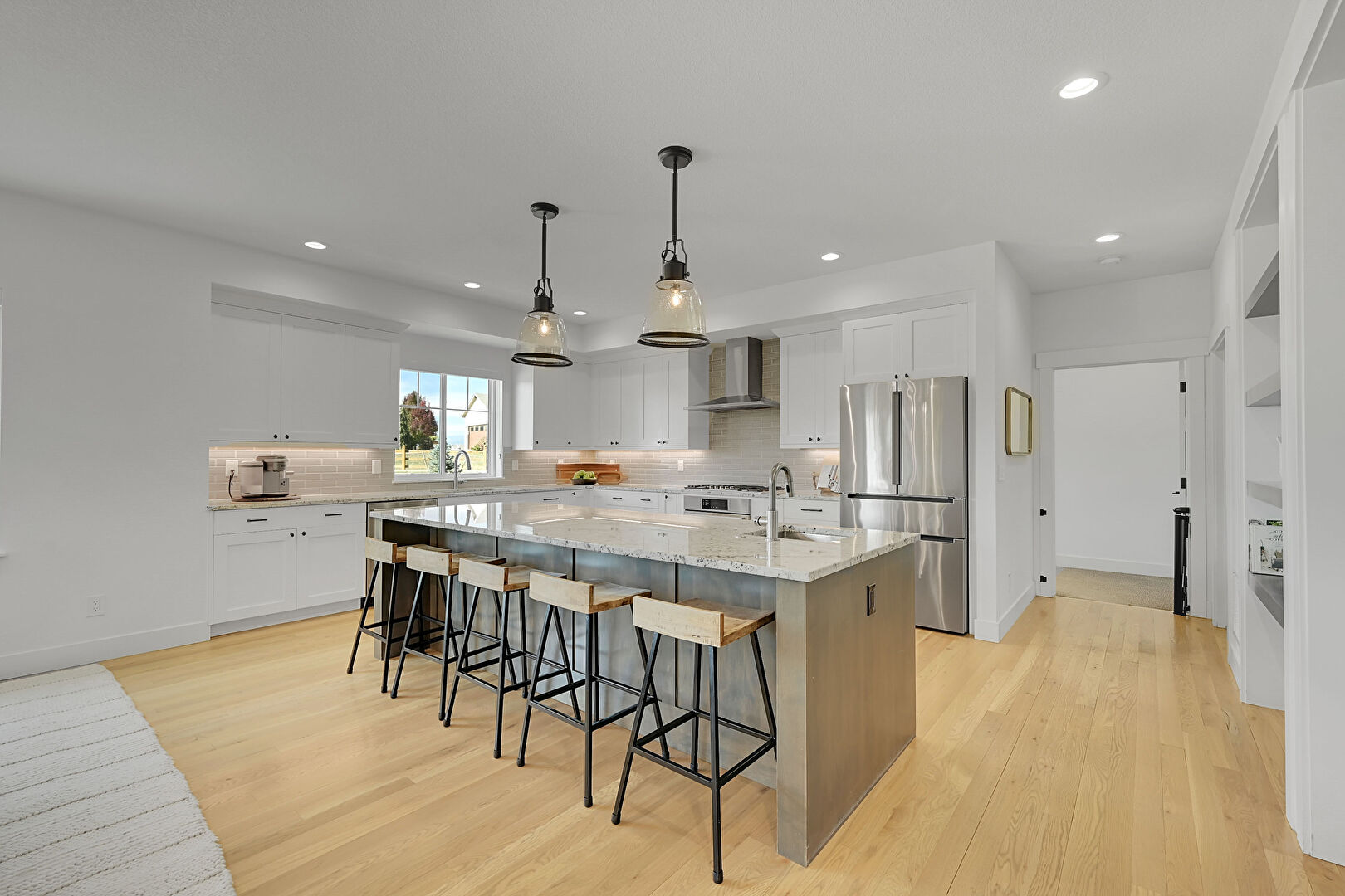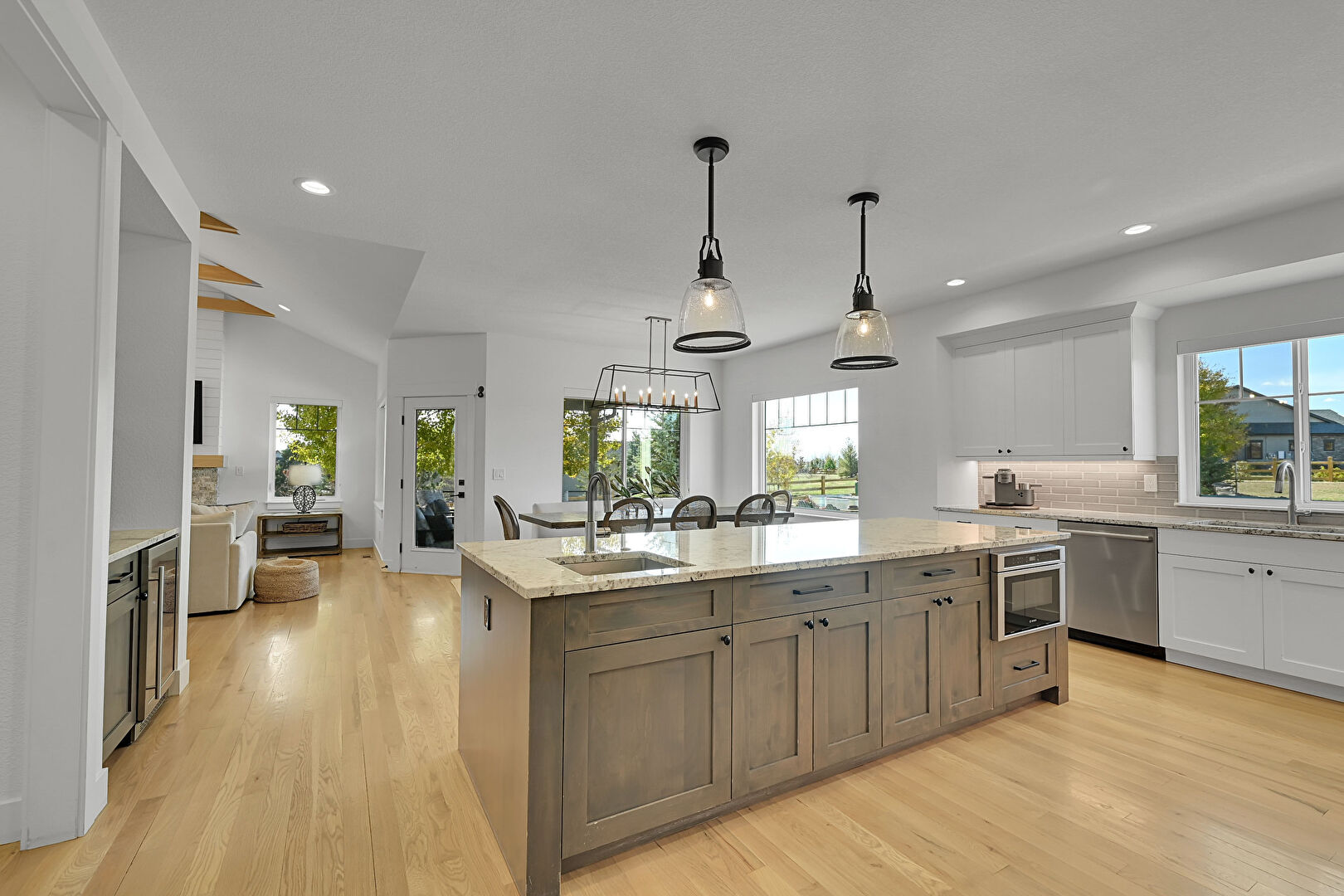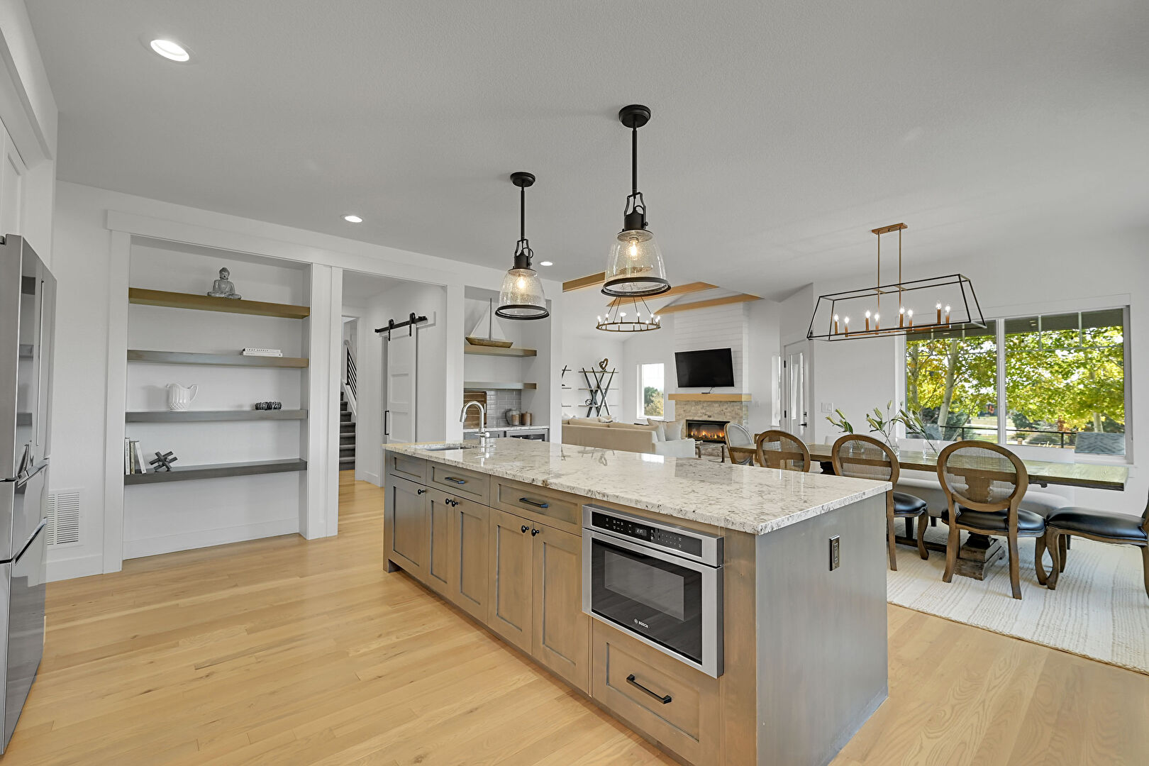 Barn Door, Baseboards Wall, Crown Molding Cabinets, Drywall, Fireplace, Kitchen Bar, Kitchen Island, L Shaped Kitchen, Medium Brown Cabinets, Natural Light, Notable Chandelier, Open Shelves, Opens To Living Area, Pendant Lighting, Recessed Lighting, Shaker Cabinets, Stone Countertops, Vent, Wine Cooler, Wood Finish Floor, Drywall, Kitchen Bar, Natural Light, Recessed Lighting