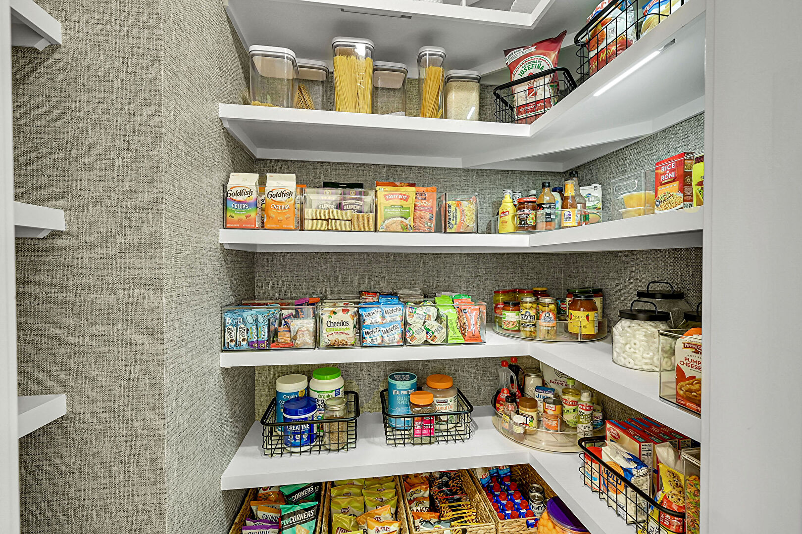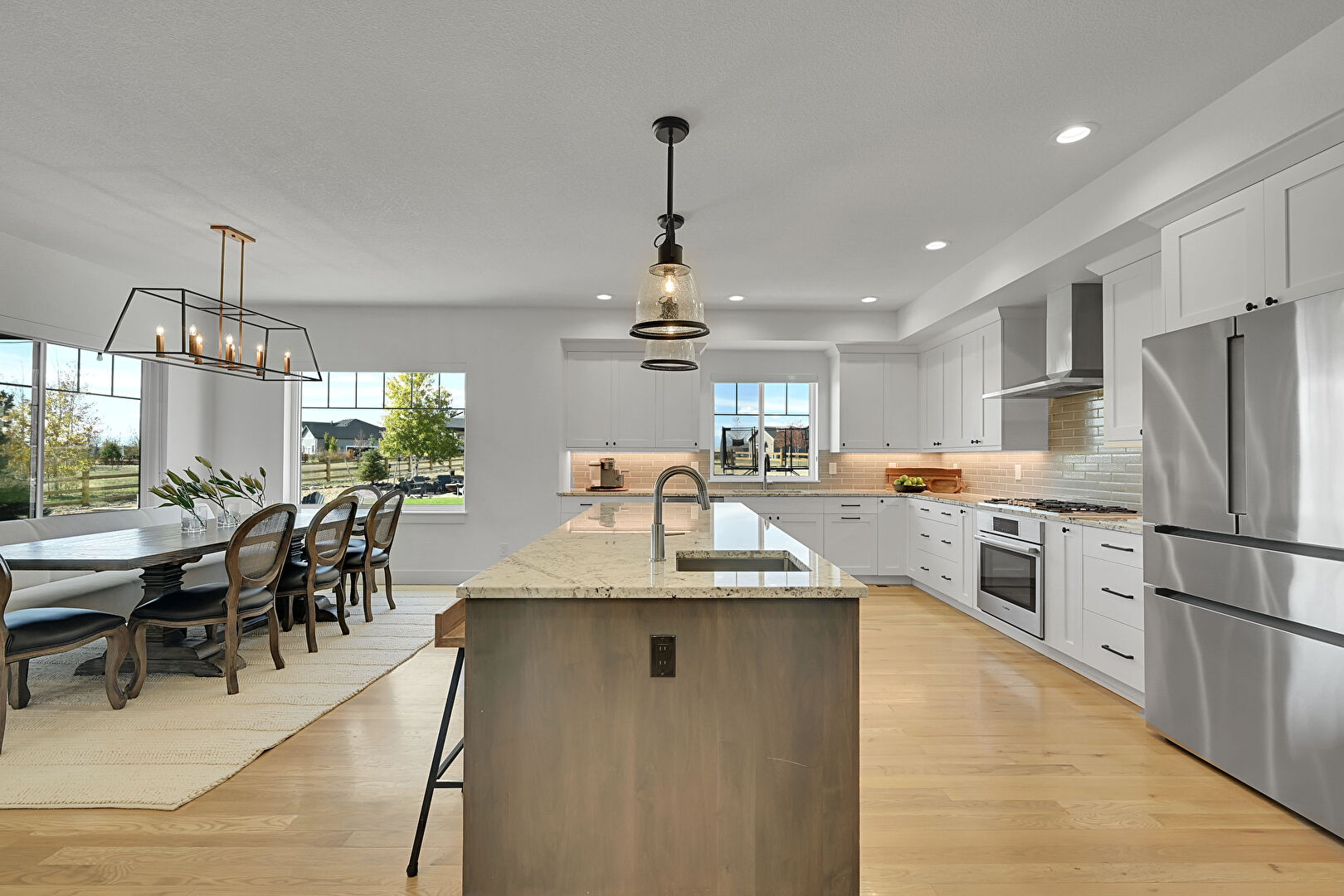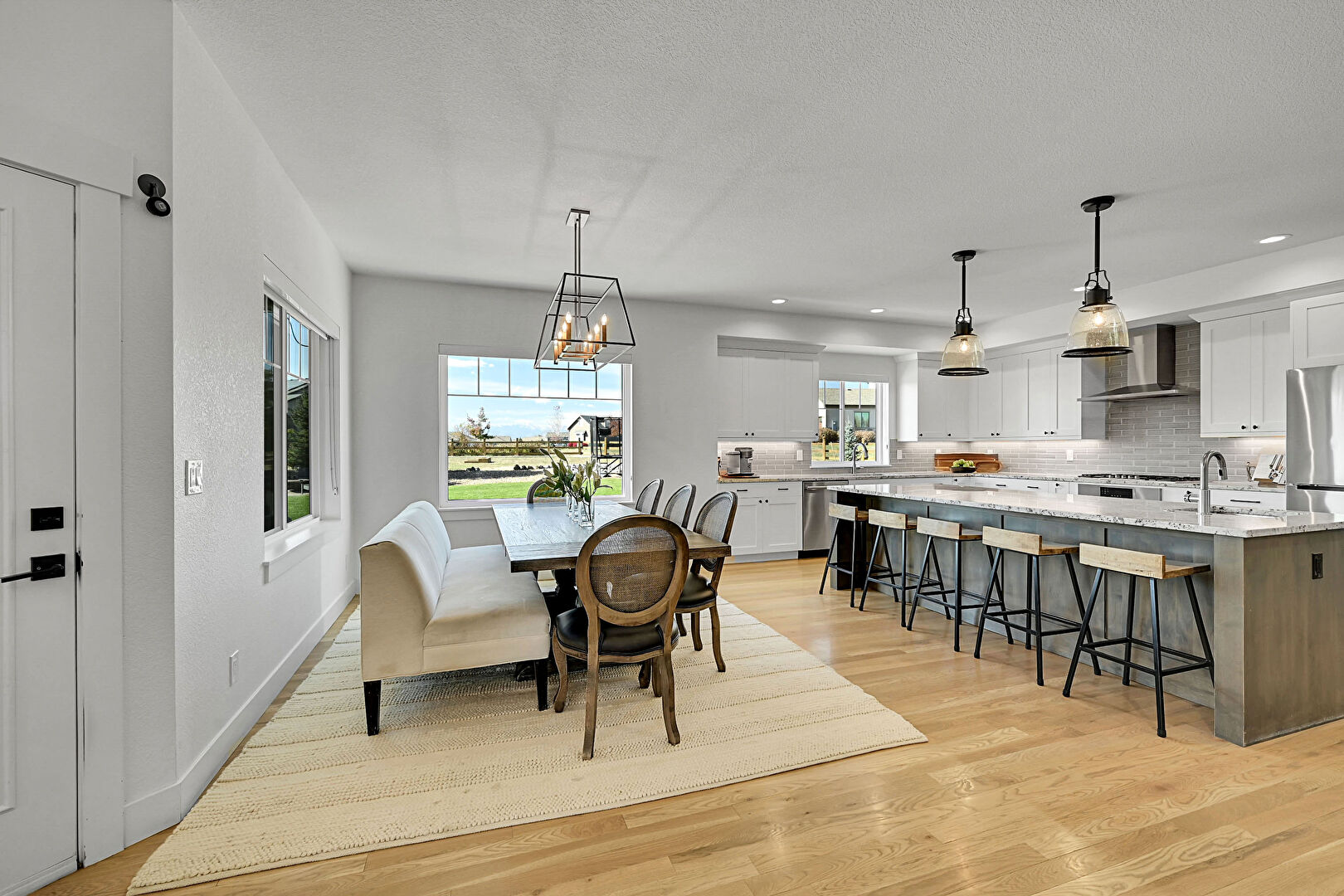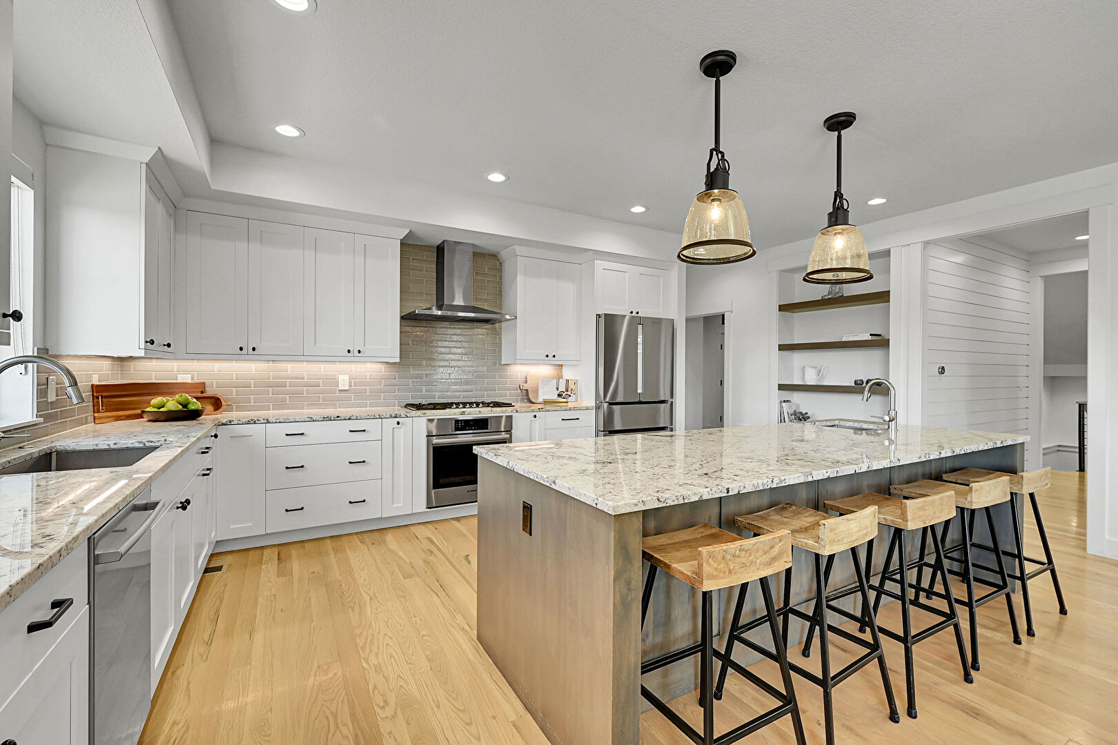 Barn Door, Baseboards Wall, Crown Molding Cabinets, Drywall, Fireplace, Kitchen Bar, Kitchen Island, L Shaped Kitchen, Medium Brown Cabinets, Natural Light, Notable Chandelier, Open Shelves, Opens To Living Area, Pendant Lighting, Recessed Lighting, Shaker Cabinets, Stone Countertops, Vent, Wine Cooler, Wood Finish Floor, Drywall, Kitchen Bar, Natural Light, Recessed Lighting
